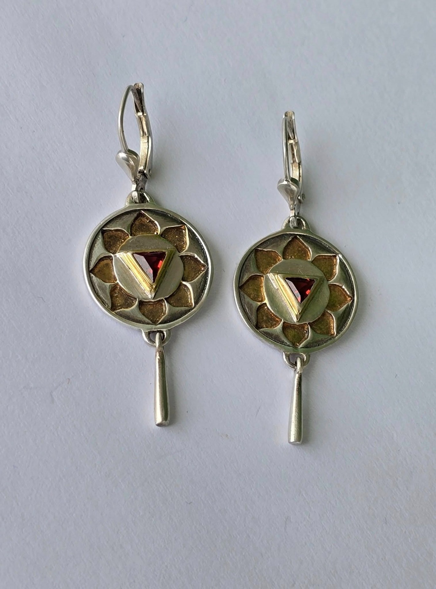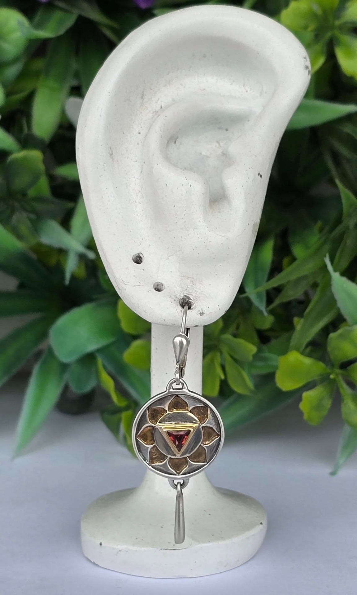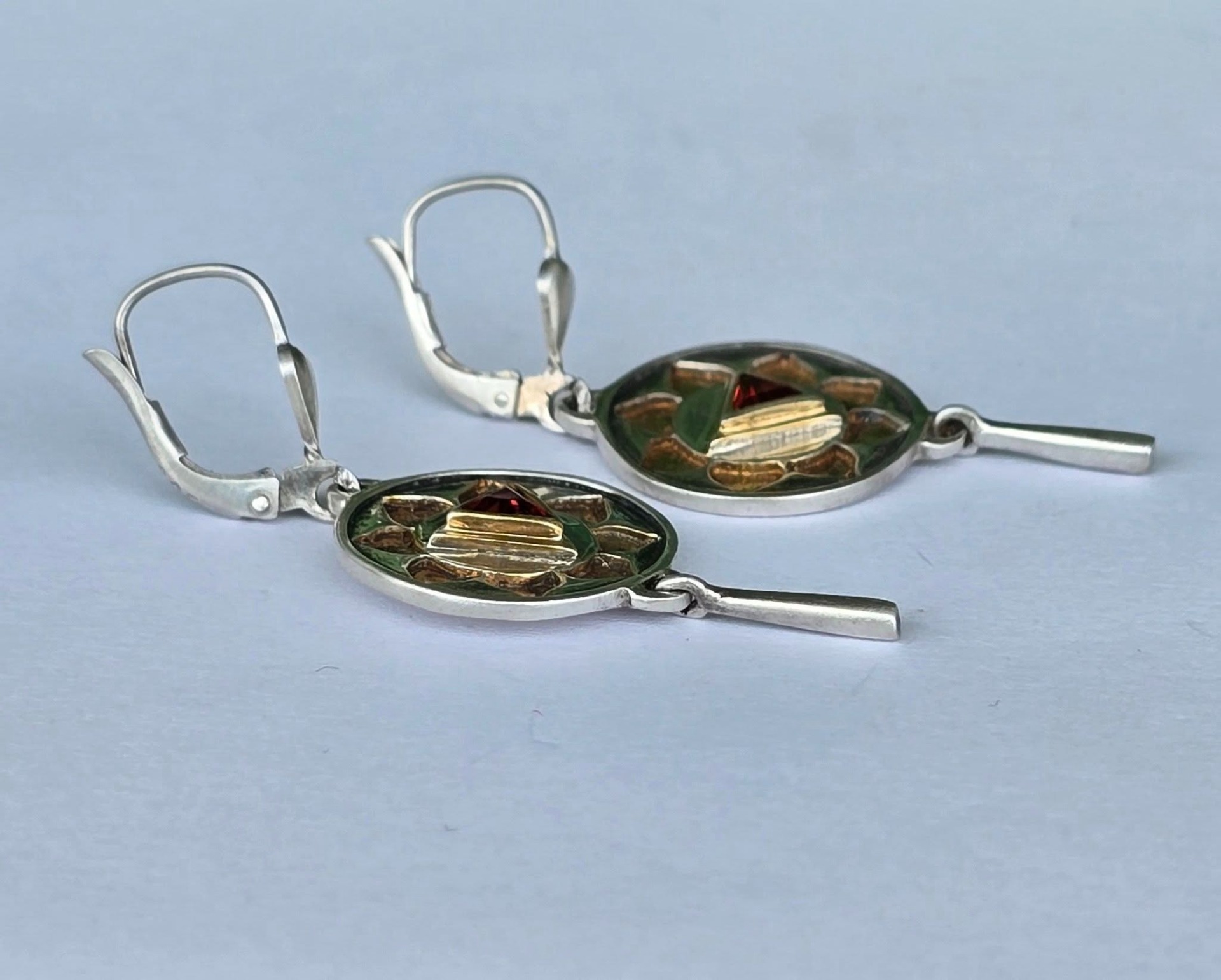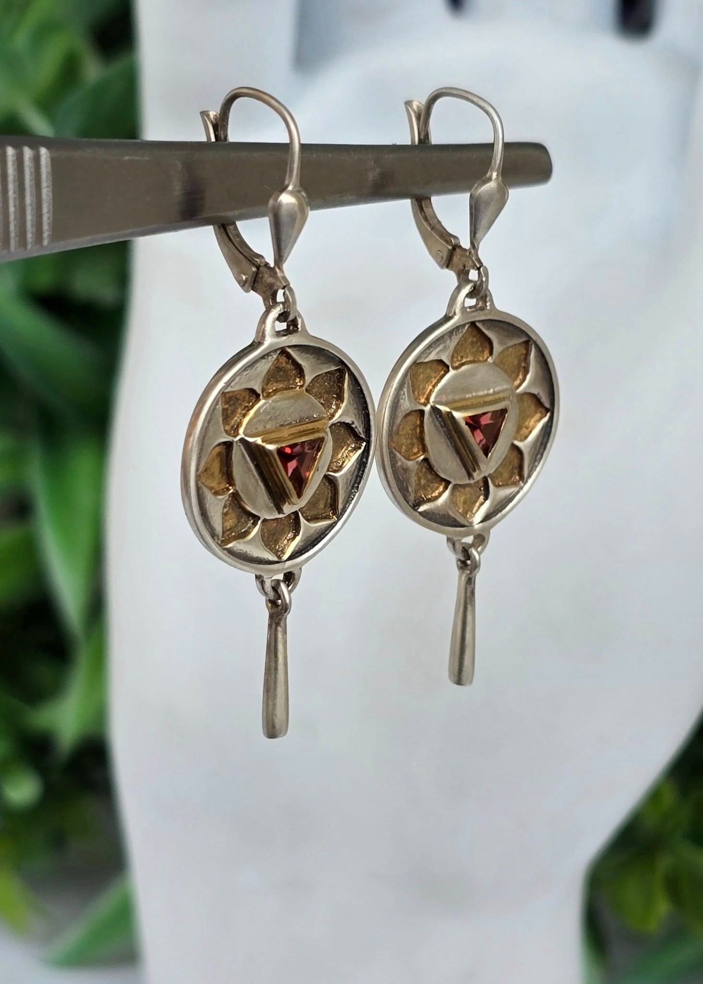 Cercei vechi de tip "Mandala", din argint și argint aurit, cu granate naturale, manufactură deosebită.