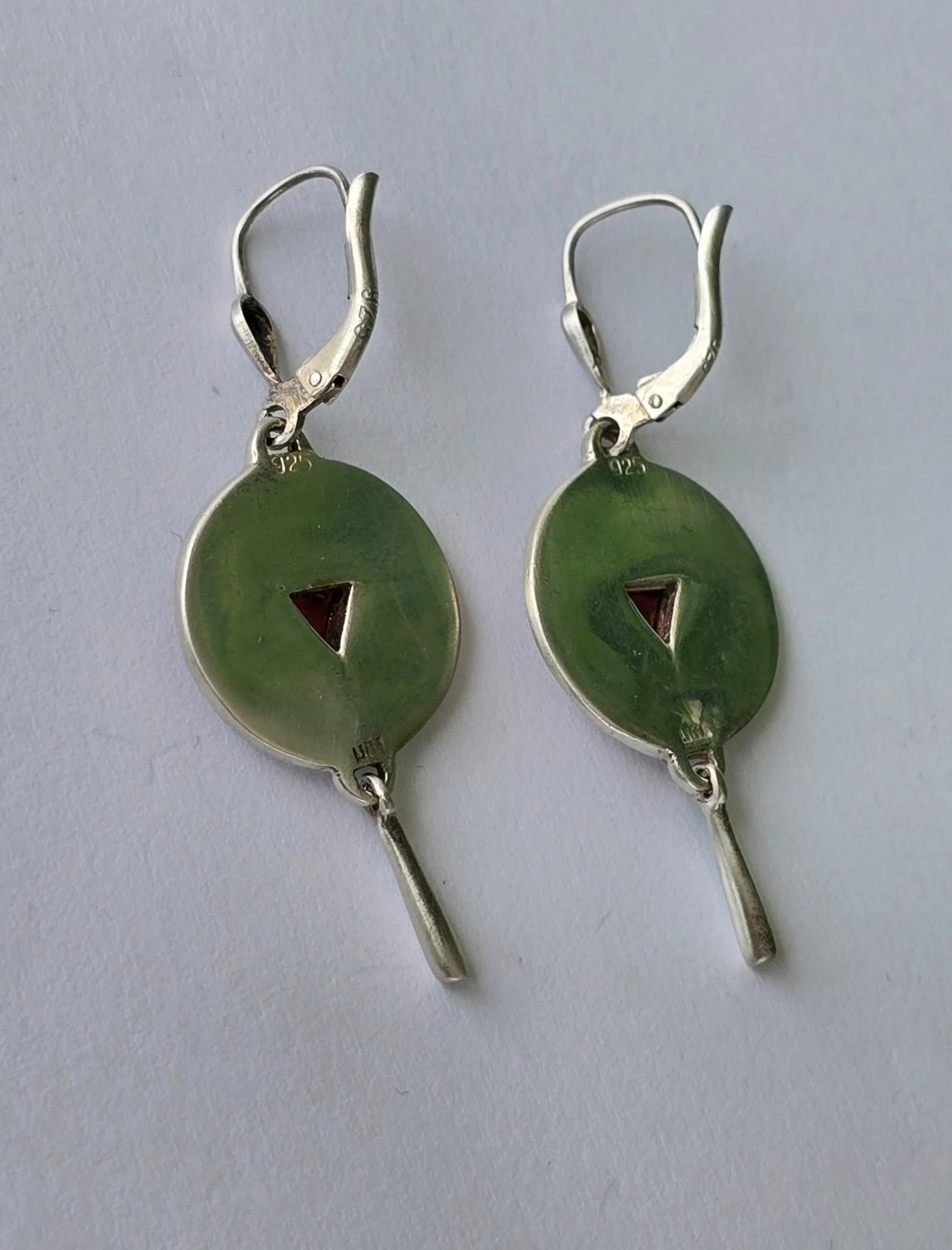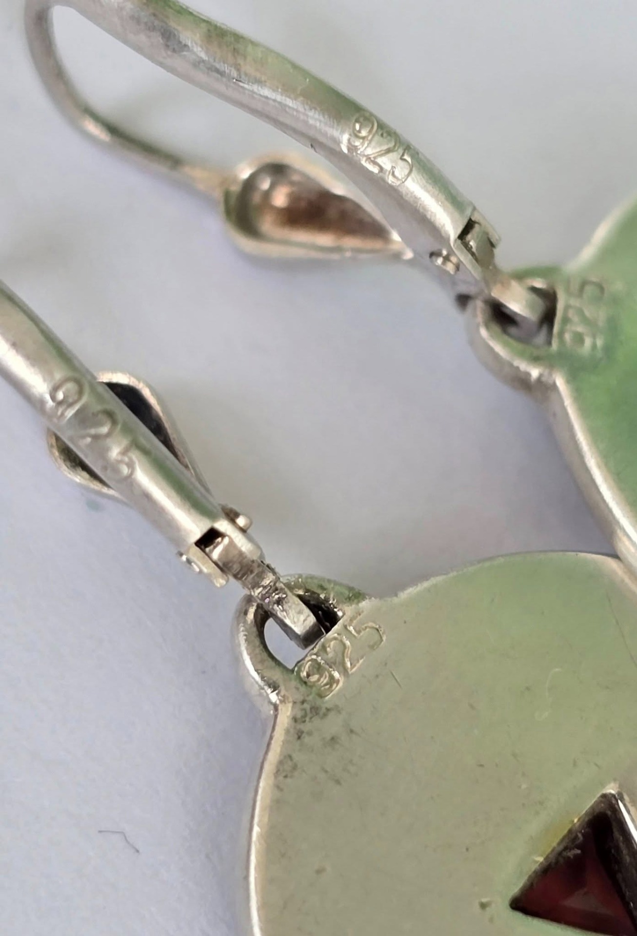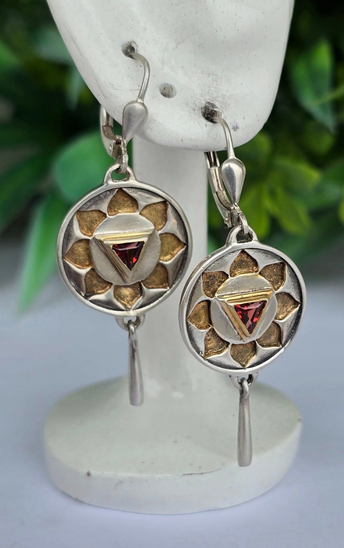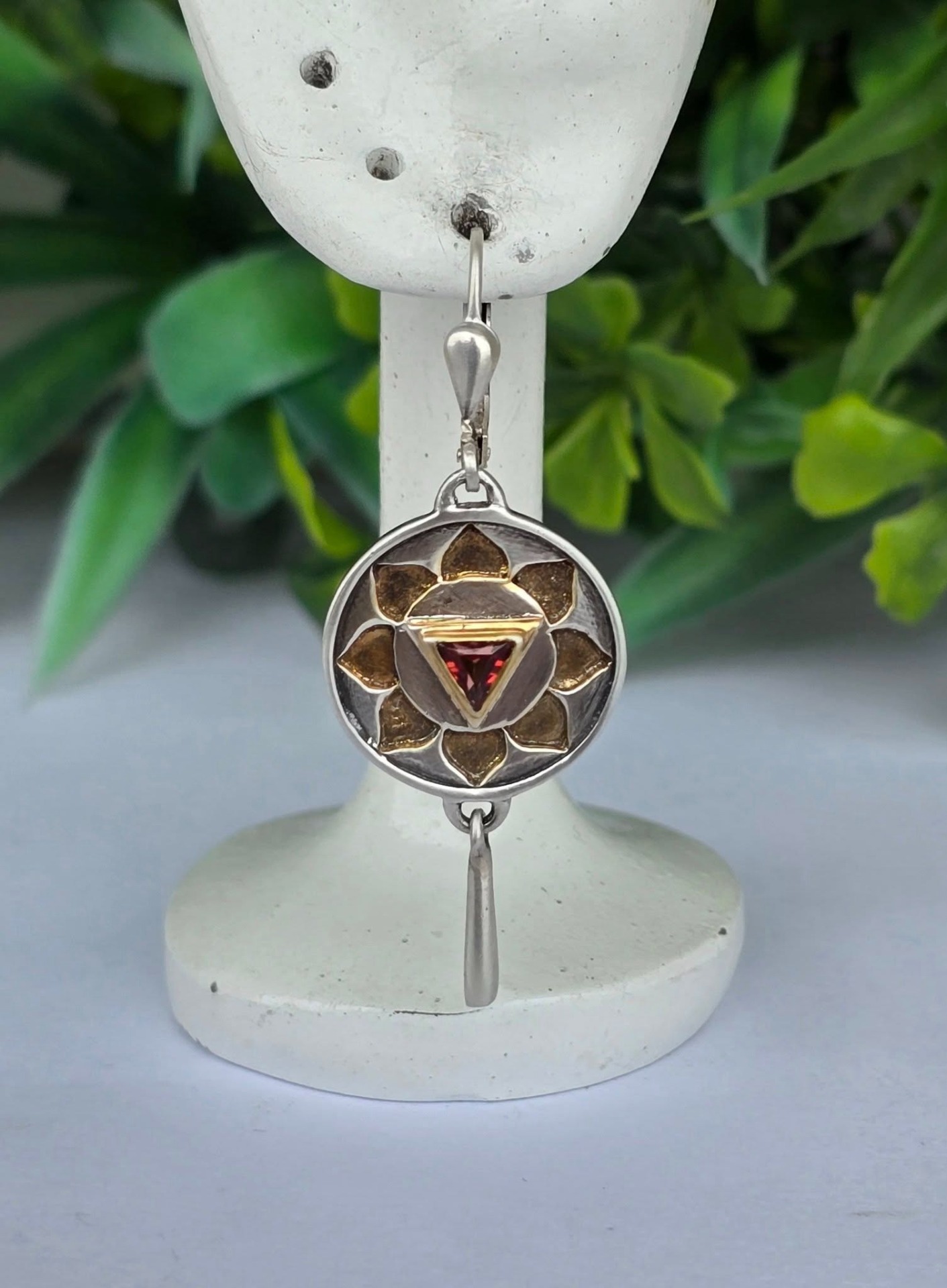 Cercei vechi de tip "Mandala", din argint și argint aurit, cu granate naturale, manufactură deosebită.