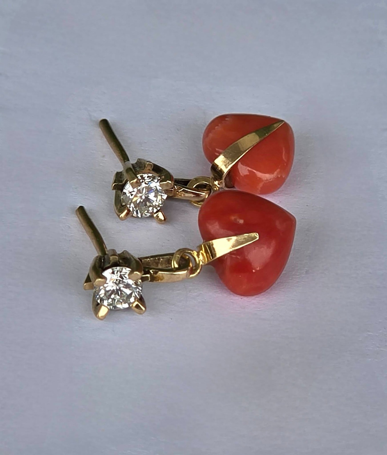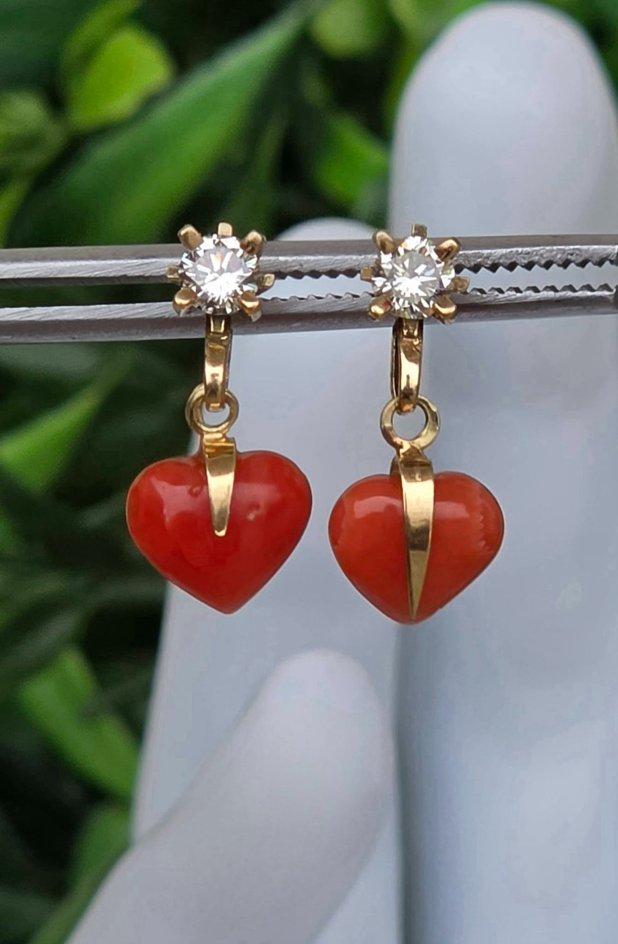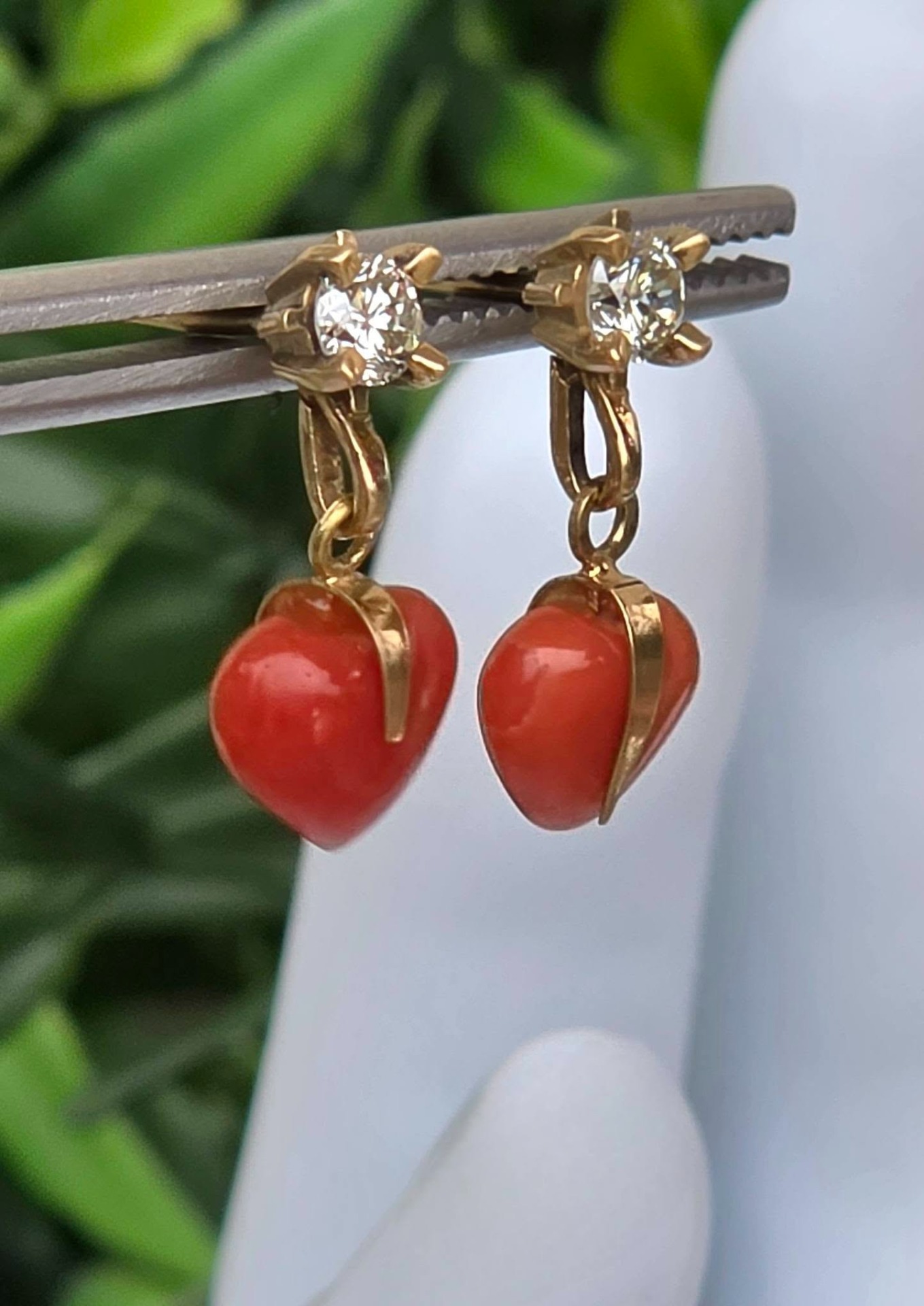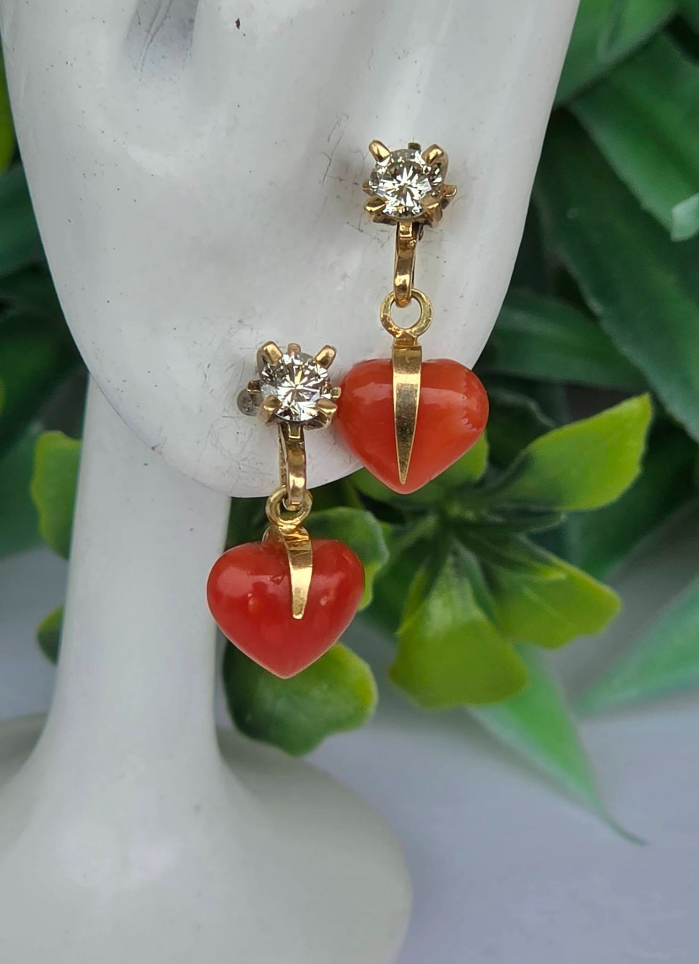 Cercei vechi delicați, din aur de 18K, cu inimioare din corali nobili naturali și 2 superbe diamante naturale (0.42ct) de calitate excelentă.