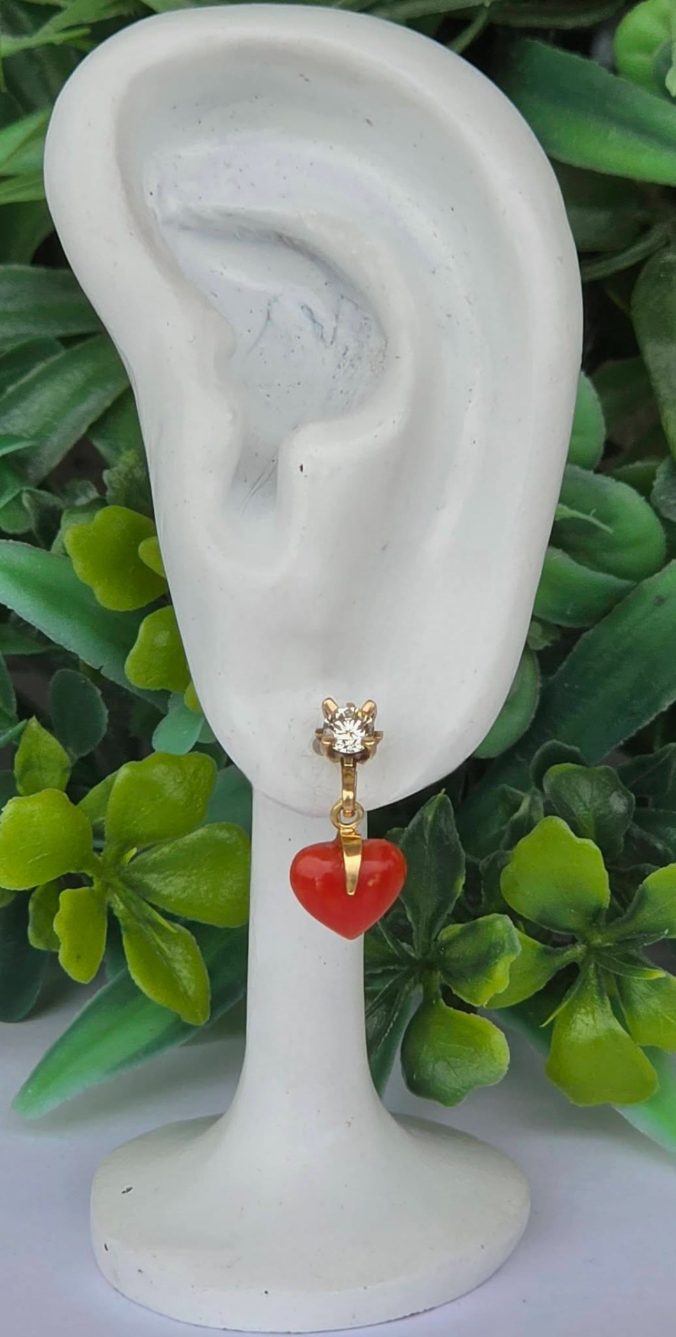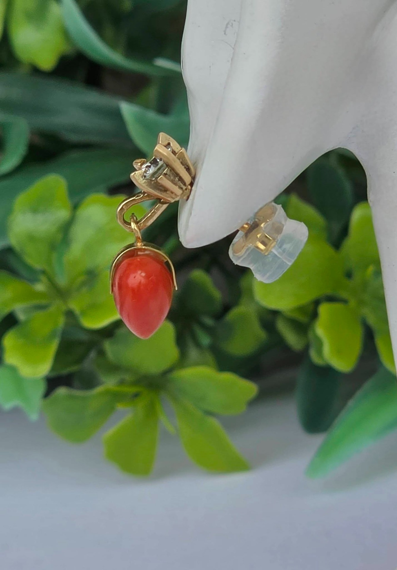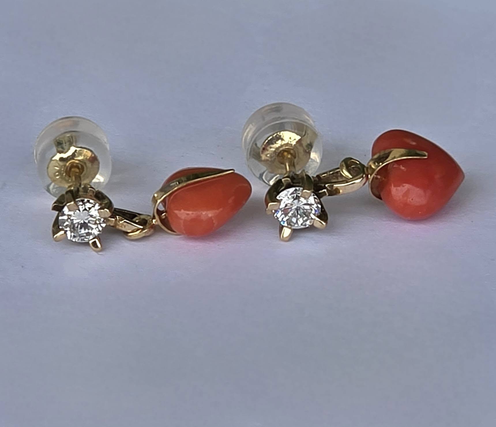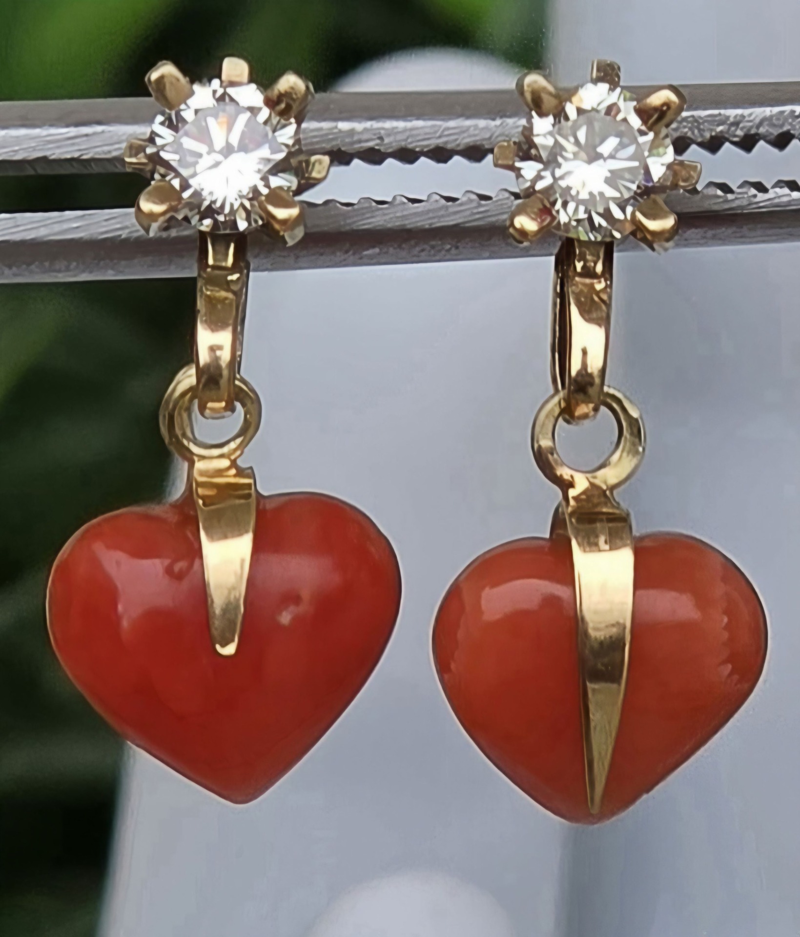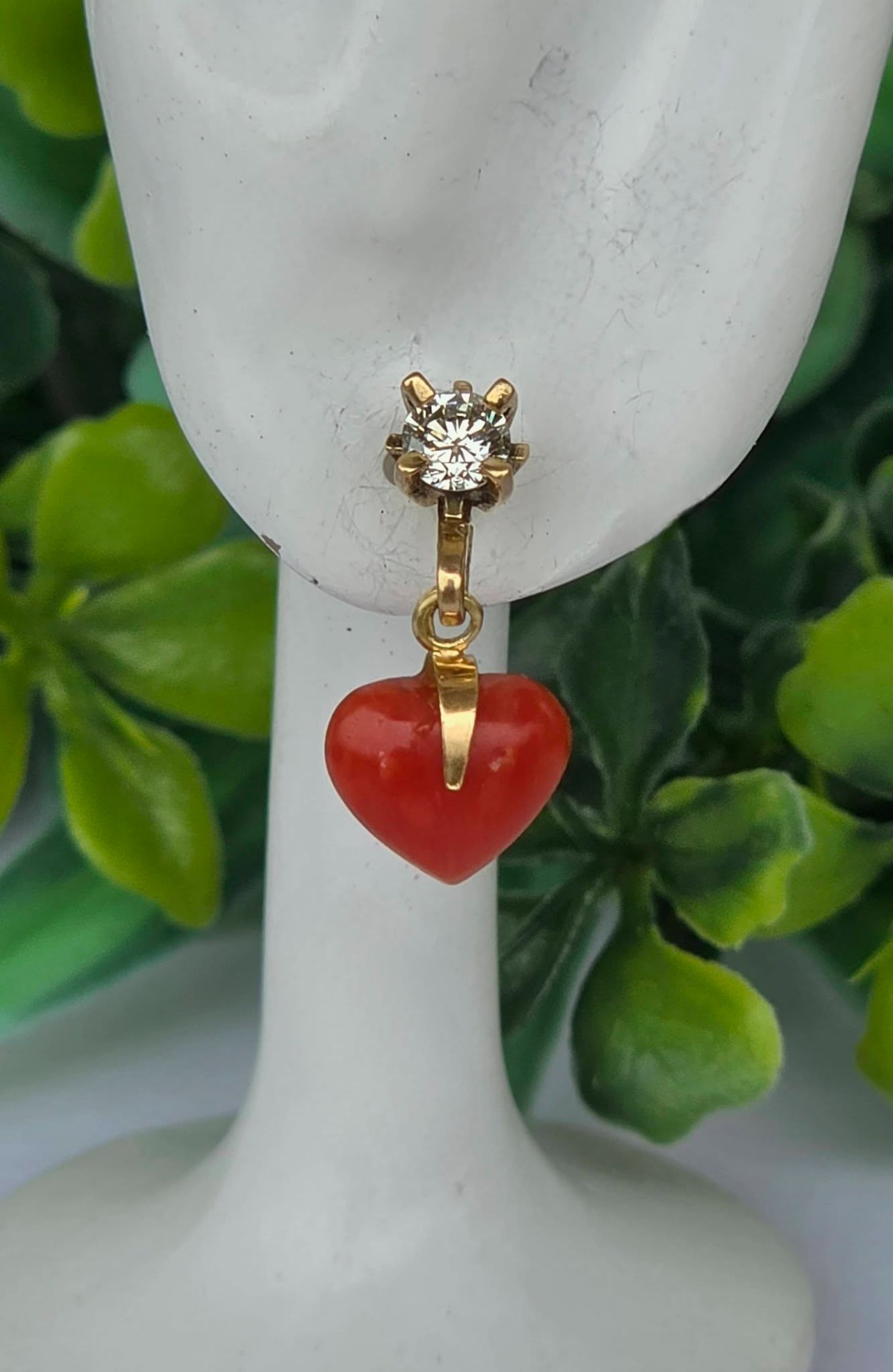 Cercei vechi delicați, din aur de 18K, cu inimioare din corali nobili naturali și 2 superbe diamante naturale (0.42ct) de calitate excelentă.