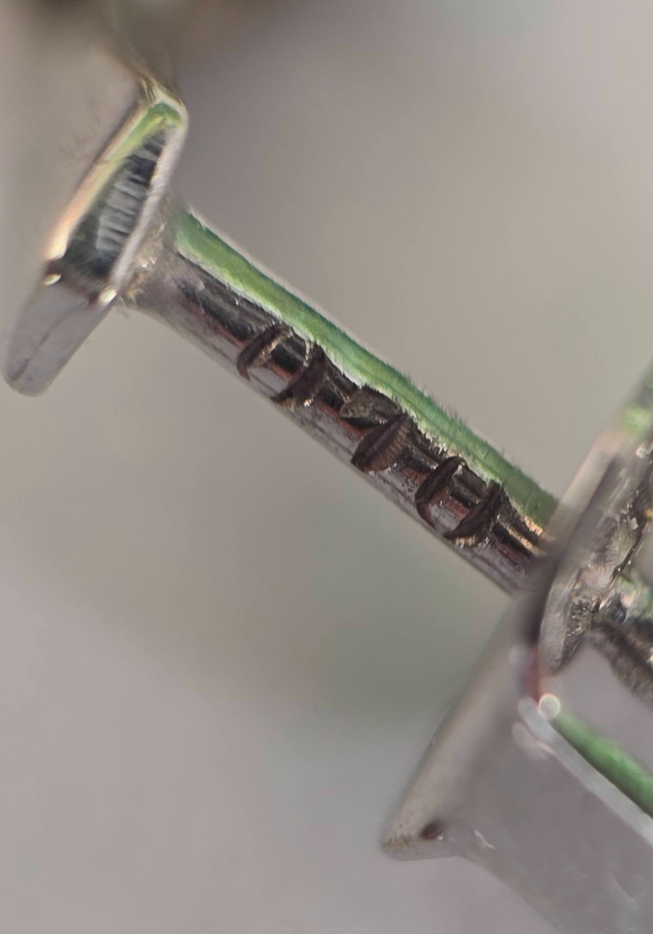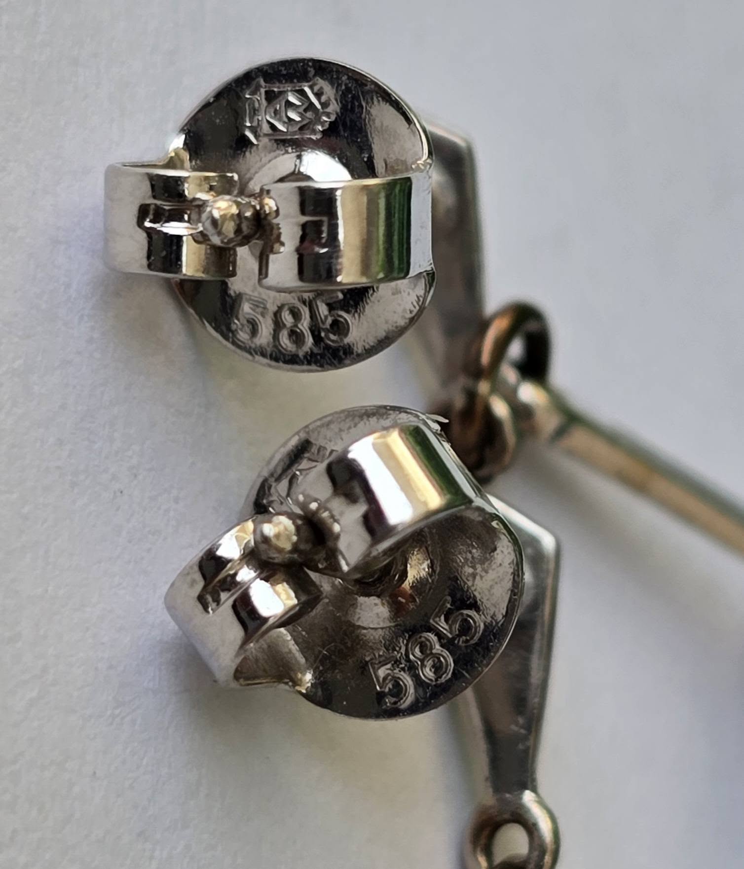 Prezintă marcaje 585 pentru puritate aur de 14K și marcaj "0.10" pentru caratajul diamantelor.
