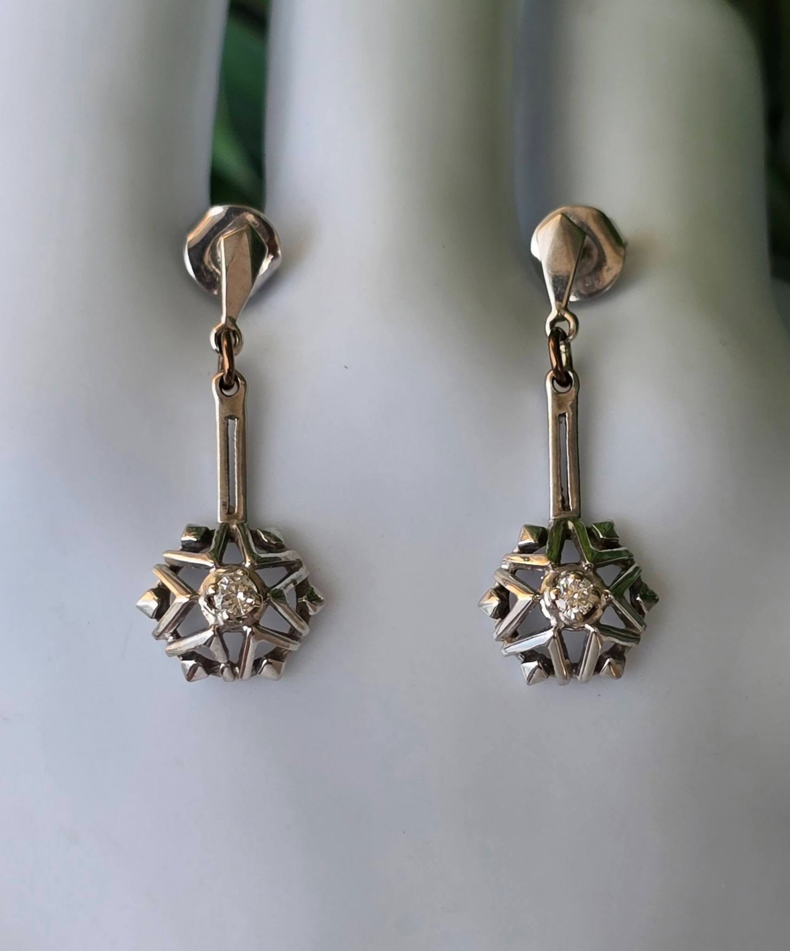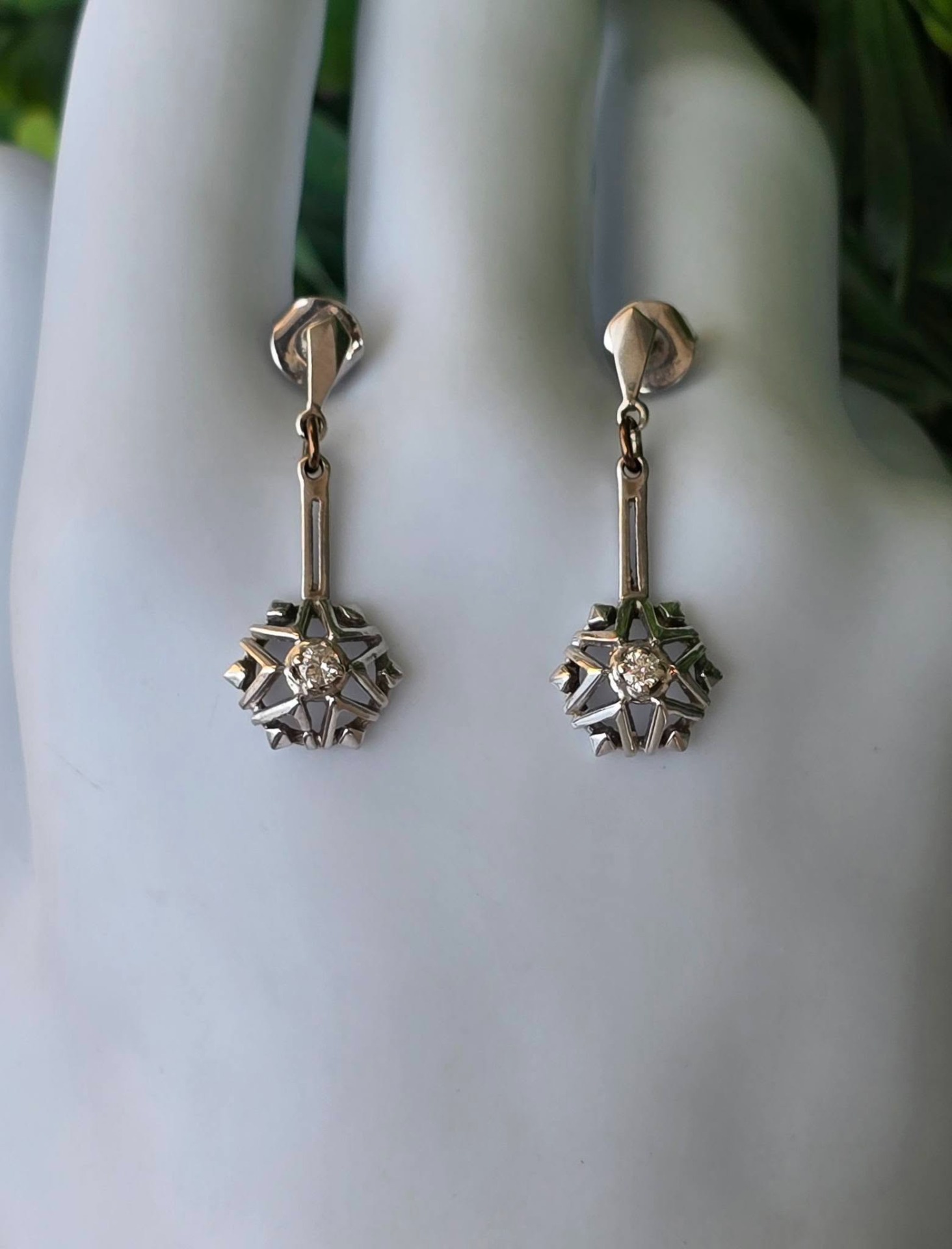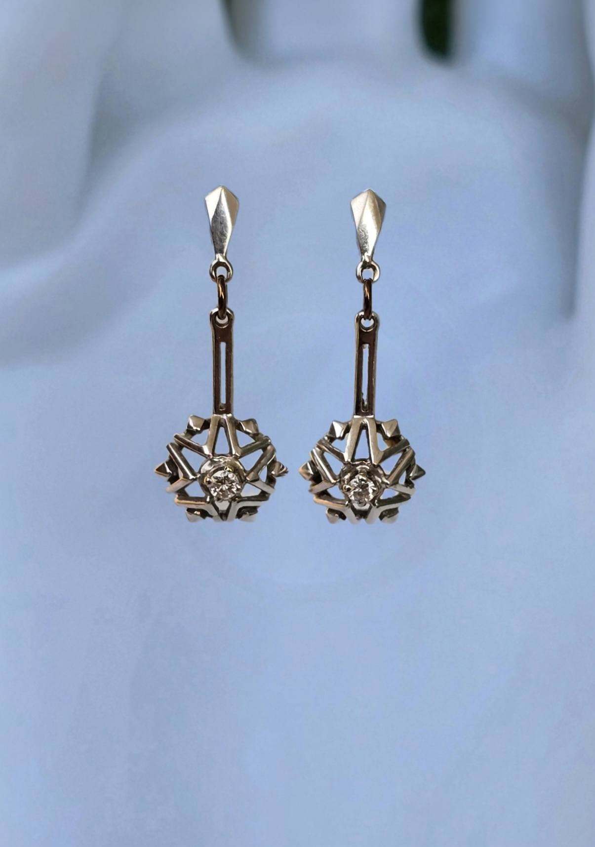 Cercei vechi deosebiți, din aur de 14K, cu 2 diamante naturale de calitate superioară.