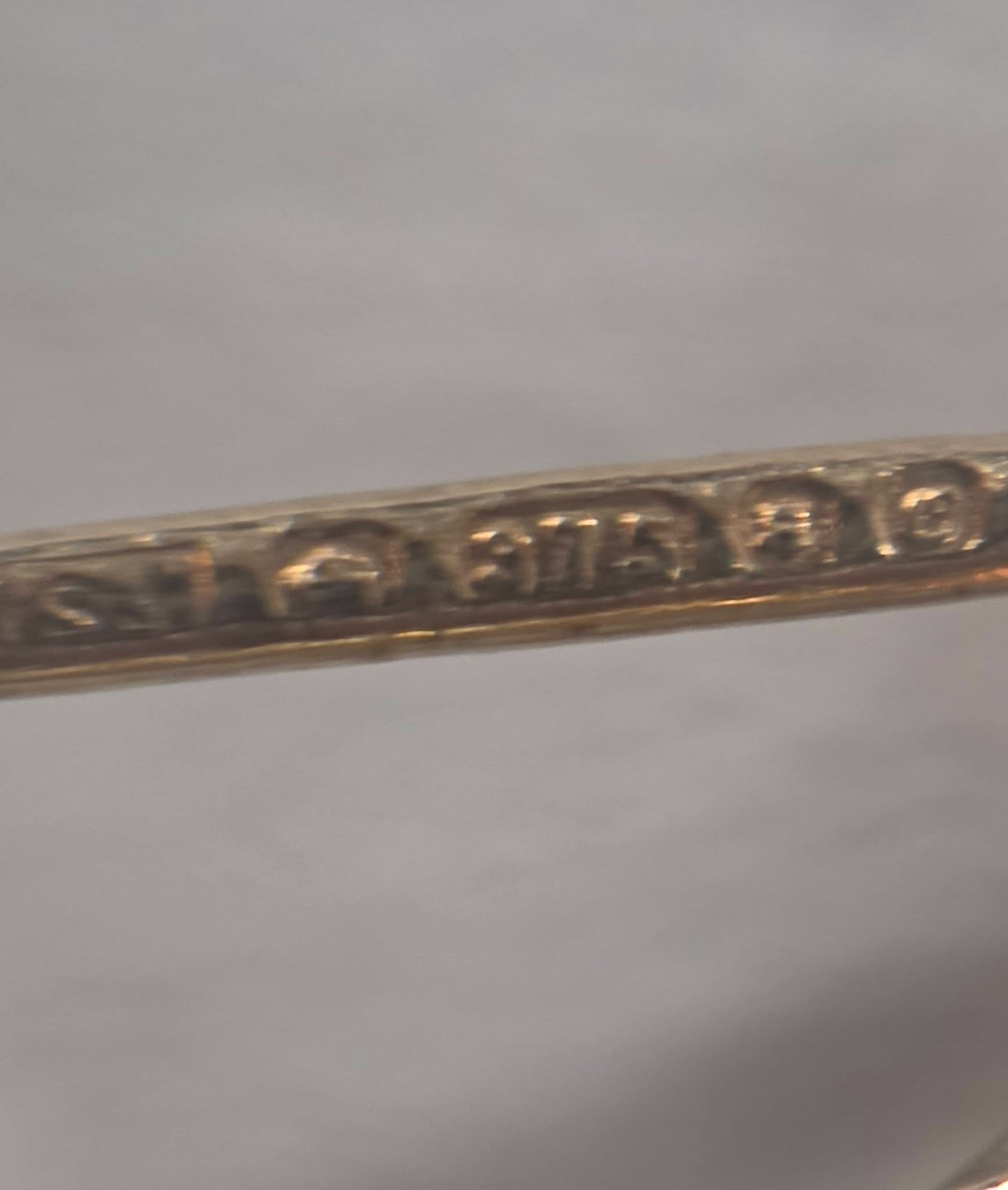 Prezintă marcaje 375 pentru puritate aur de 9K, poansoane specifice englezești de garanție, de oraș, literă de an și marcaj de meșter.