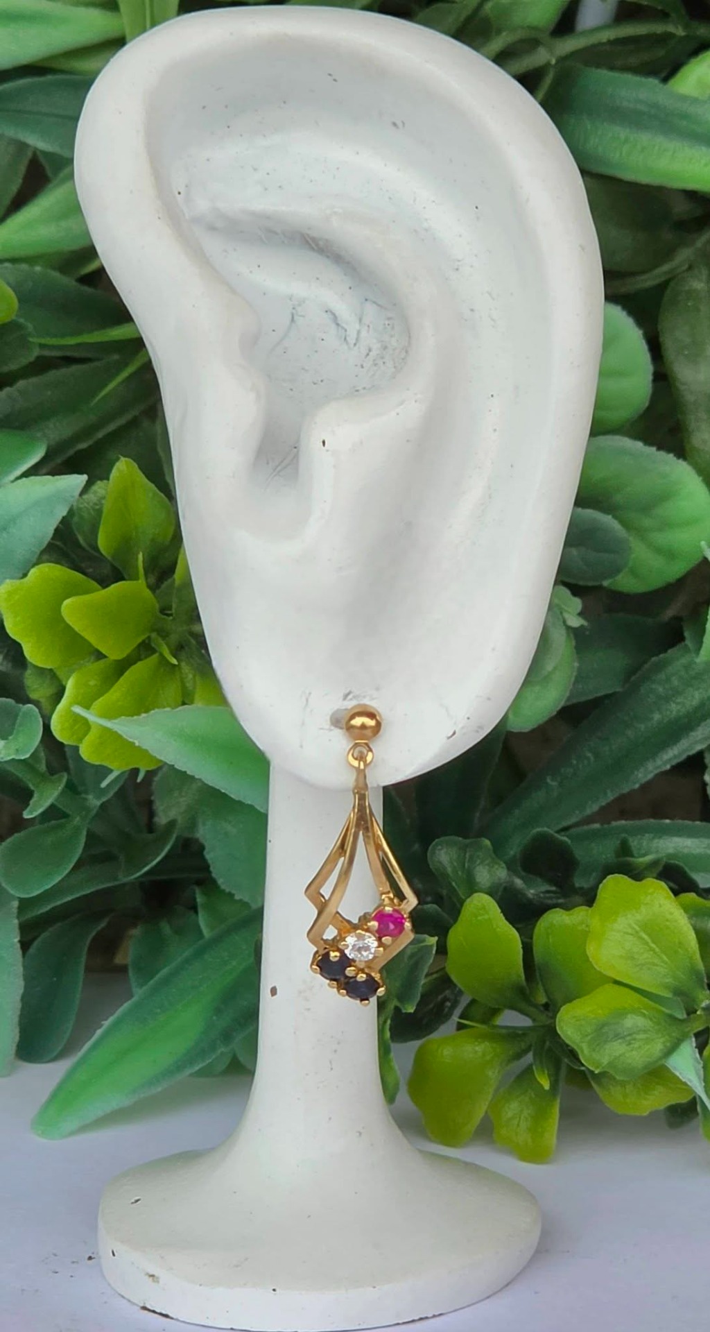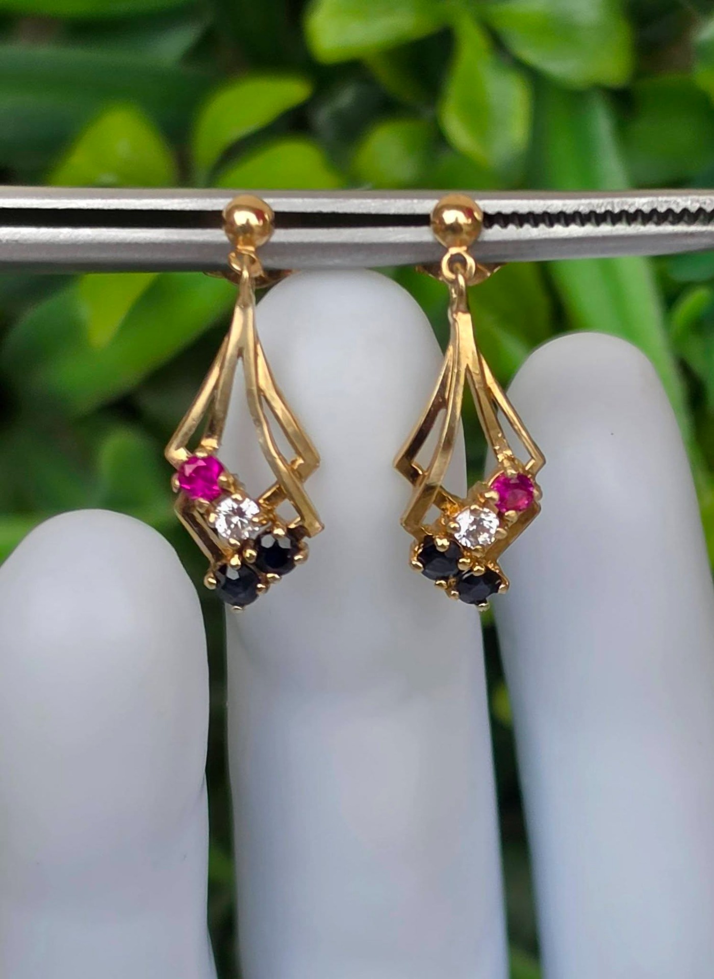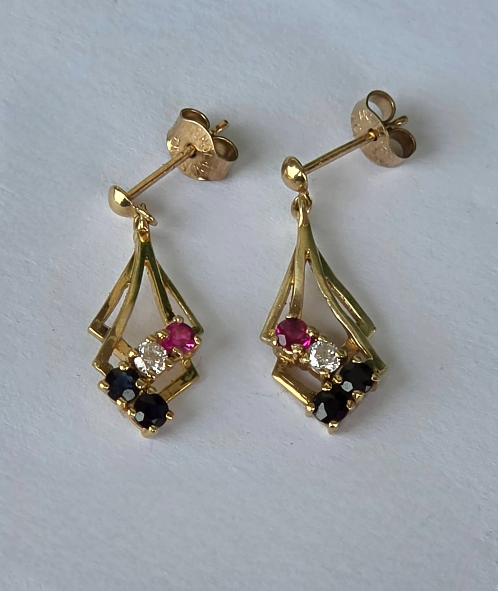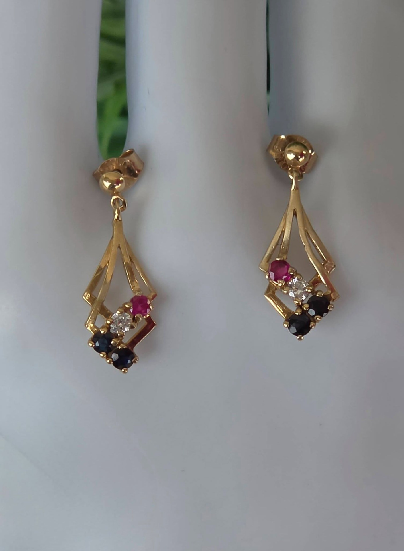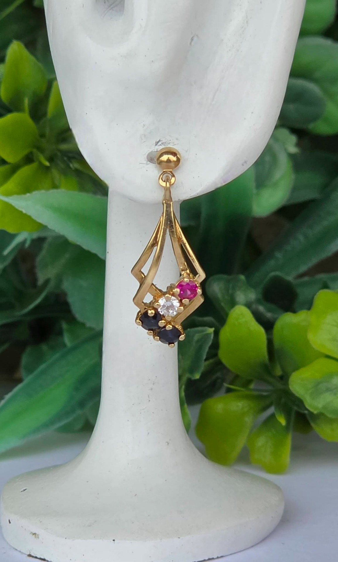 Cercei vechi deosebiți, din aur de 9K, cu 4 safire și 2 rubine naturale și pietre cubic zirconia (1988, Londra , Anglia).