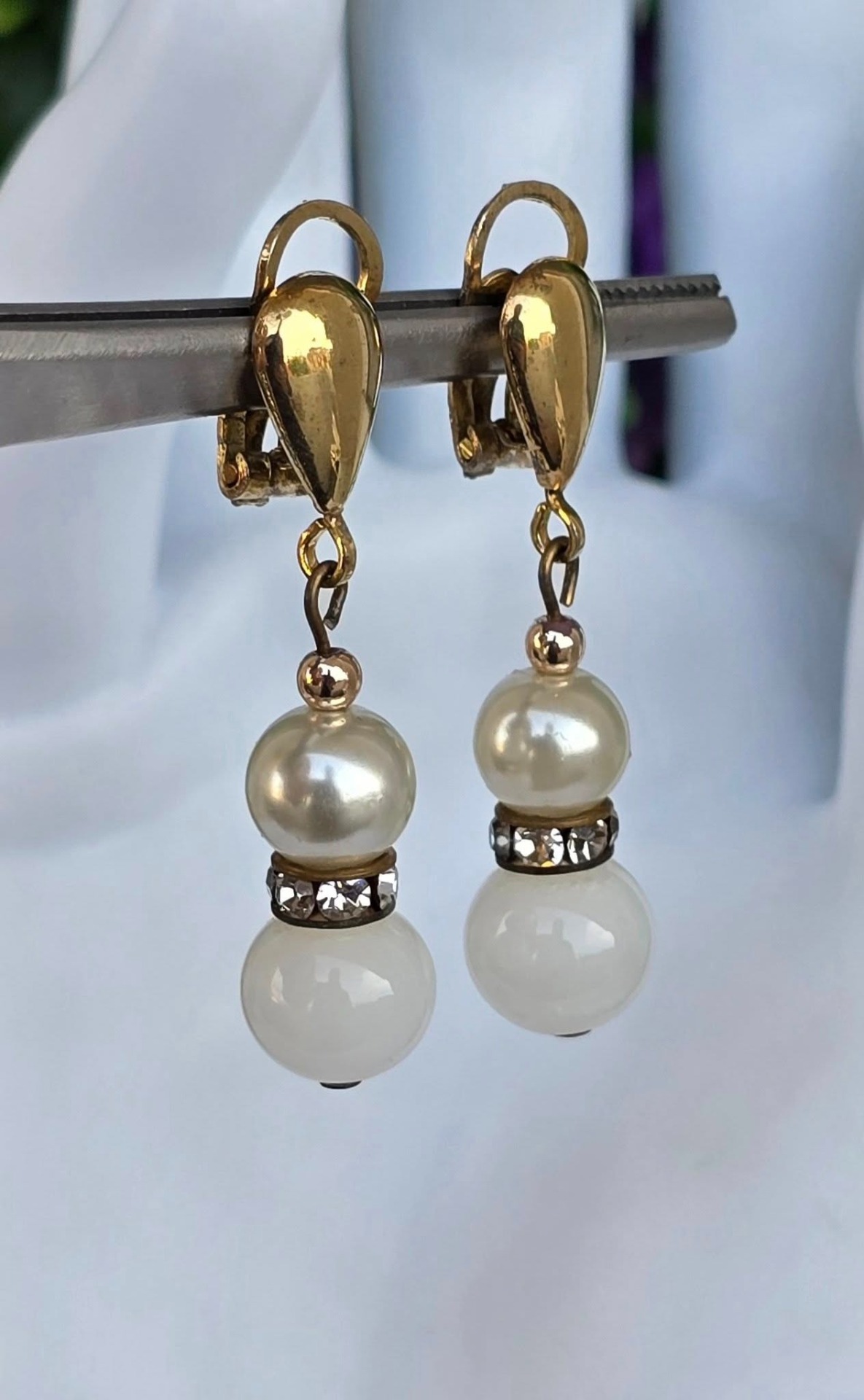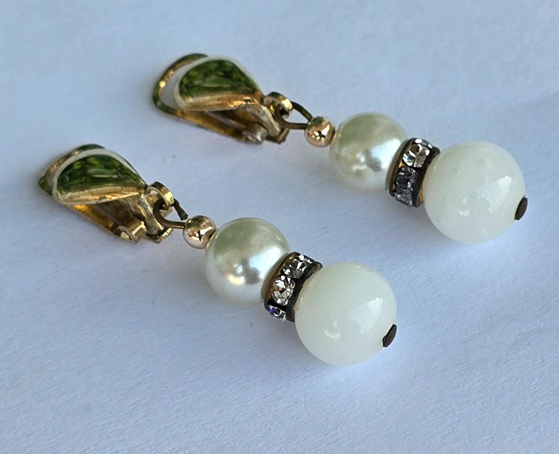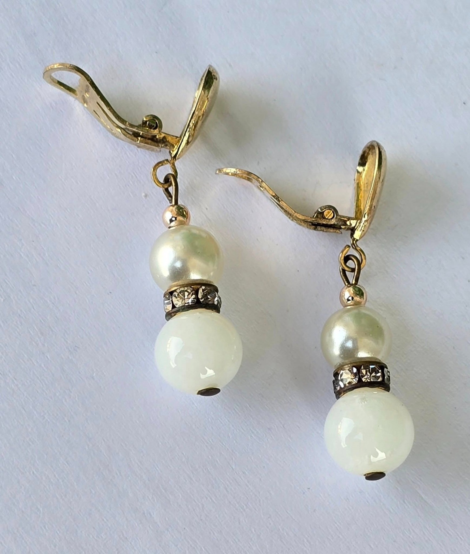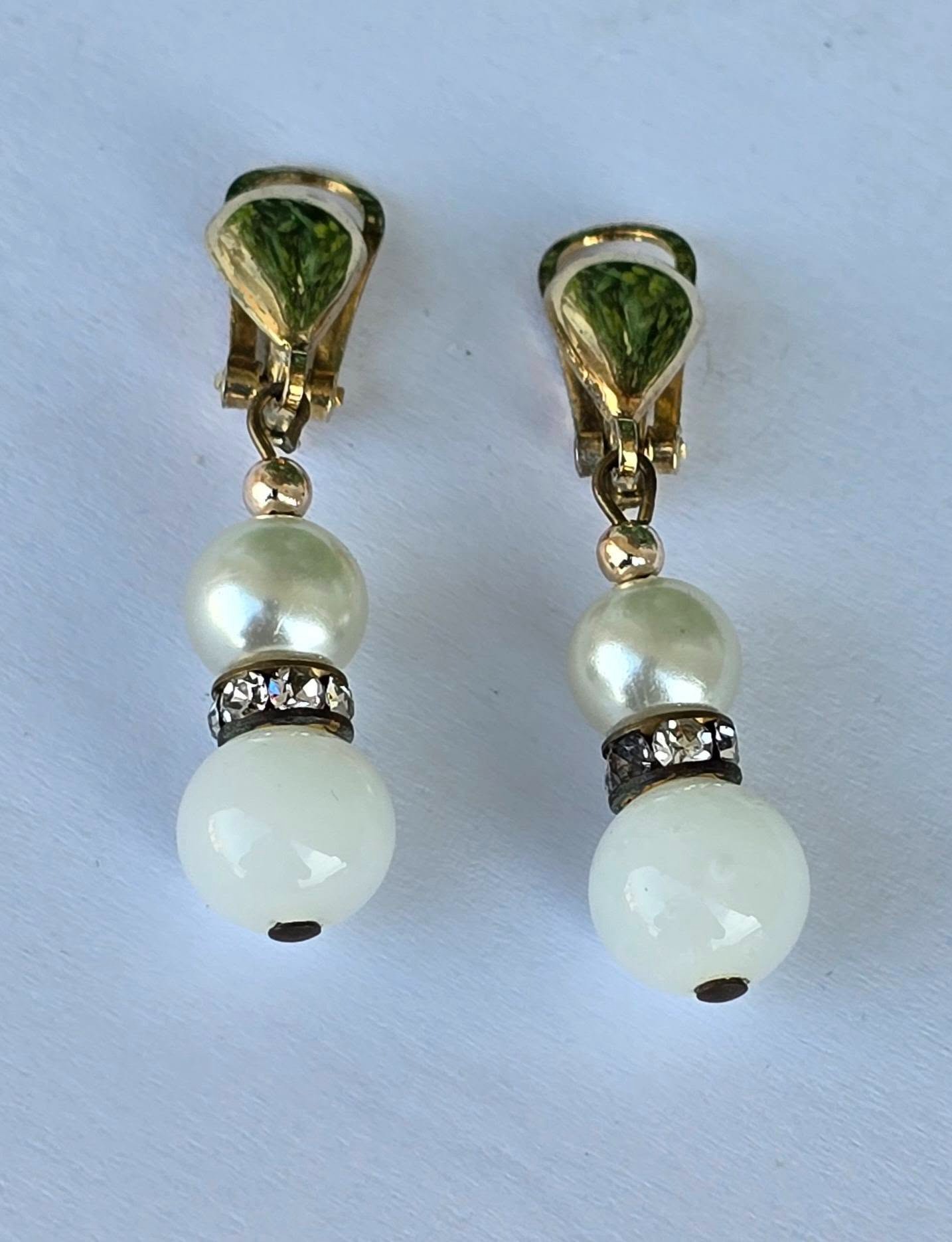 Cercei vechi din argint aurit, cu perle "faux", "glass paste" alb și pietre cubic zirconia, cu prindere de tip "clips", manufactură  de atelier italian