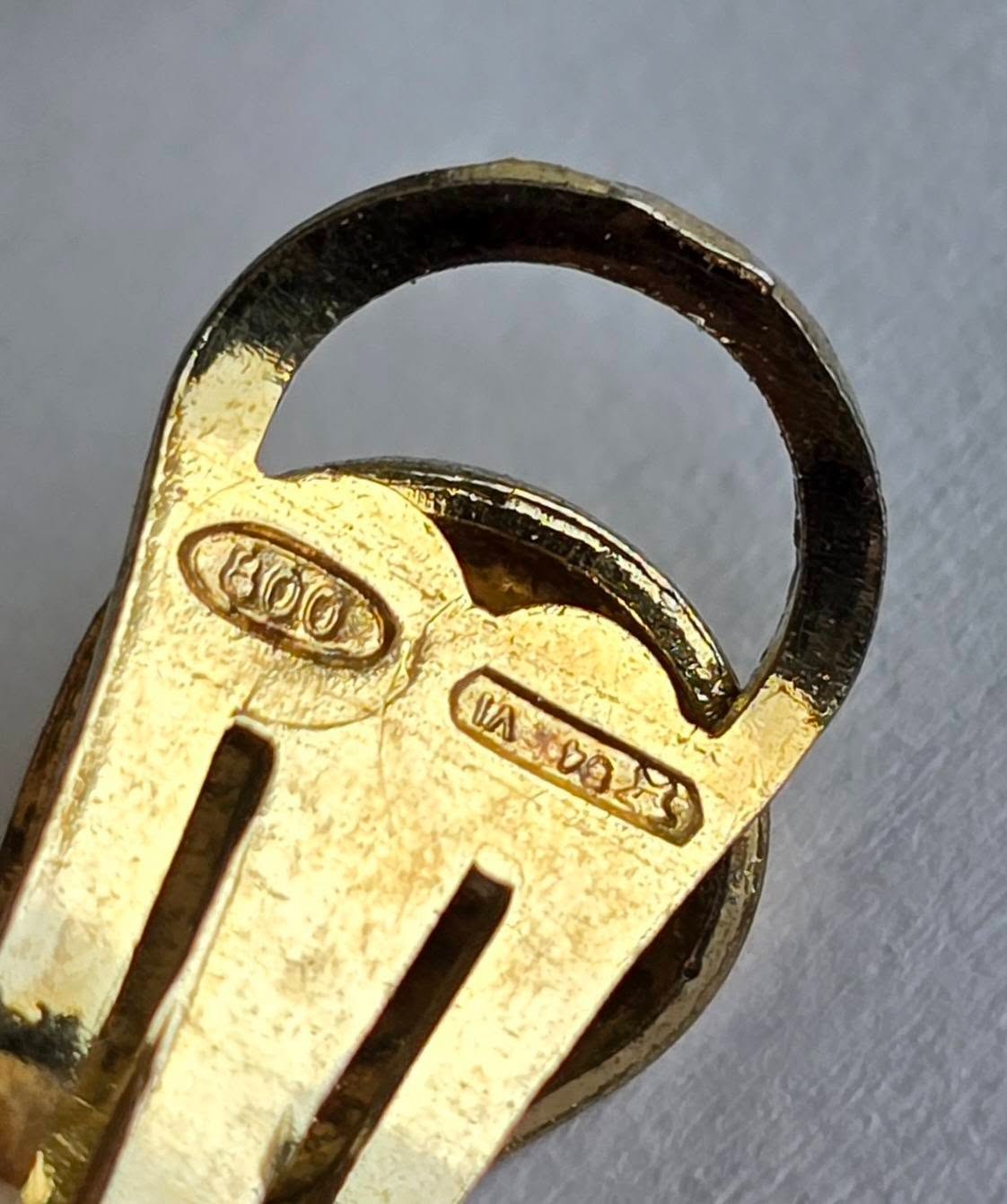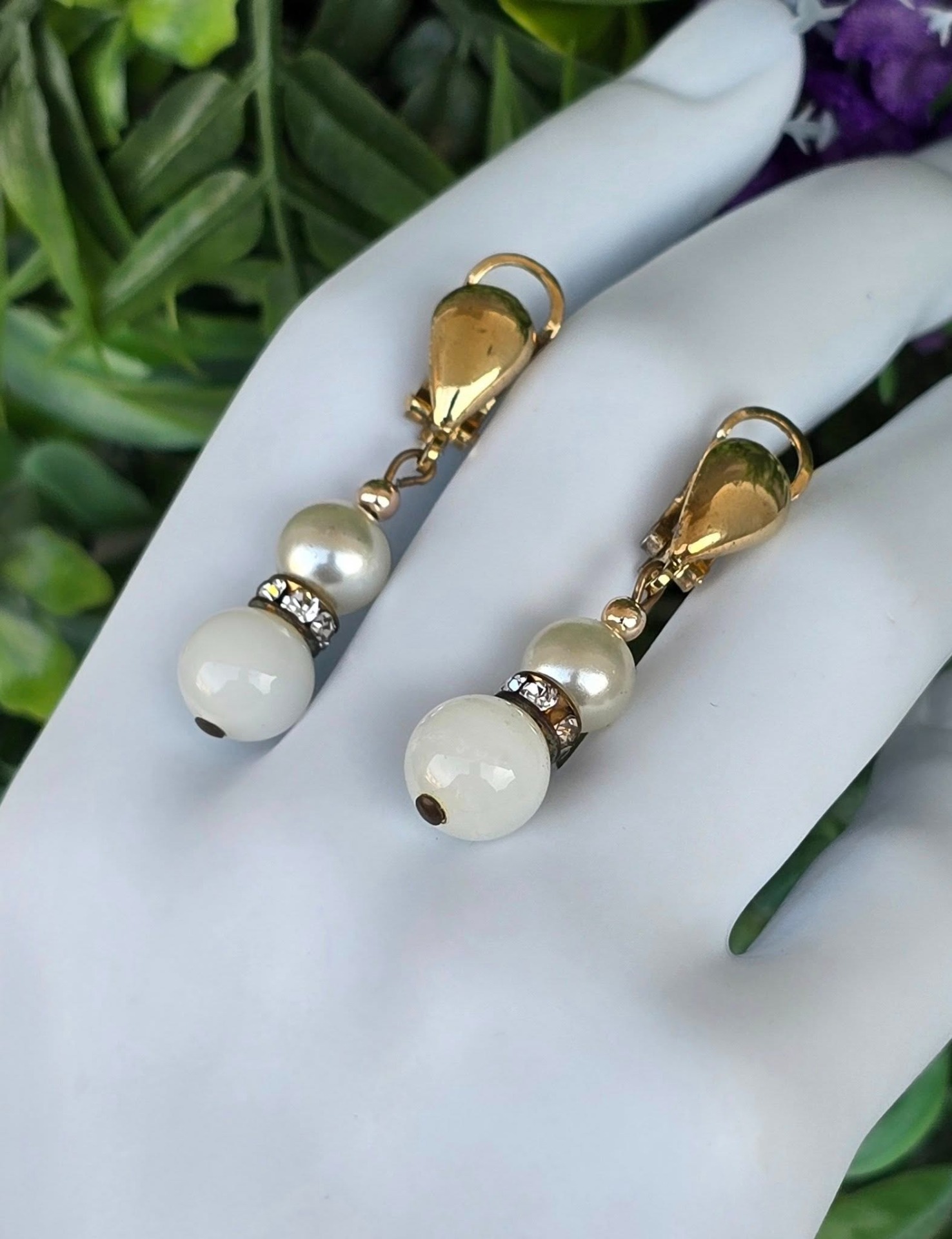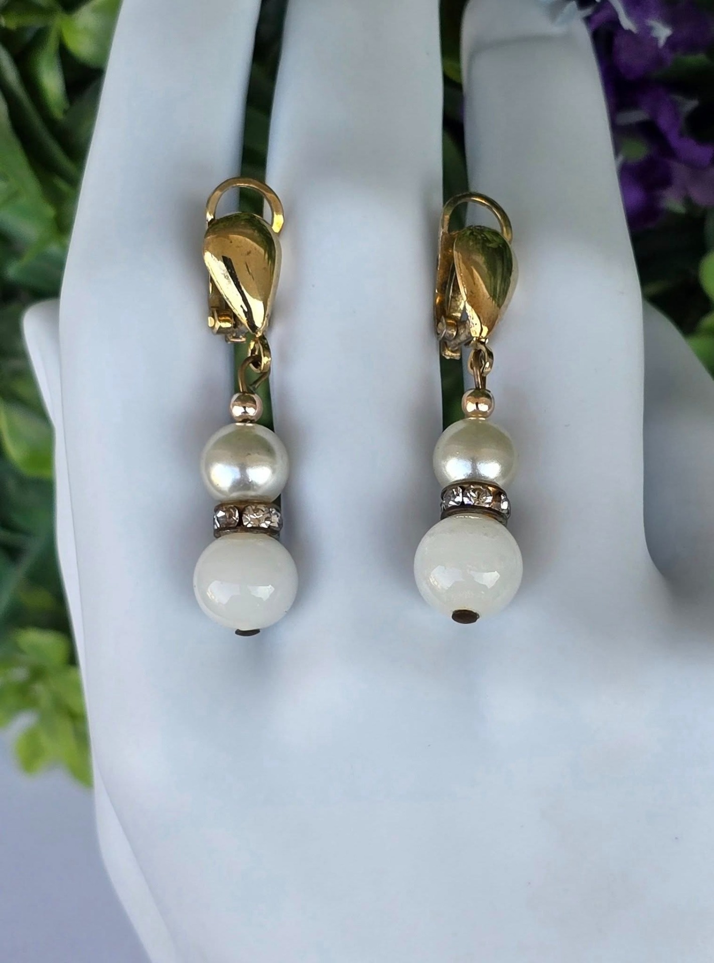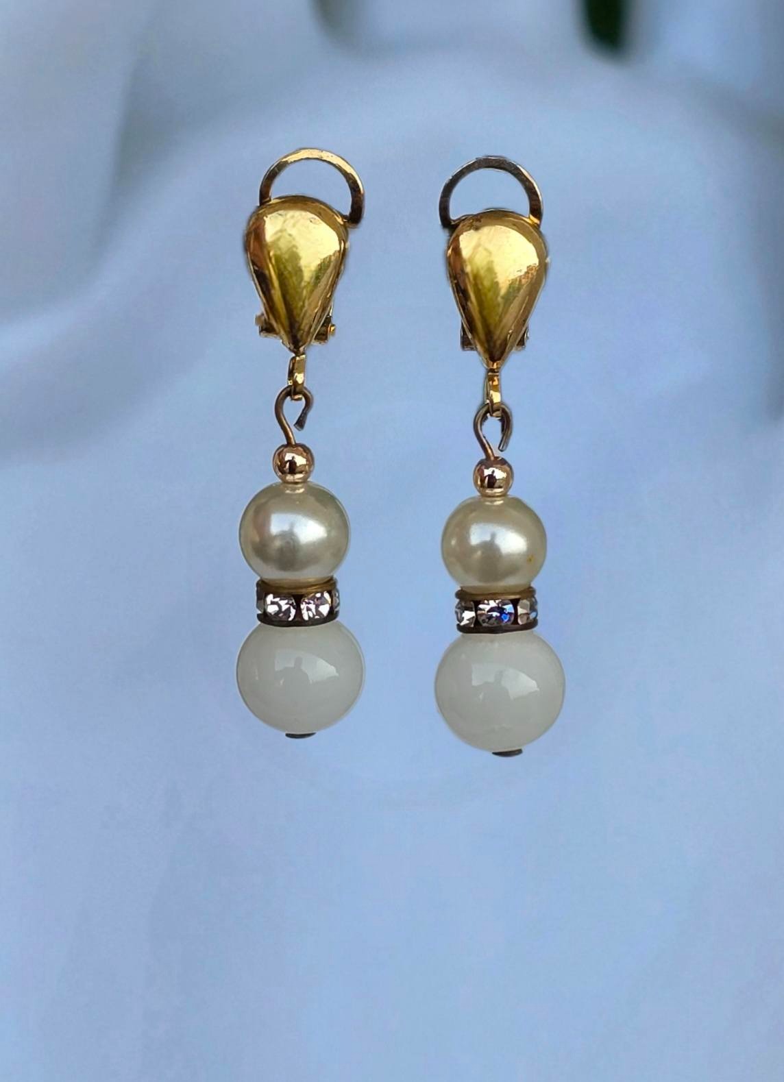 Cercei vechi din argint aurit, cu perle "faux", "glass paste" alb și pietre cubic zirconia, cu prindere de tip "clips", manufactură  de atelier italian