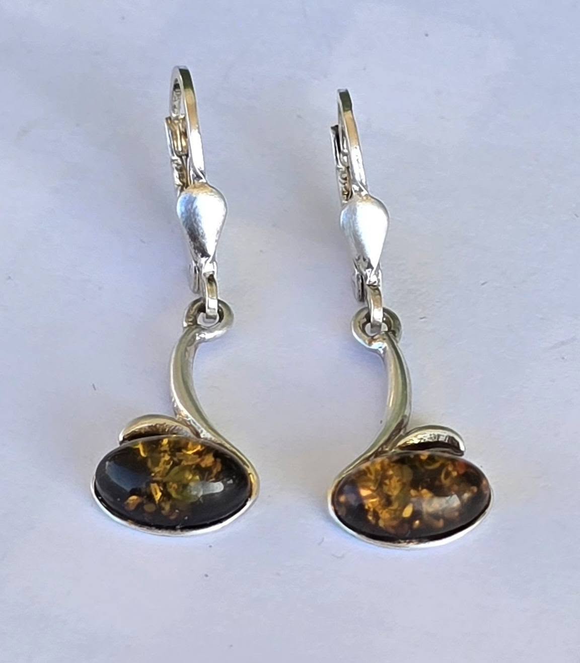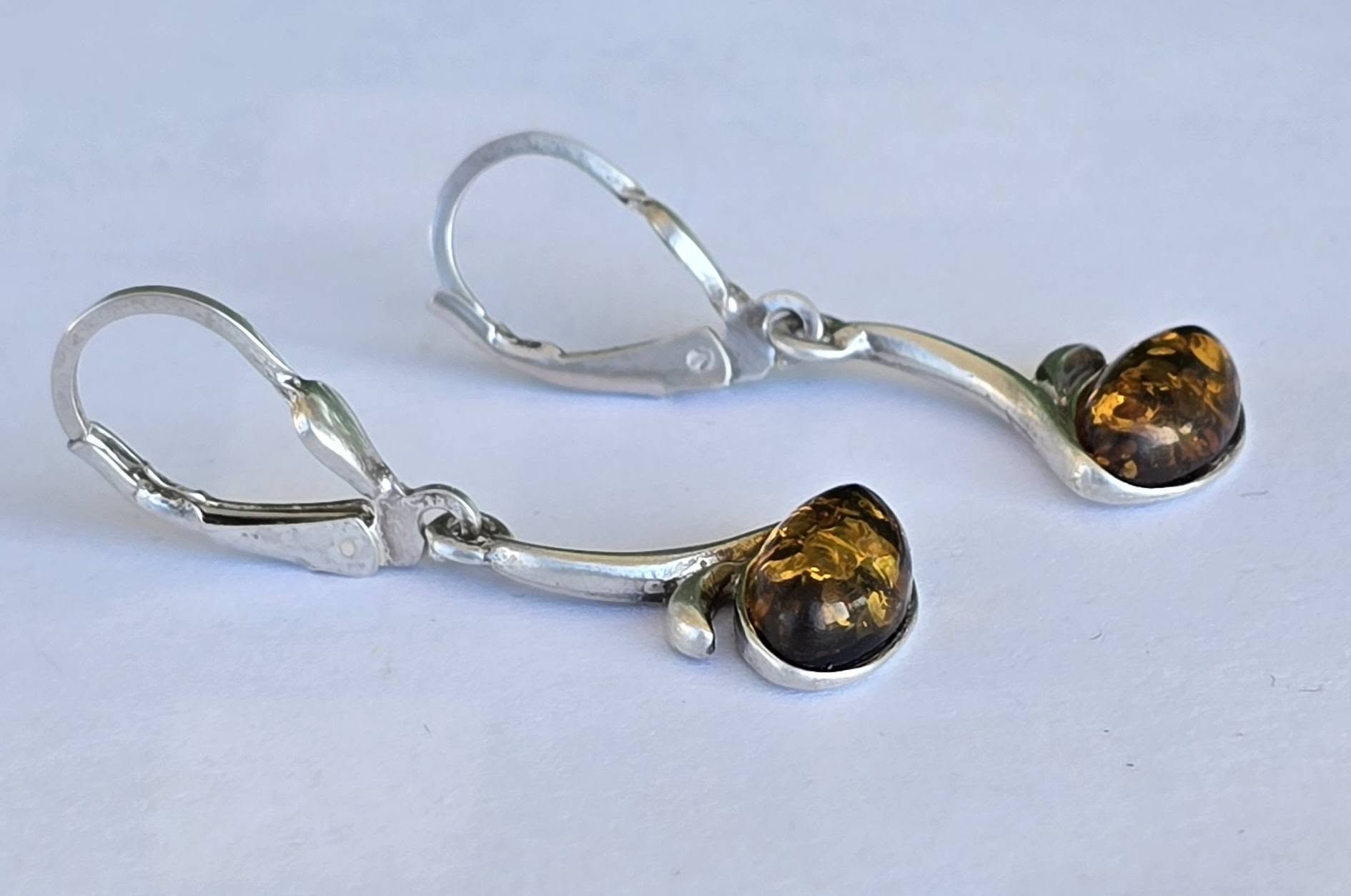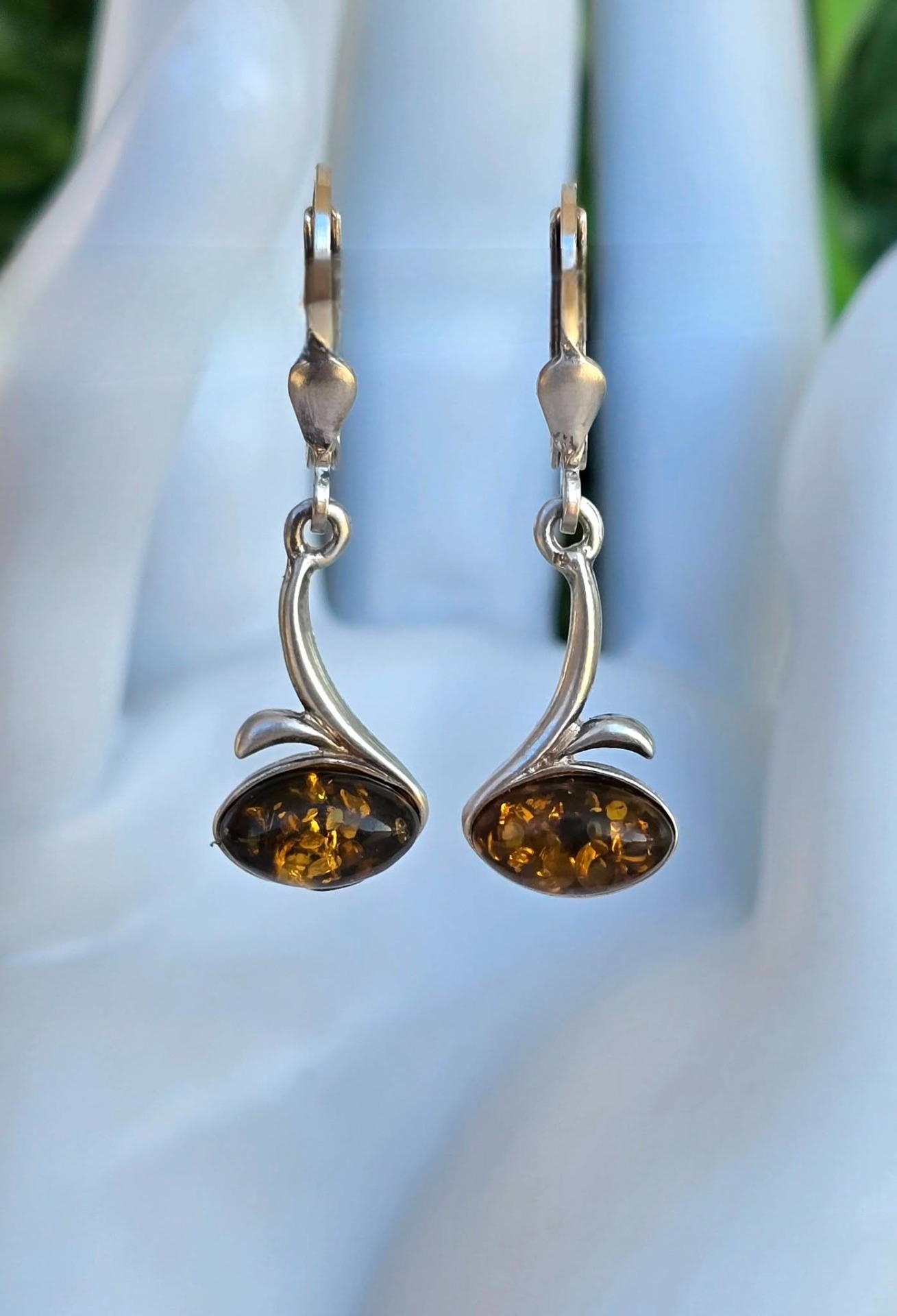 Cercei vechi din argint, cu chihlimbar baltic natural.