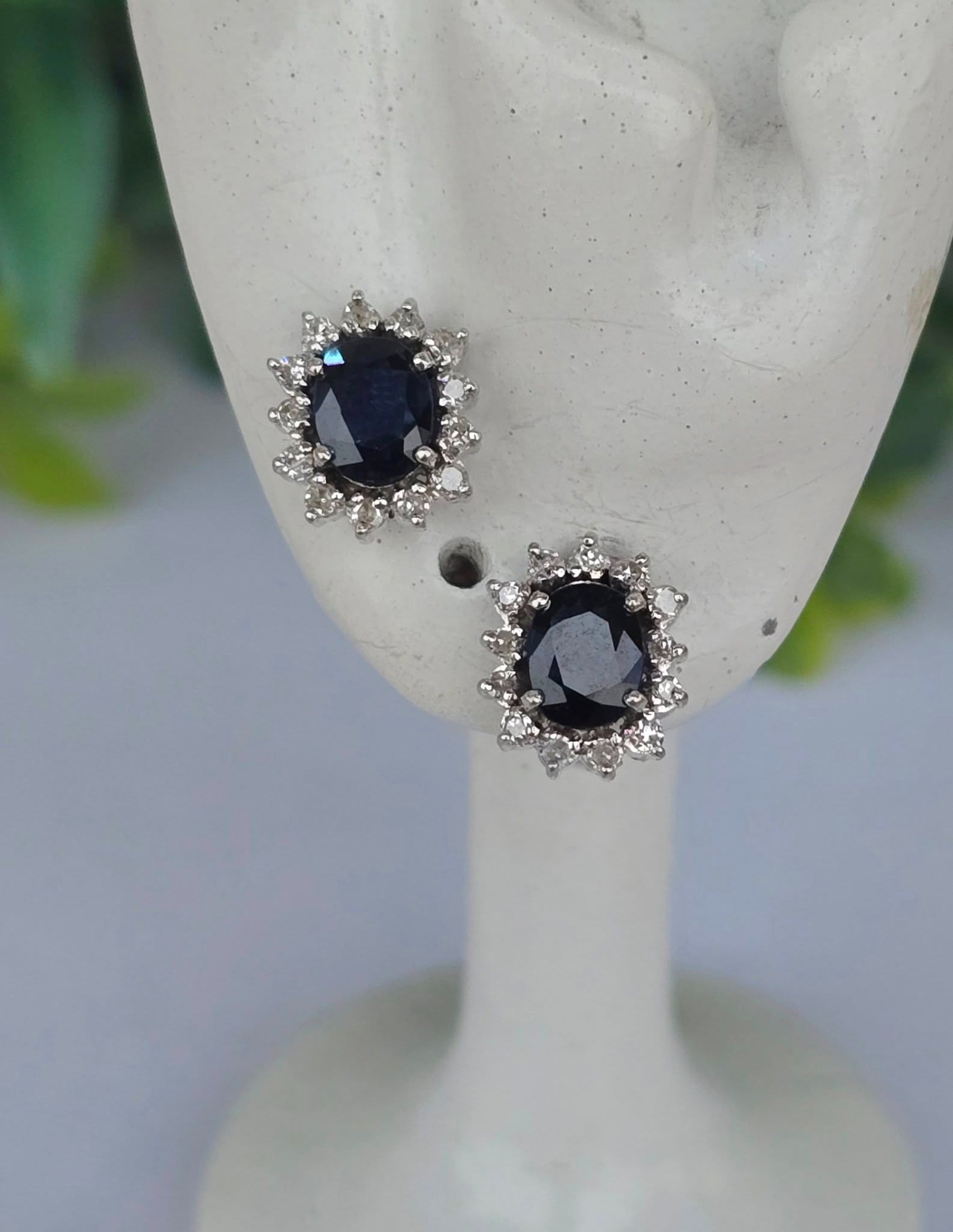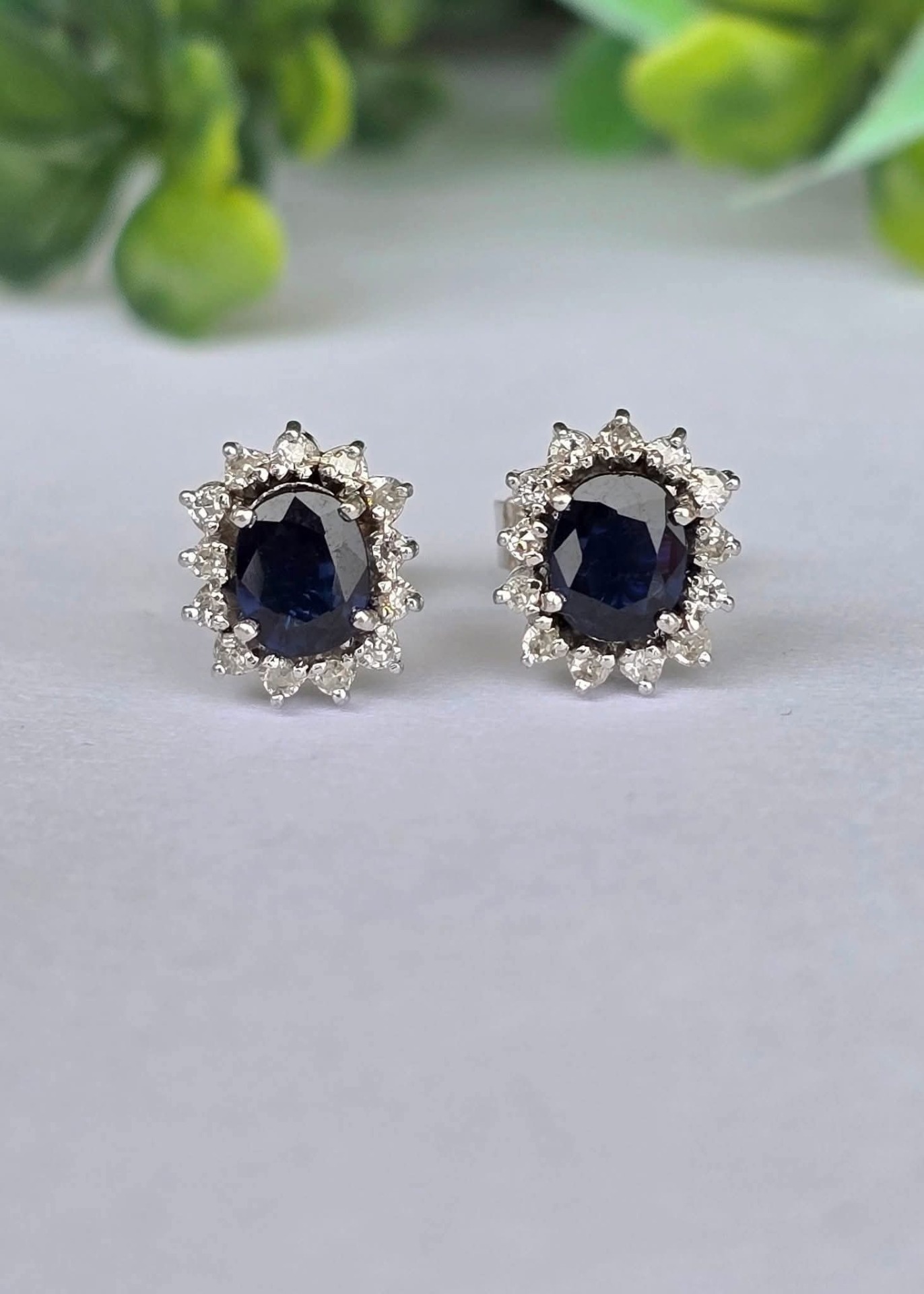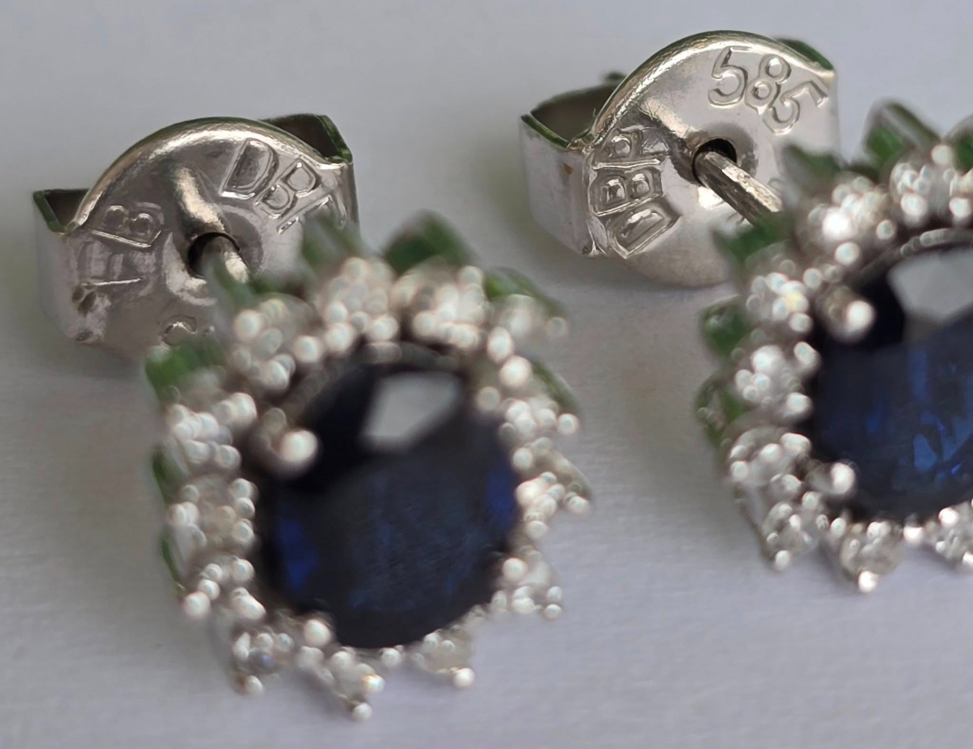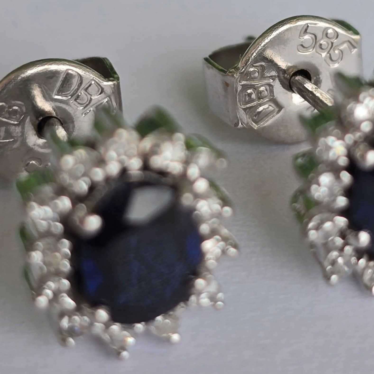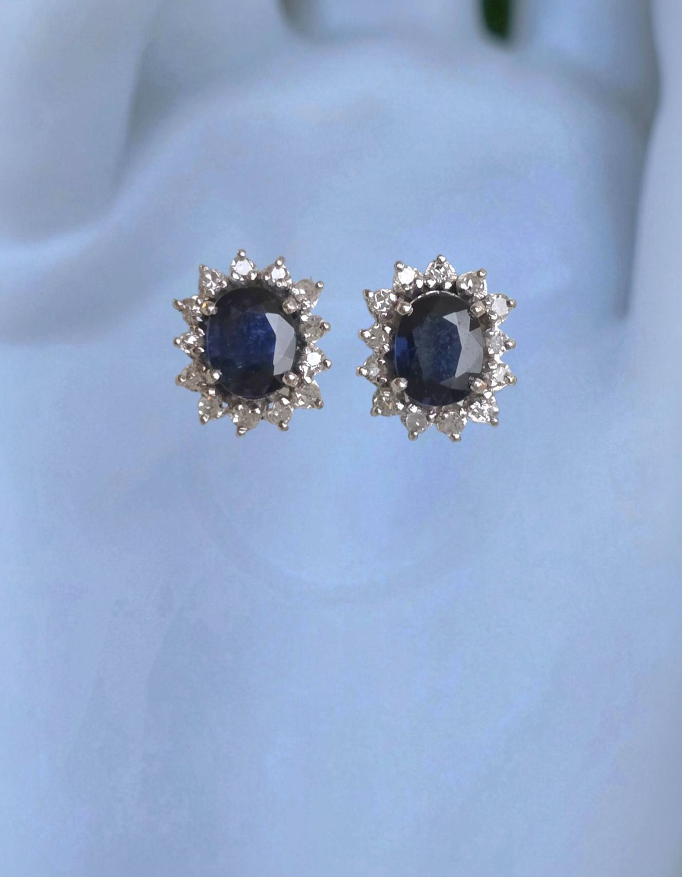 Cercei vechi din aur de 14K, cu safire "navy-blue" și 26 diamante naturale.