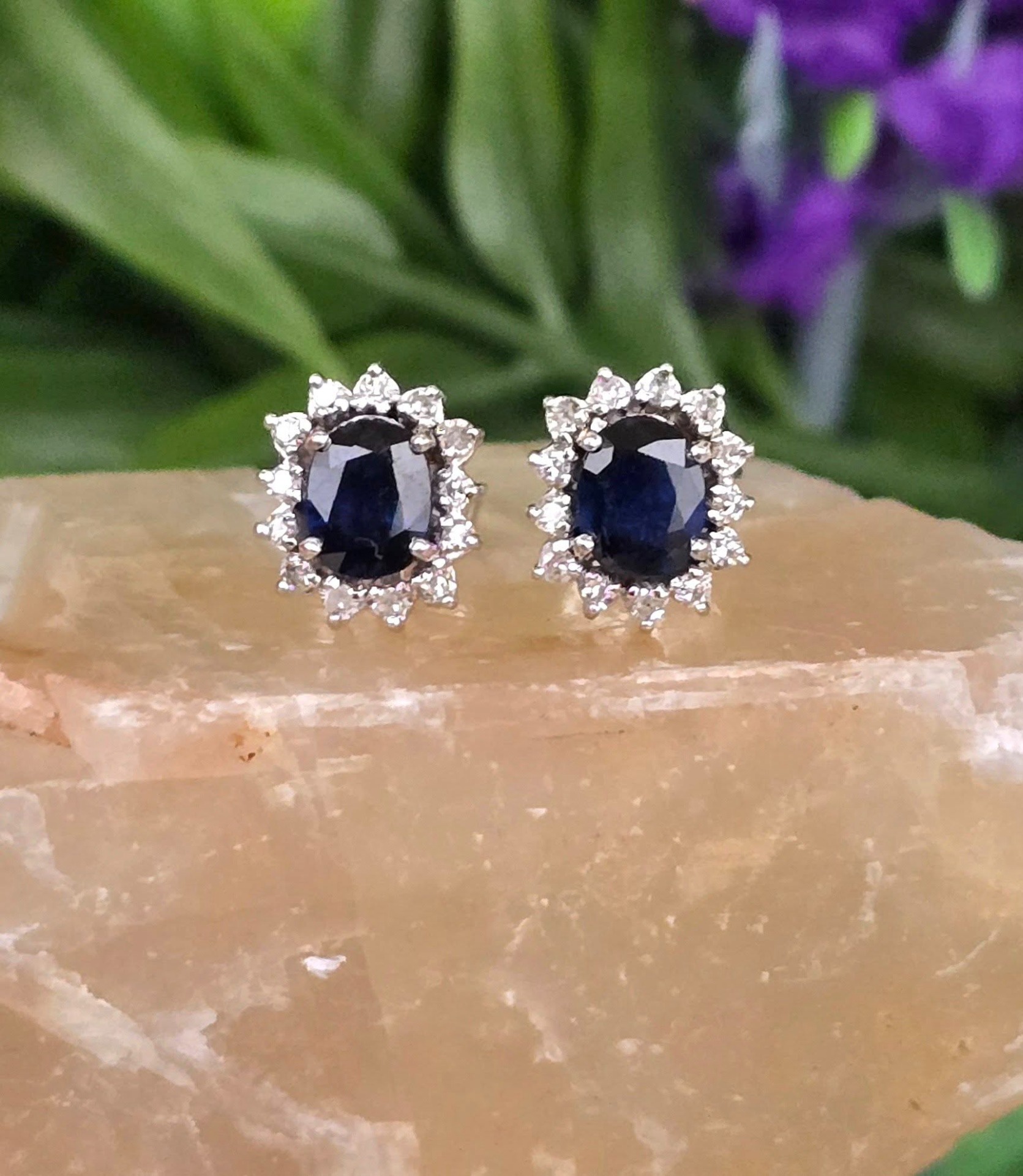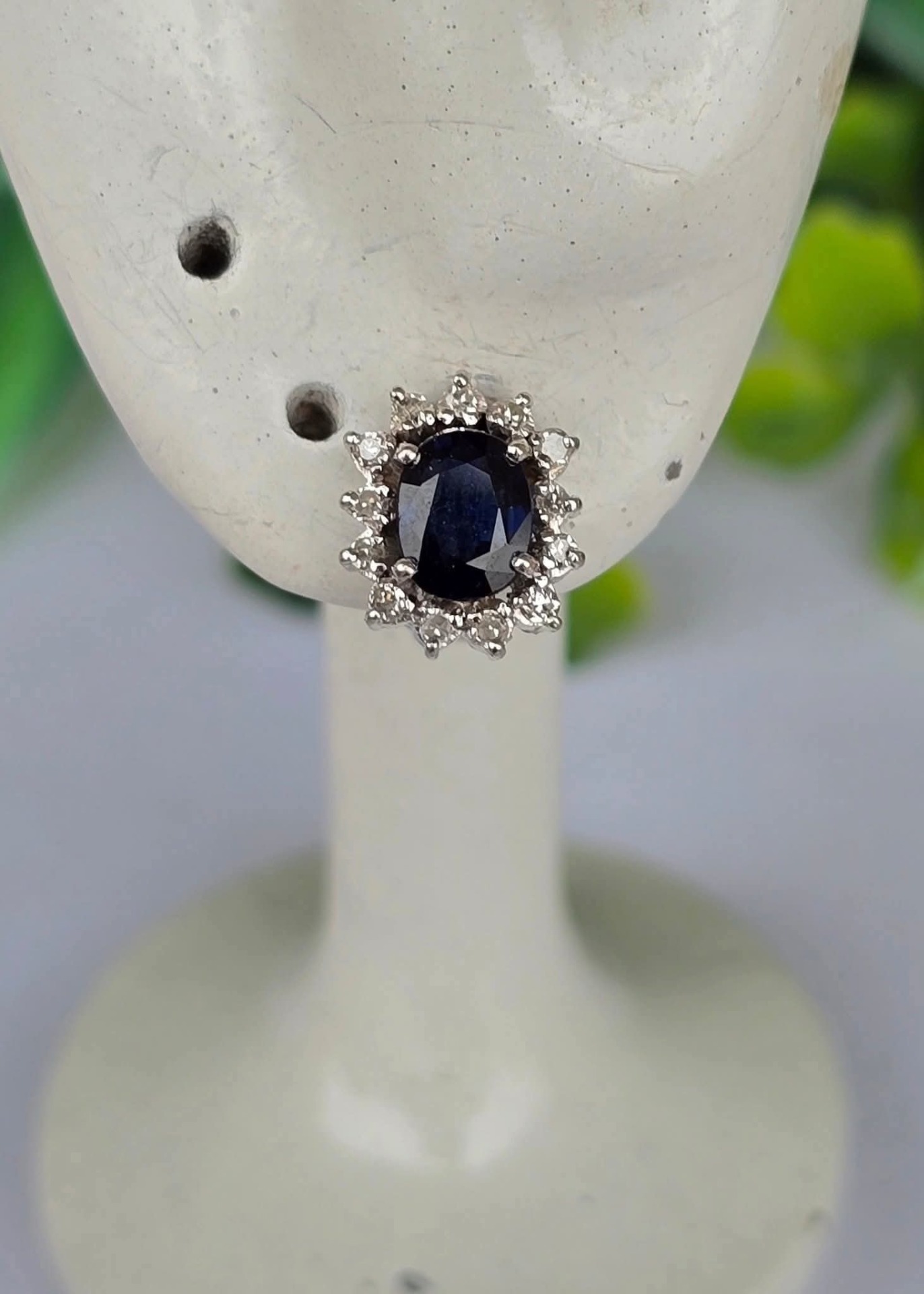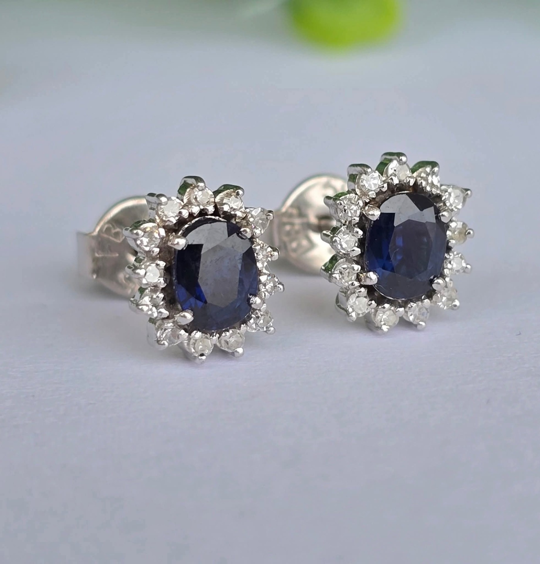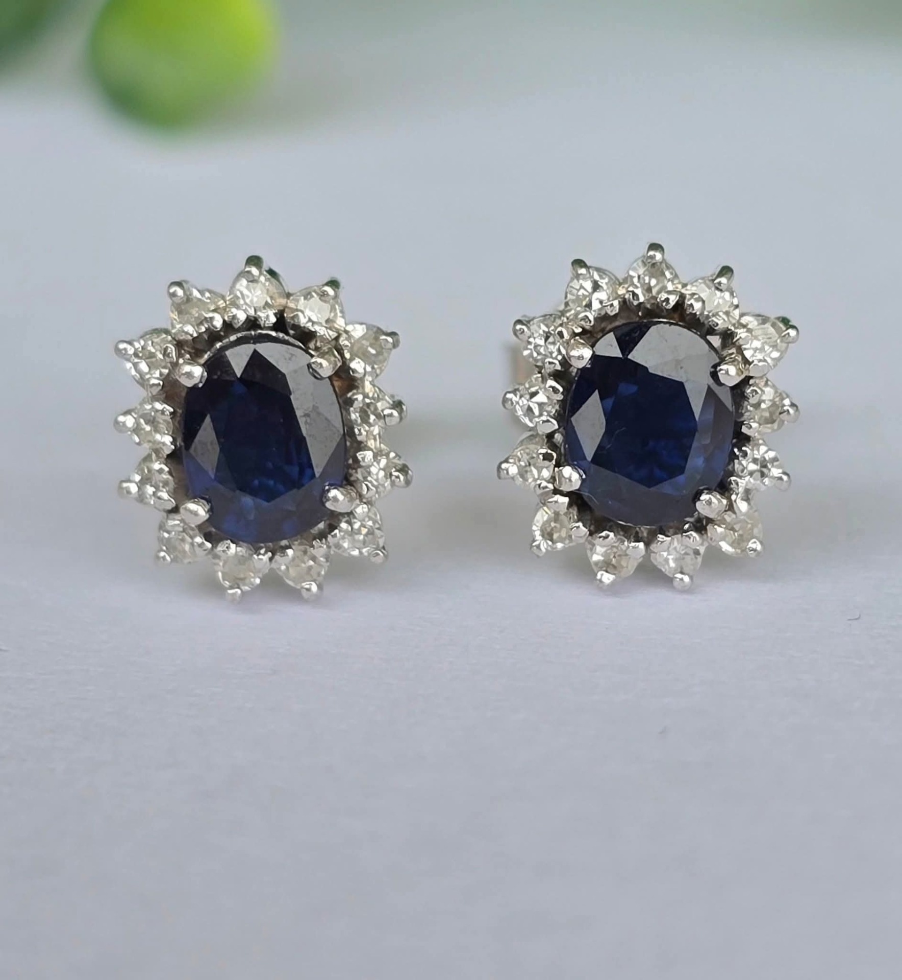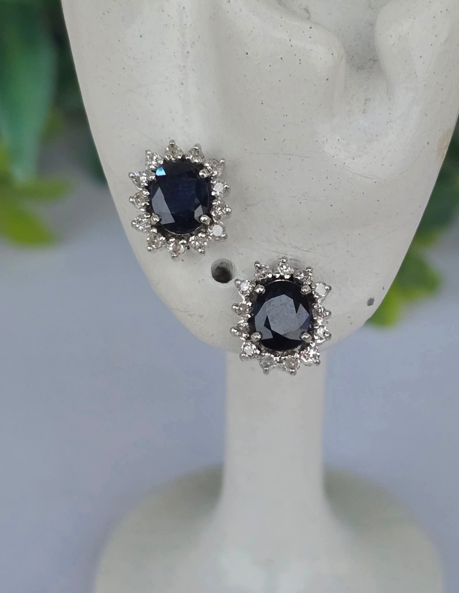 Cercei vechi din aur de 14K, cu safire "navy-blue" și 26 diamante naturale.