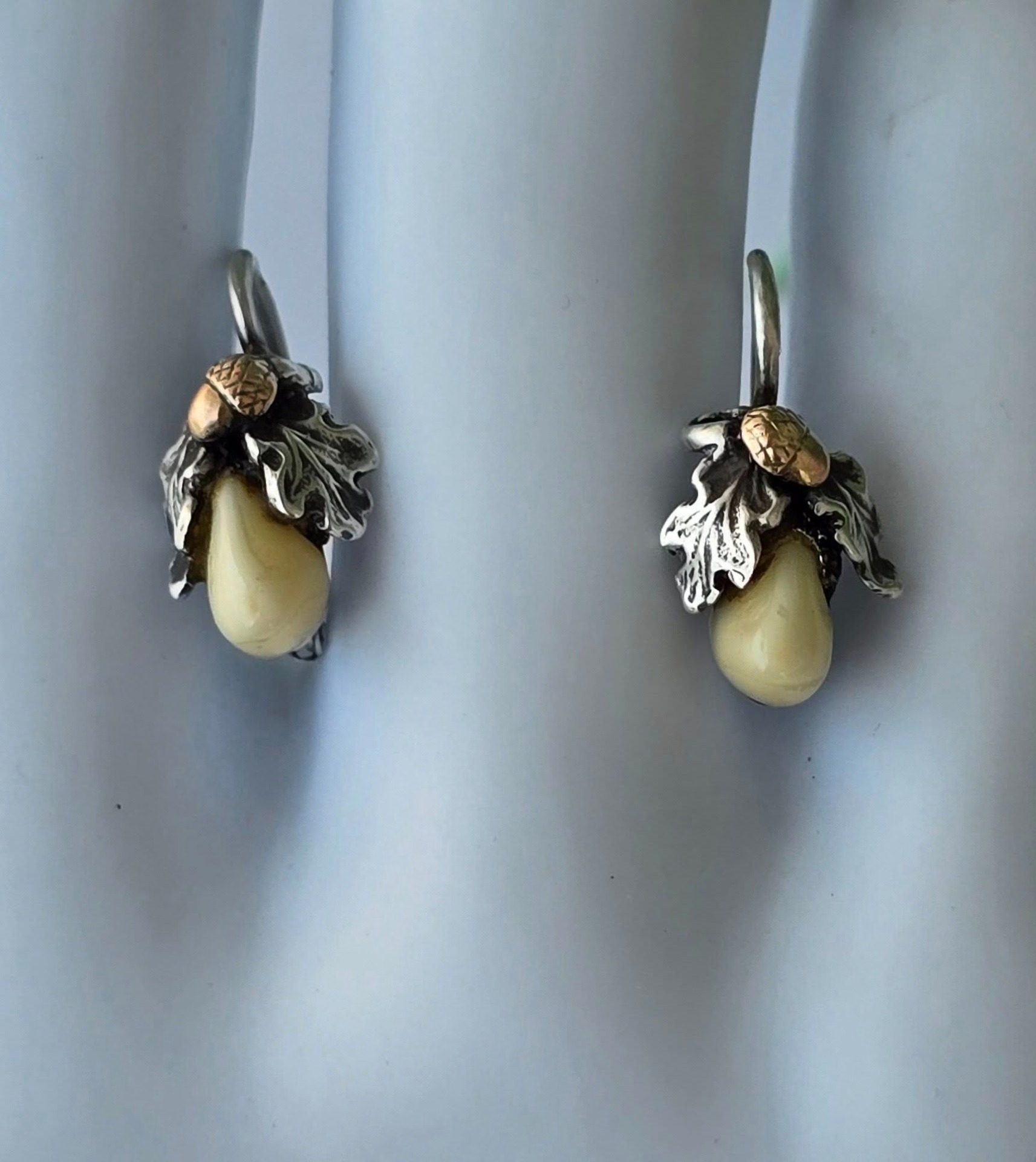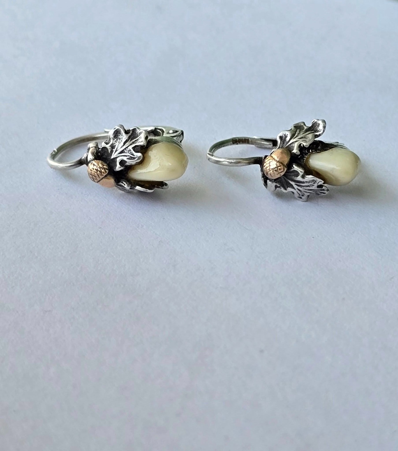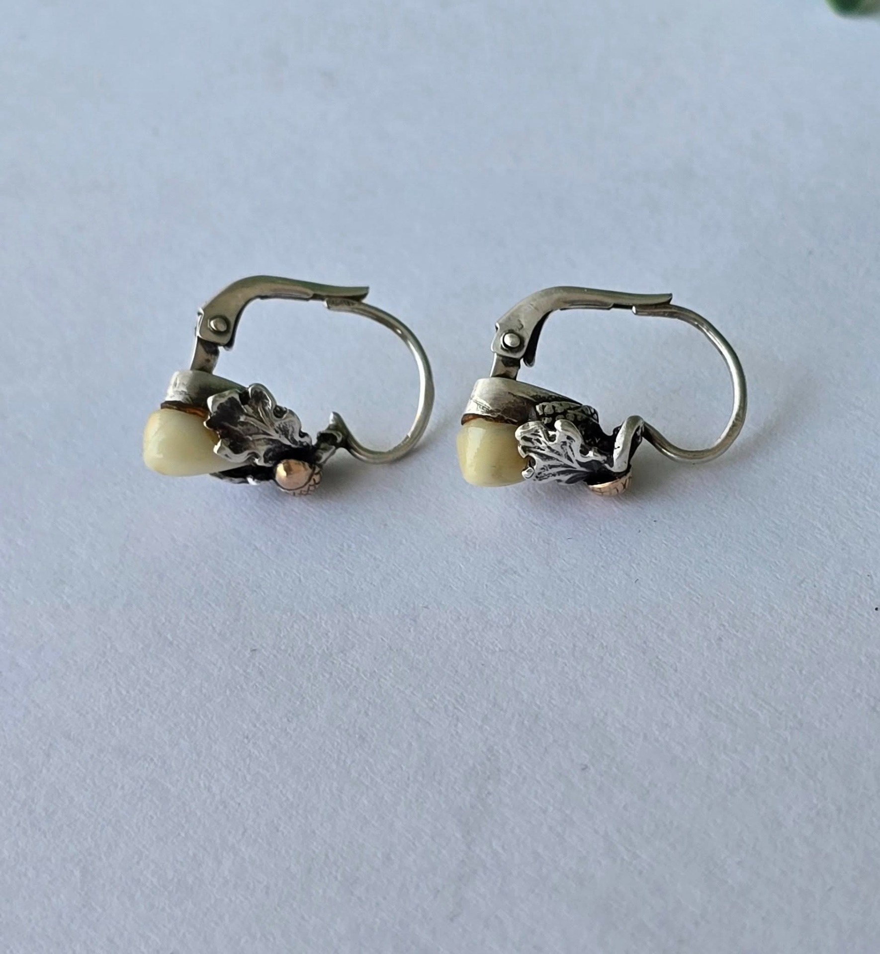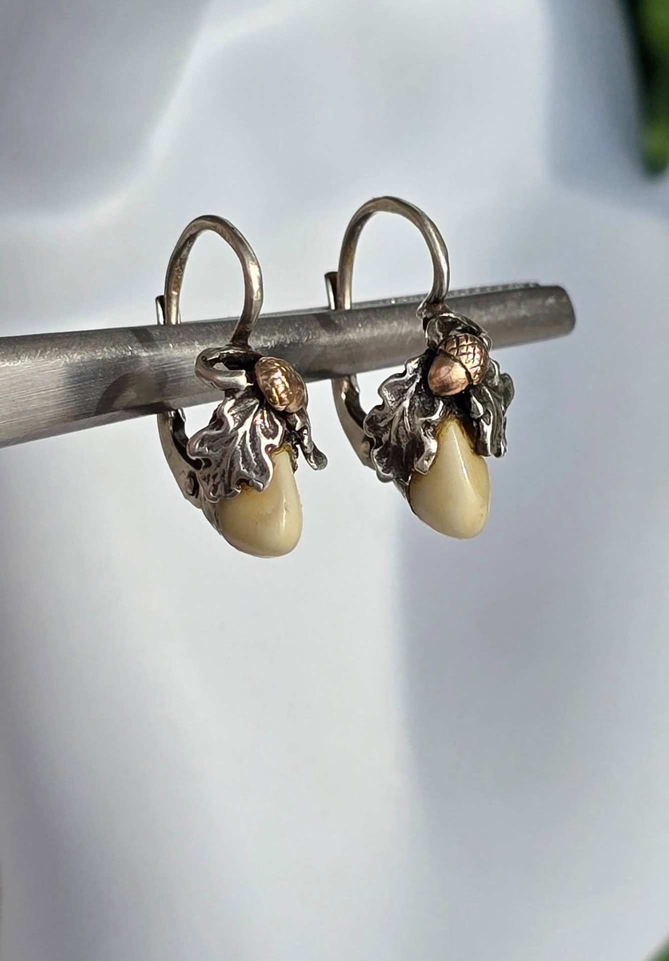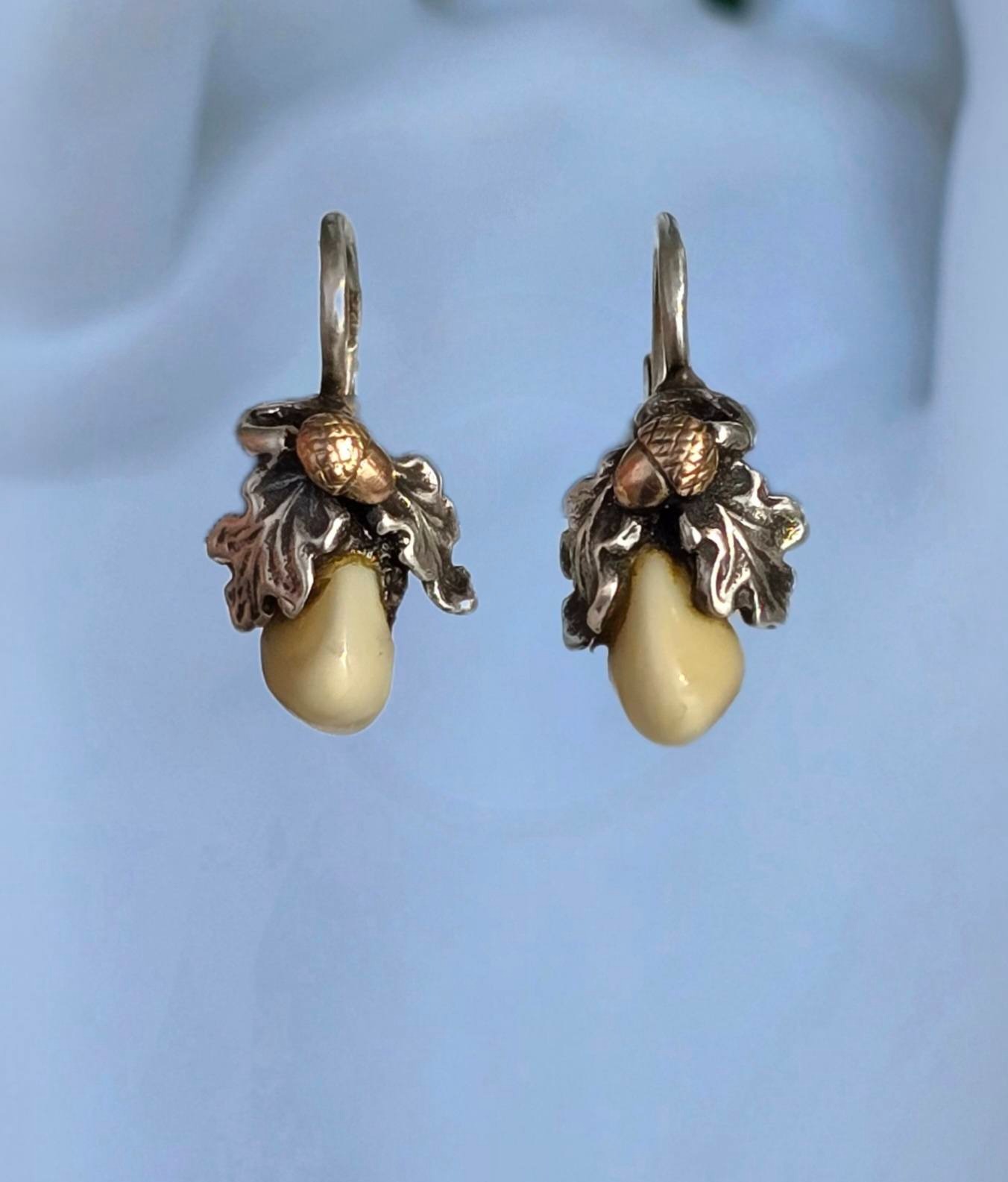 Cercei vechi Grandel, din argint, cu dinți de căprioară, frumos lucrați manual, stilizați cu ghinde din aur de 14K și frunze de stejar (anii 1930-1940,