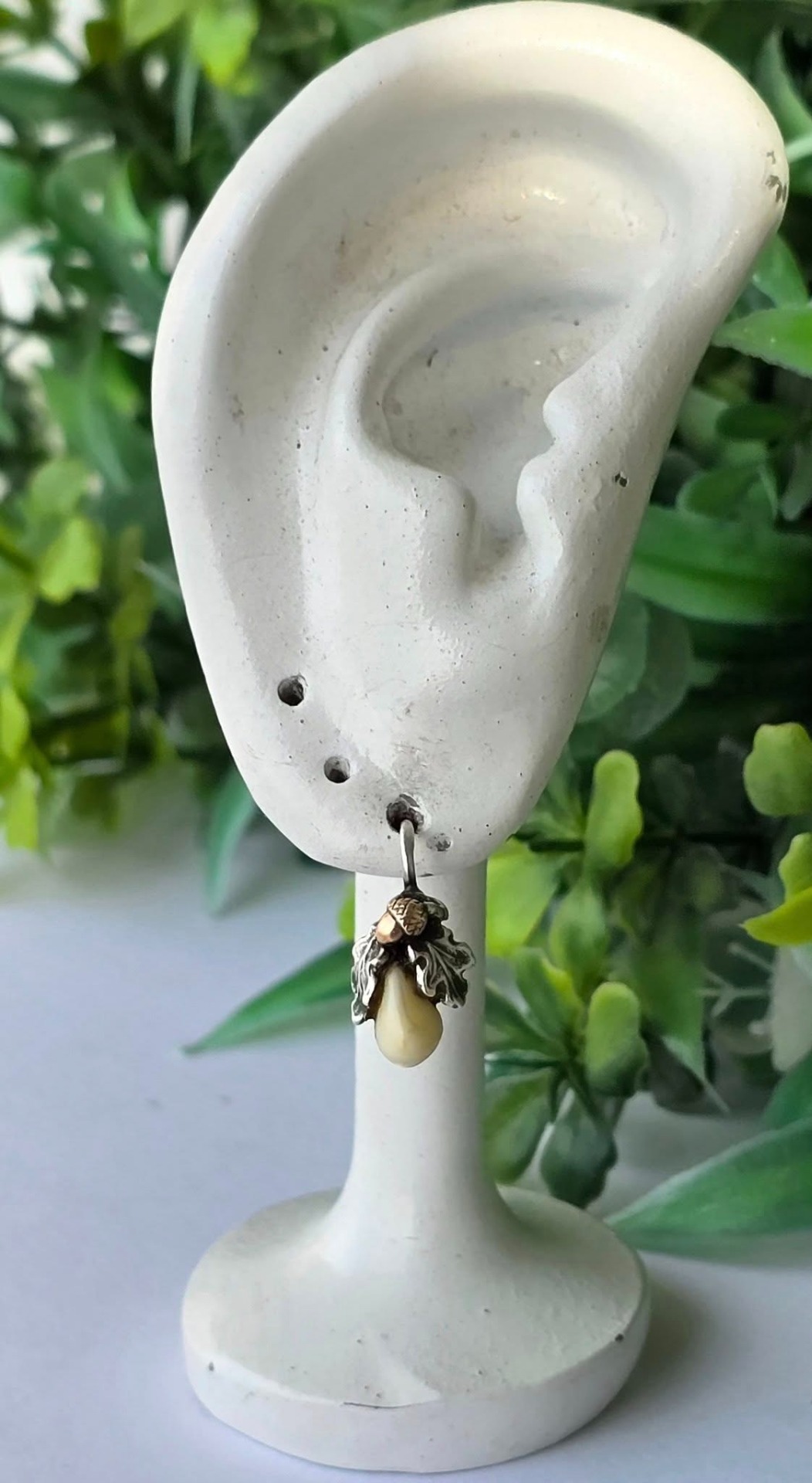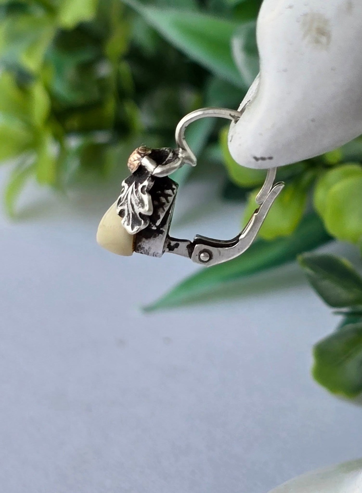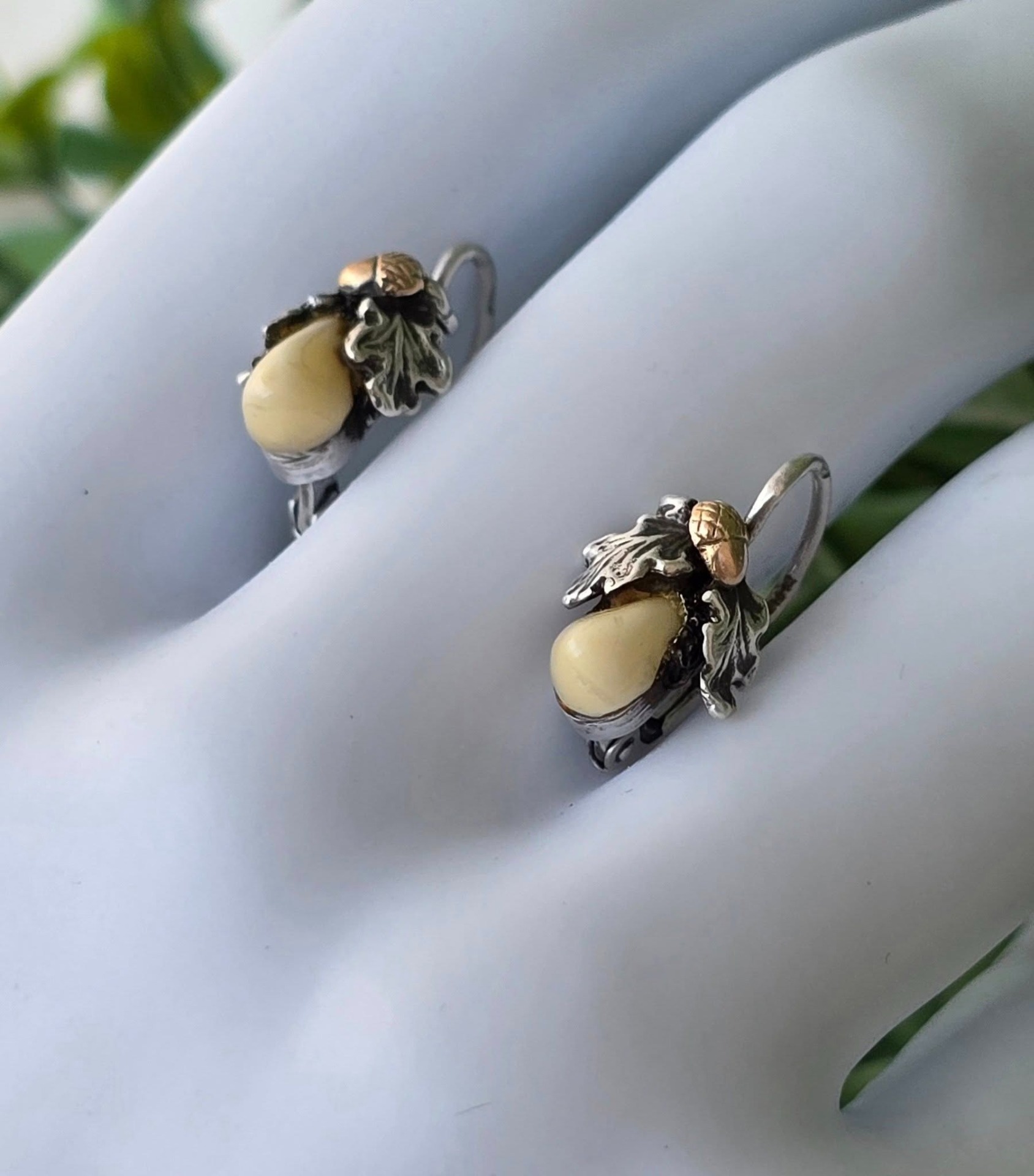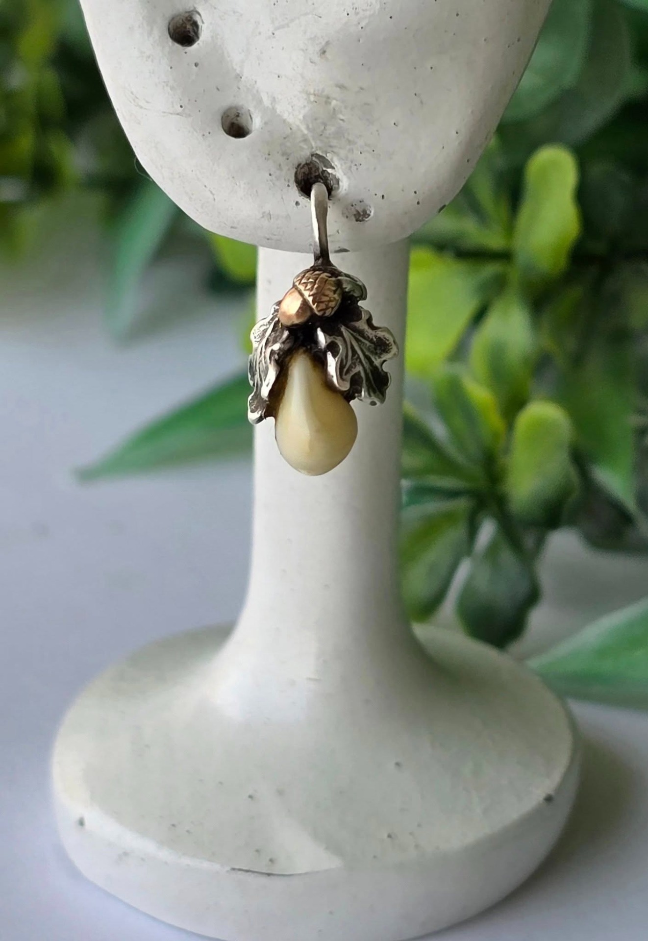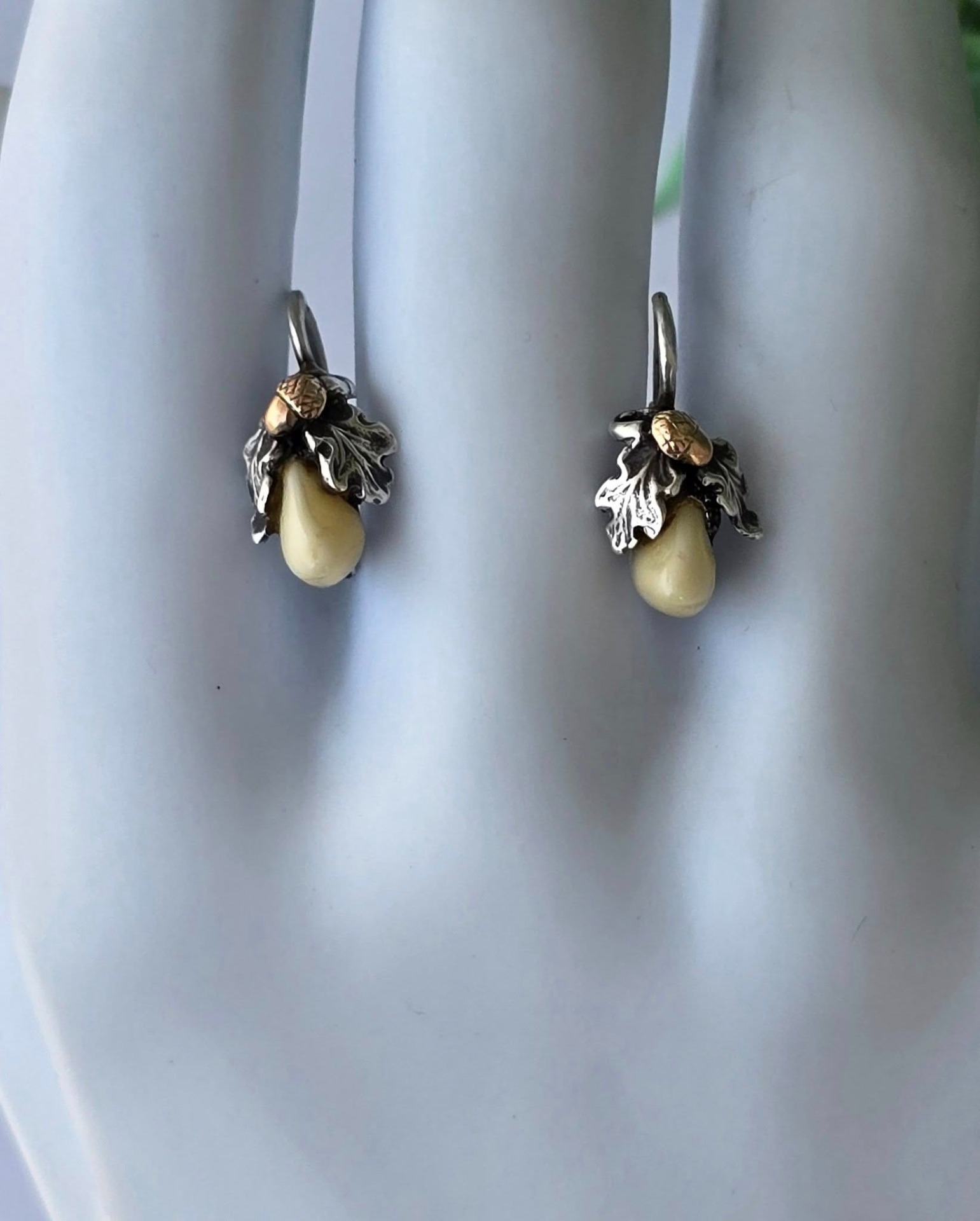 Cercei vechi Grandel, din argint, cu dinți de căprioară, frumos lucrați manual, stilizați cu ghinde din aur de 14K și frunze de stejar (anii 1930-1940,