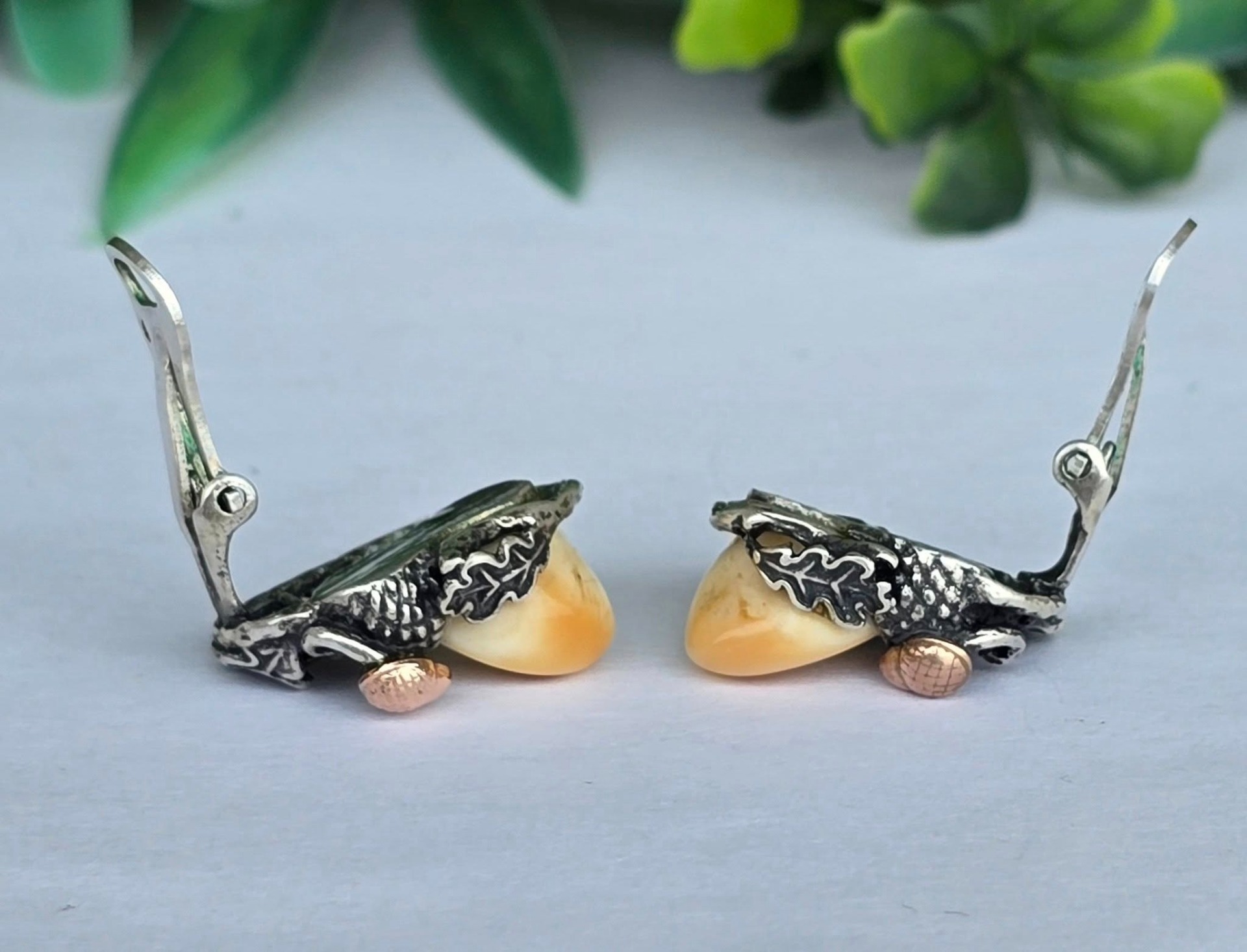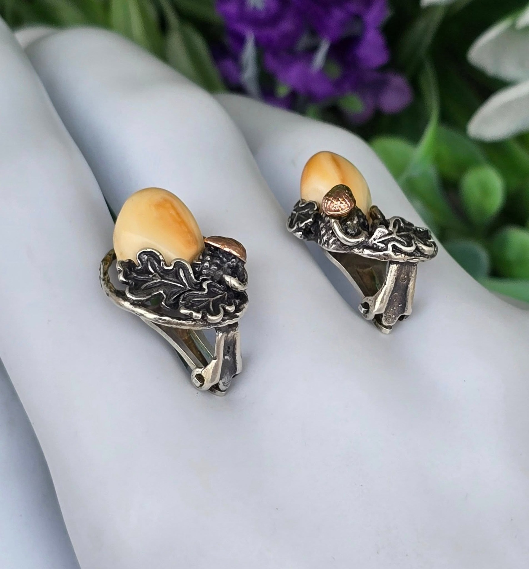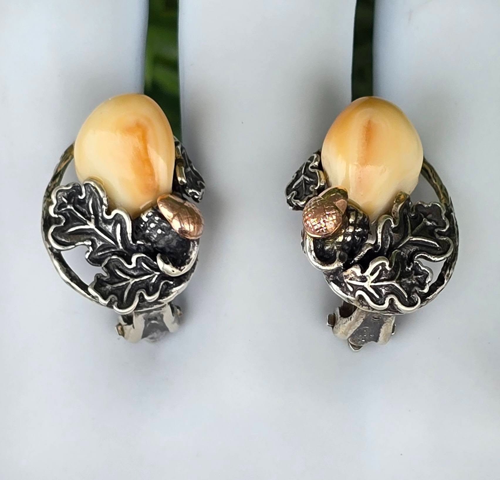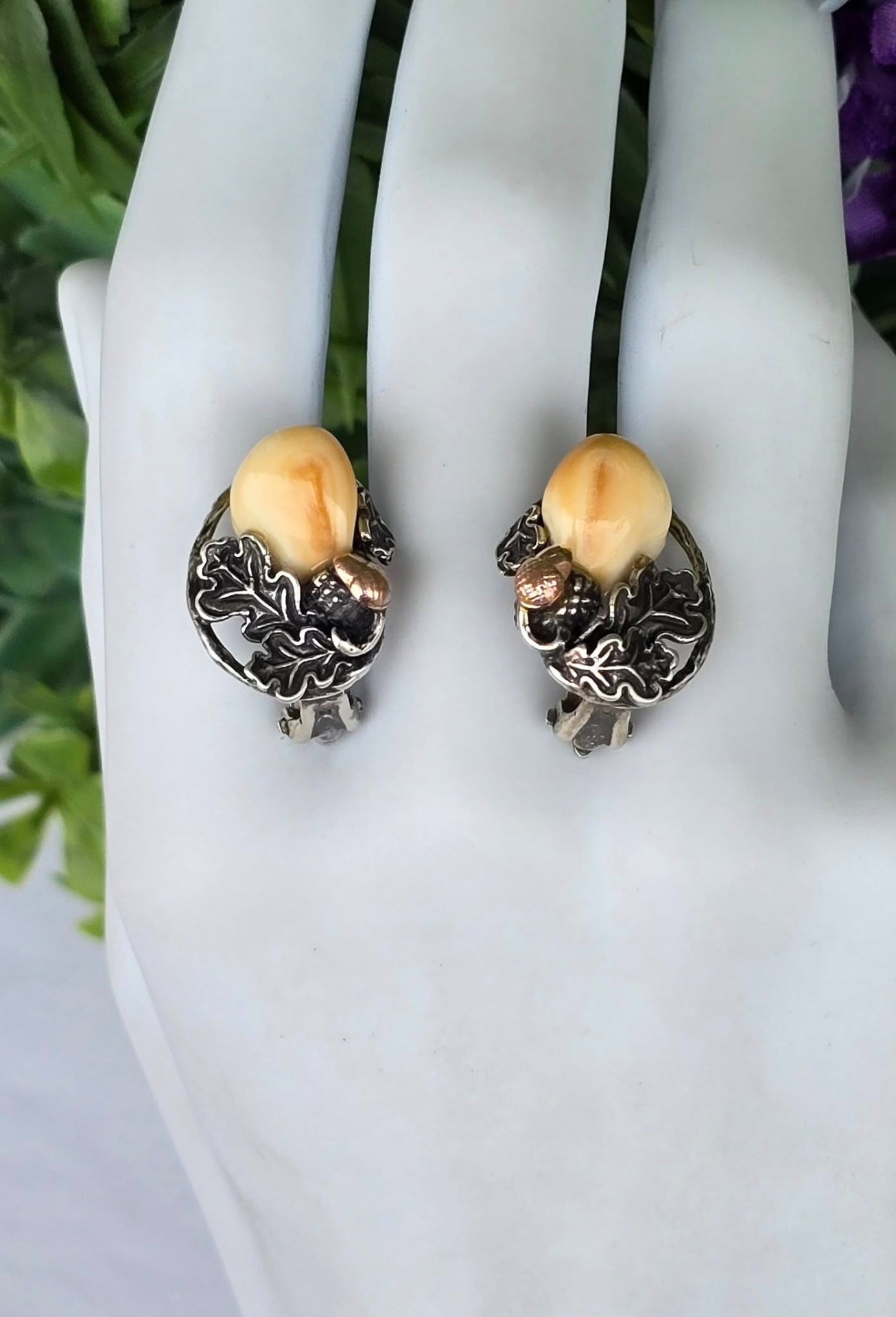 Cercei vechi Grandel, din argint, cu dinți de cerb, frumos lucrați manual, stilizați cu ghinde din aur de 14K și frunze de stejar, cu închidere de tip "clips"