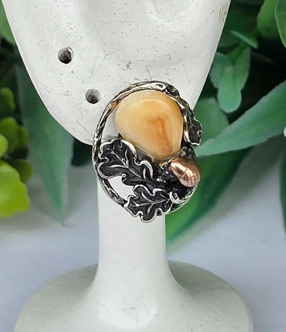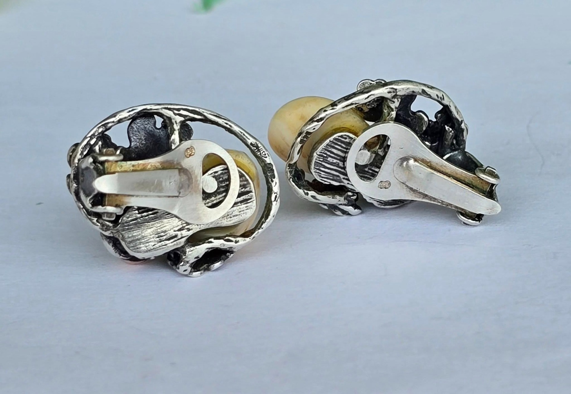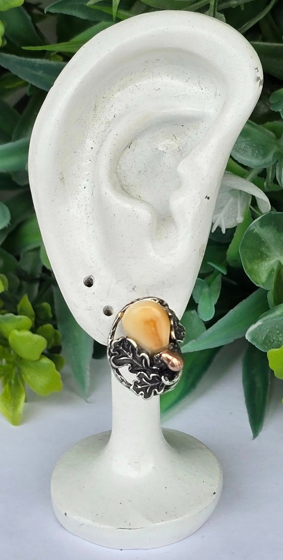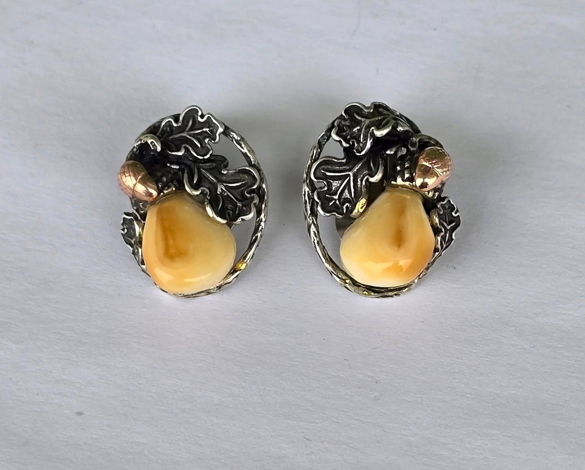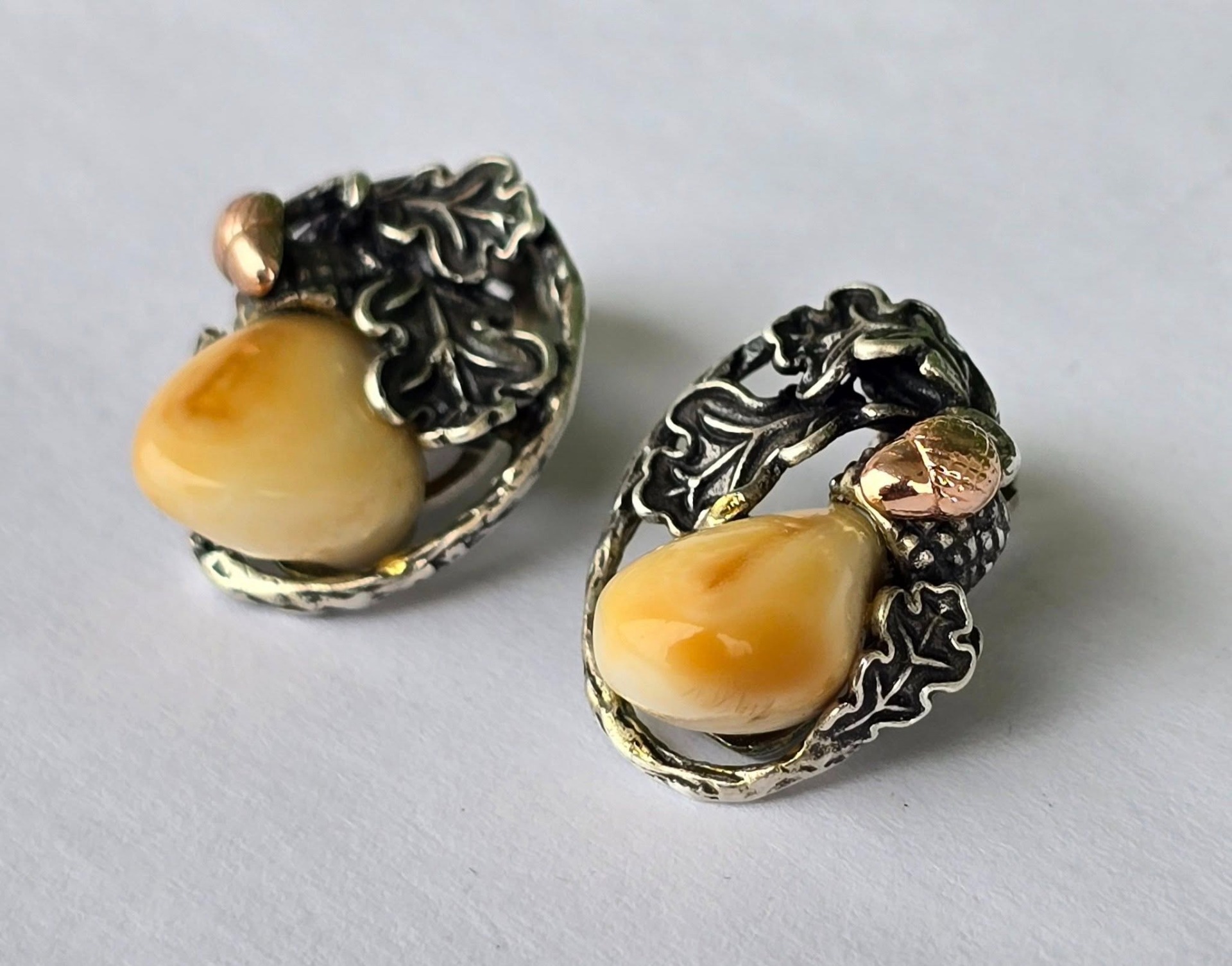 Cercei vechi Grandel, din argint, cu dinți de cerb, frumos lucrați manual, stilizați cu ghinde din aur de 14K și frunze de stejar, cu închidere de tip "clips"