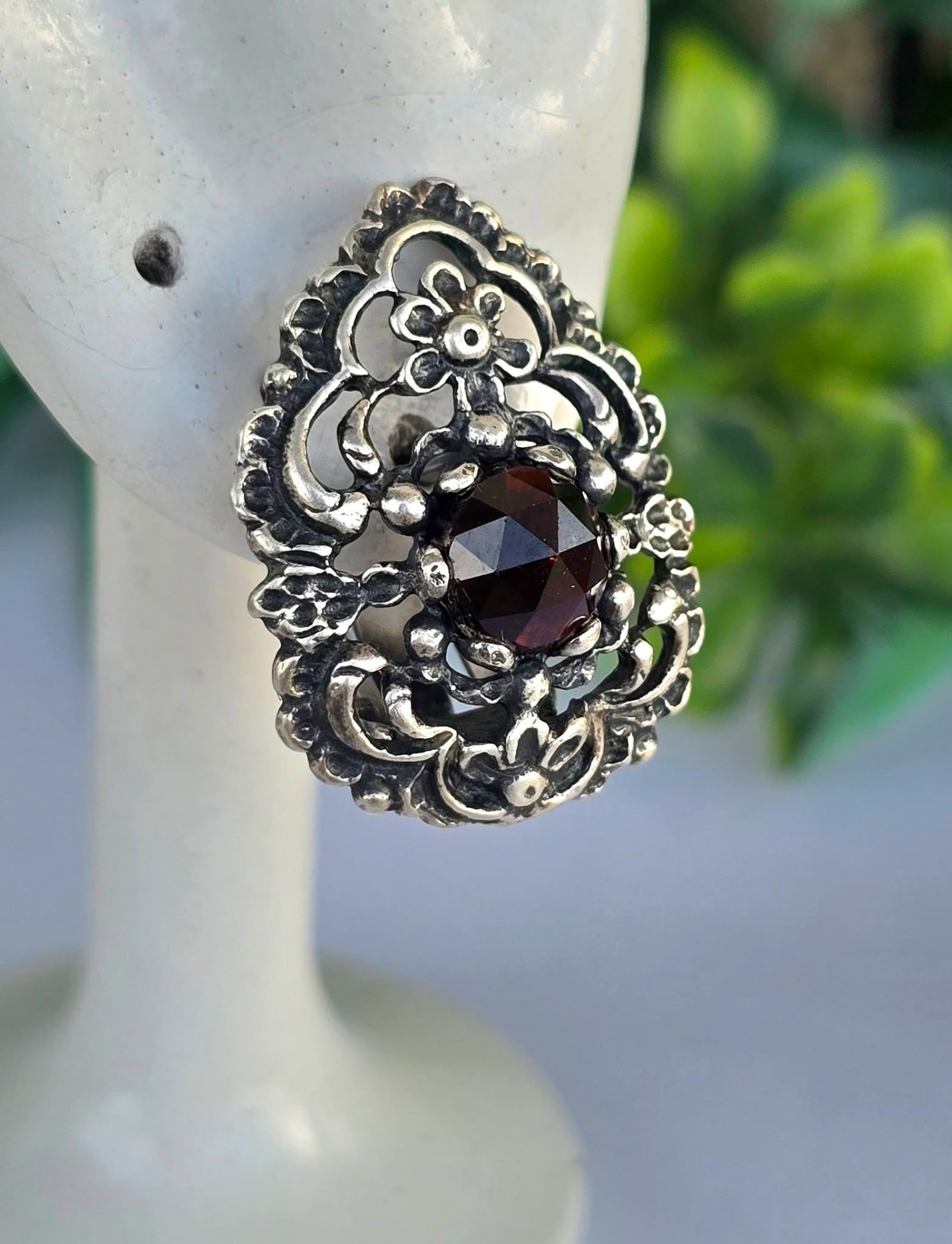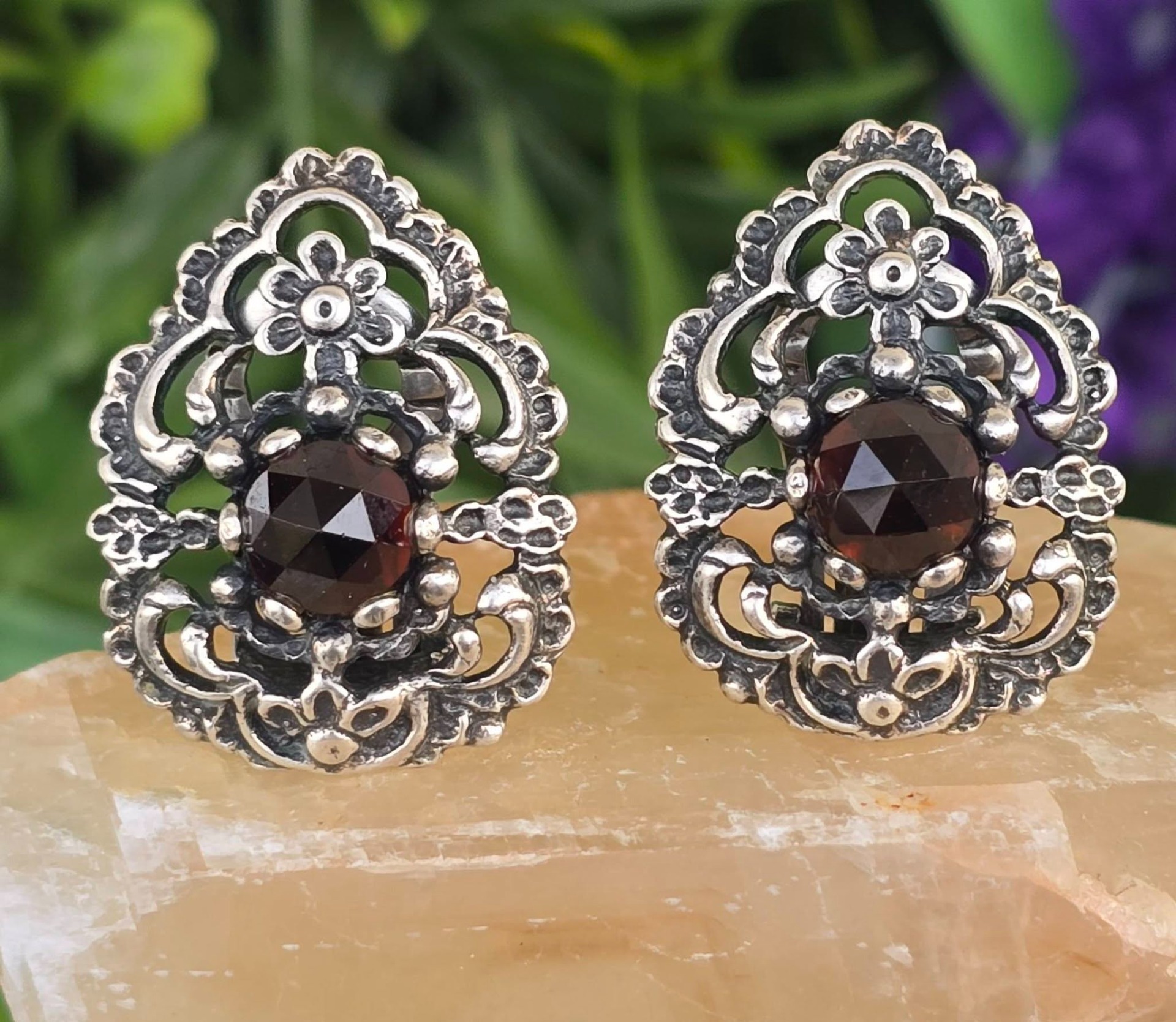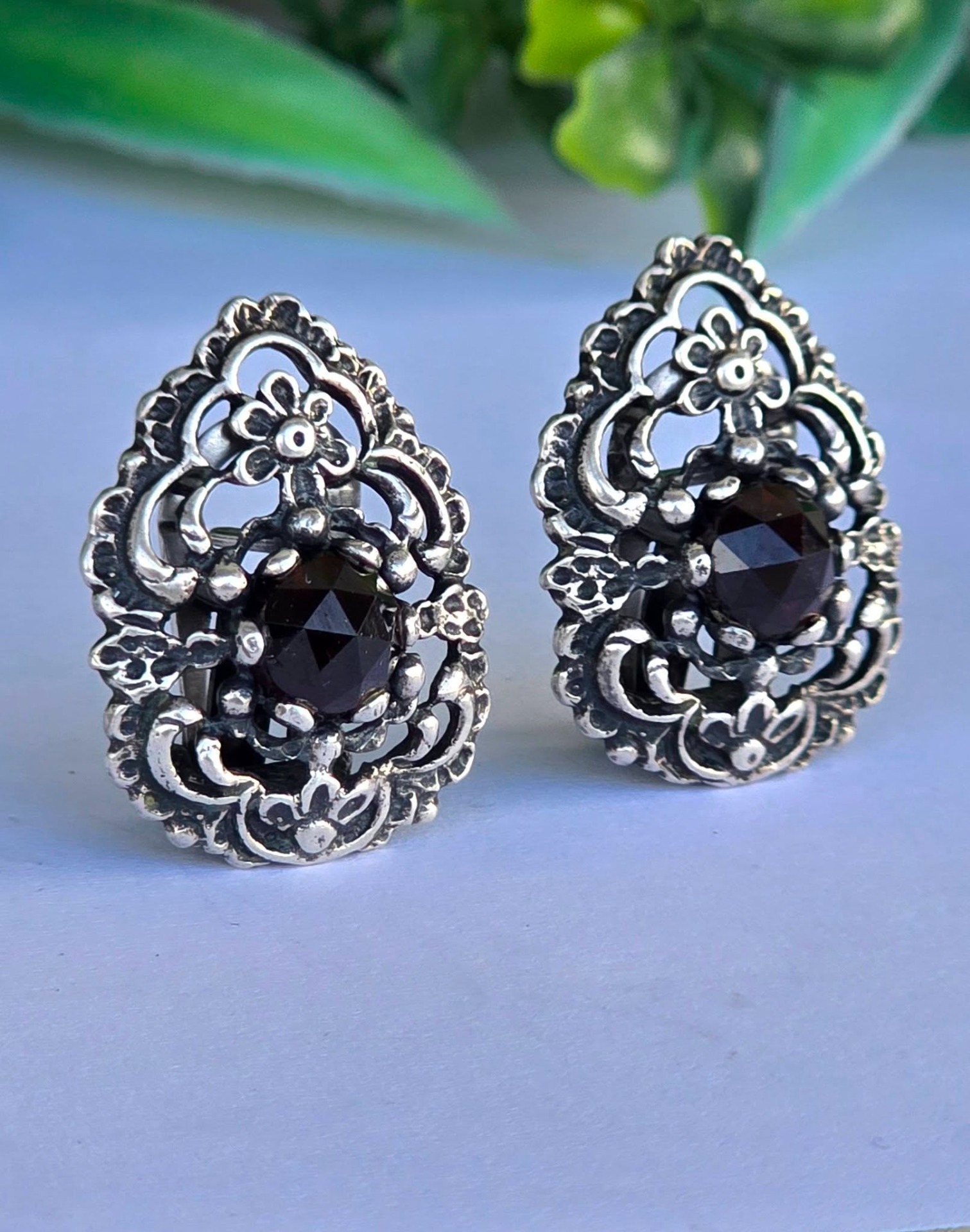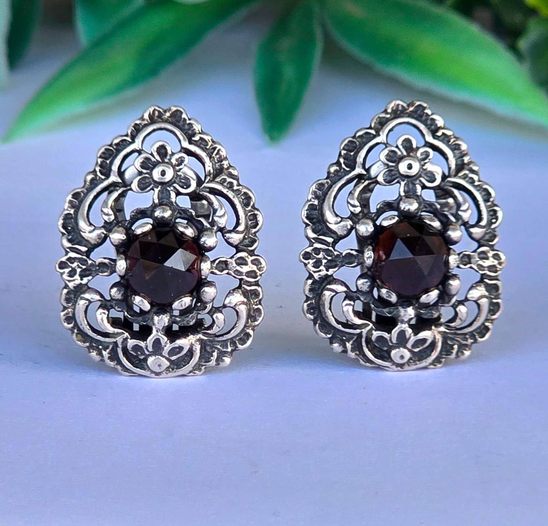 Cercei vechi impresionanți, din argint, cu granate Bohemia naturale, manufactură deosebită în motiv floral (încep.sec.XX, Austria).