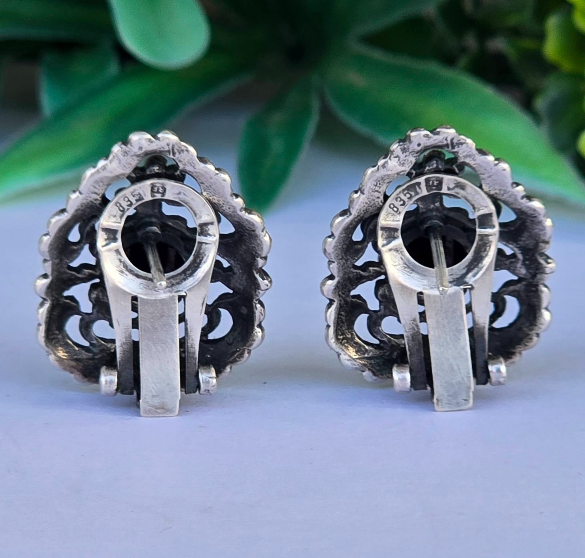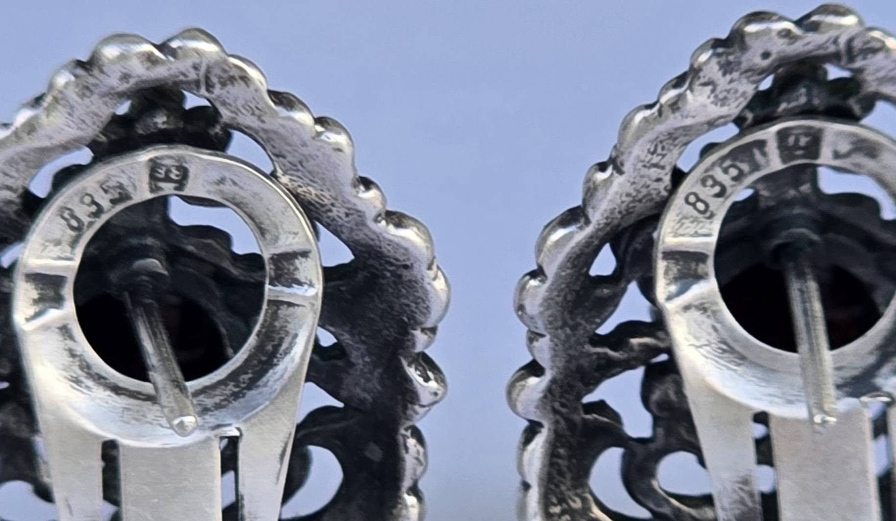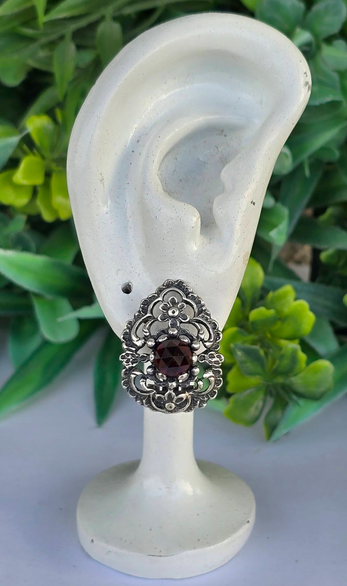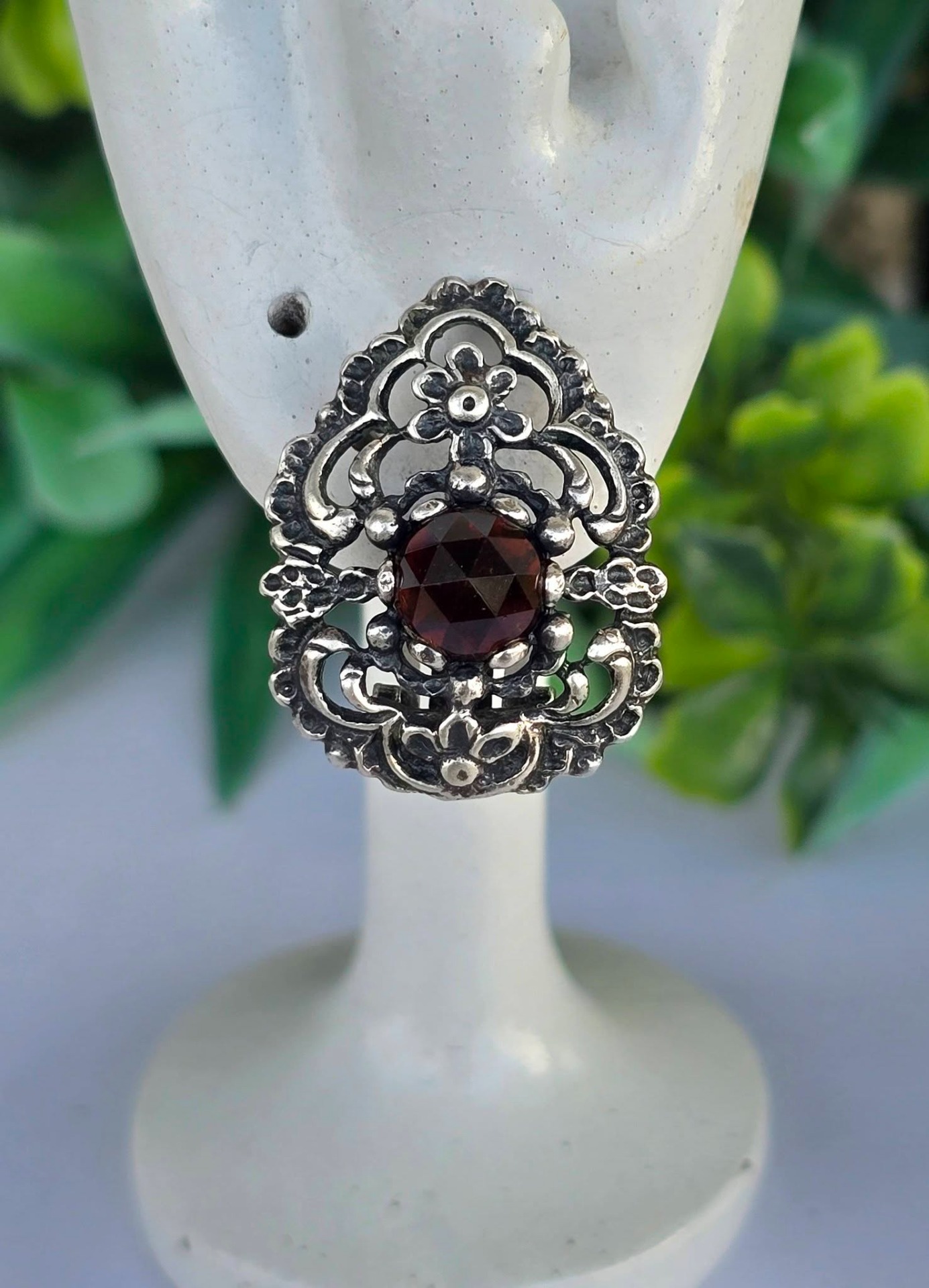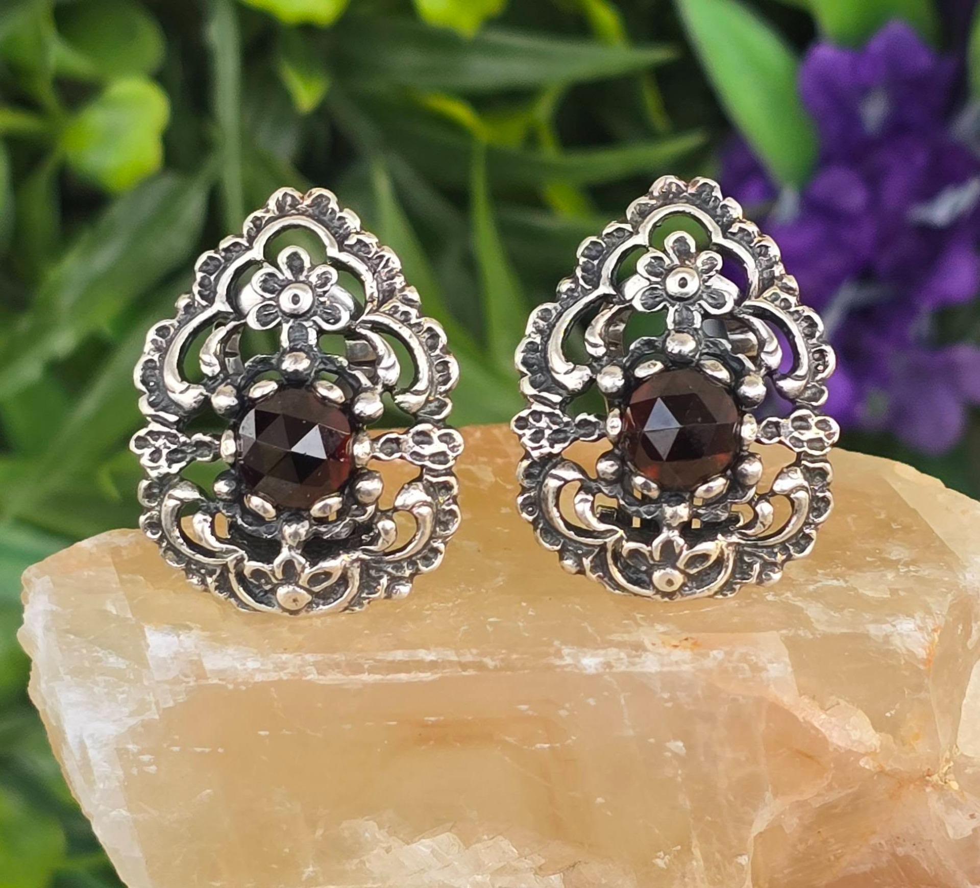 Cercei vechi impresionanți, din argint, cu granate Bohemia naturale, manufactură deosebită în motiv floral (încep.sec.XX, Austria).