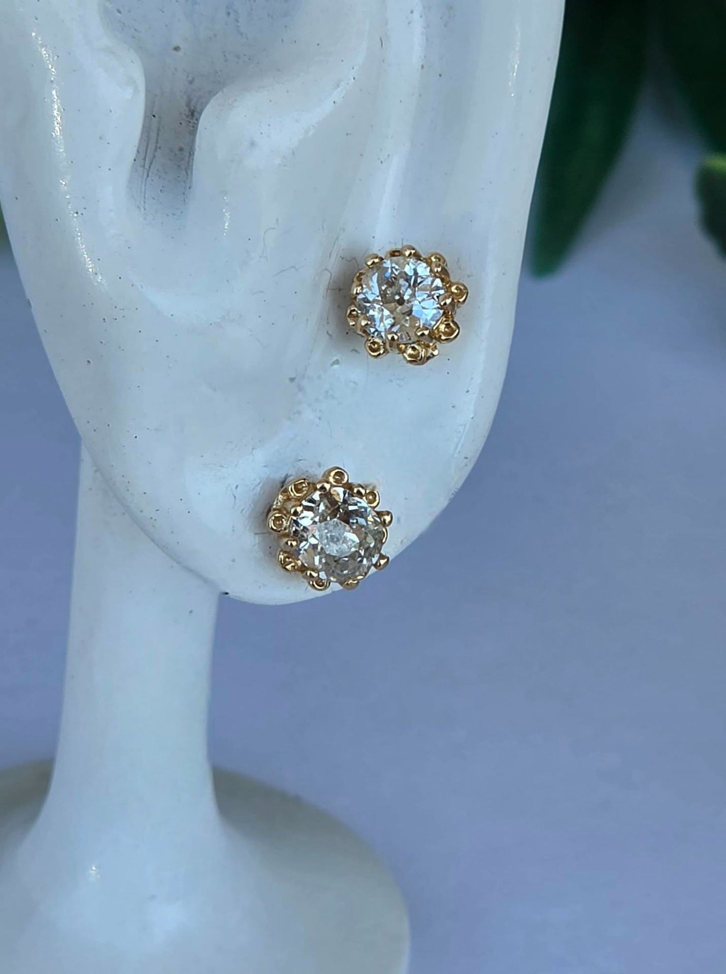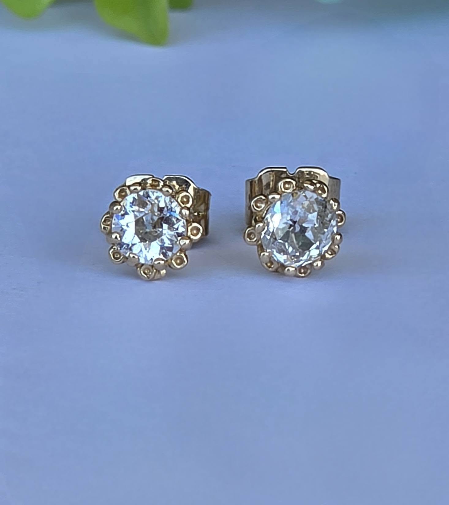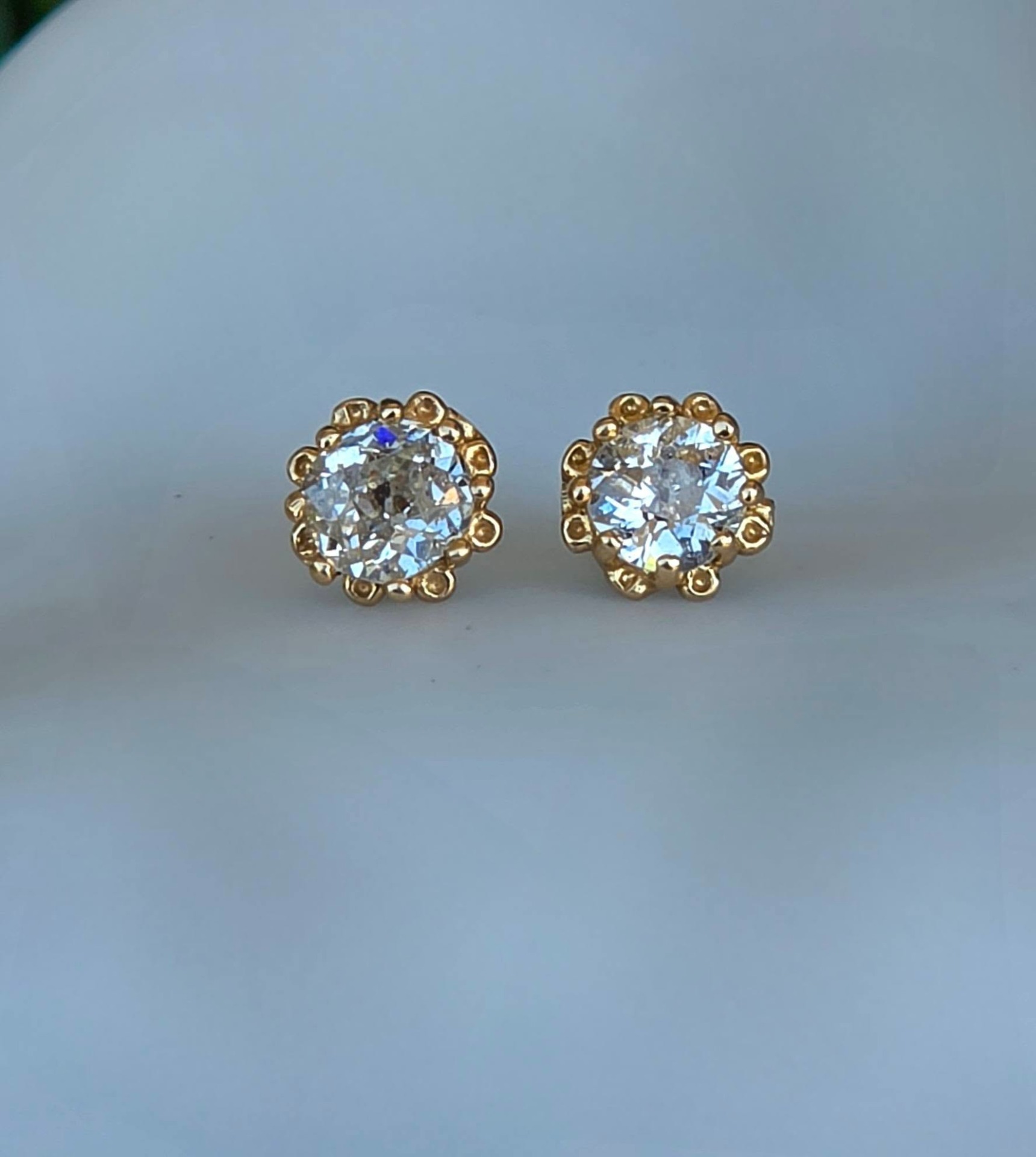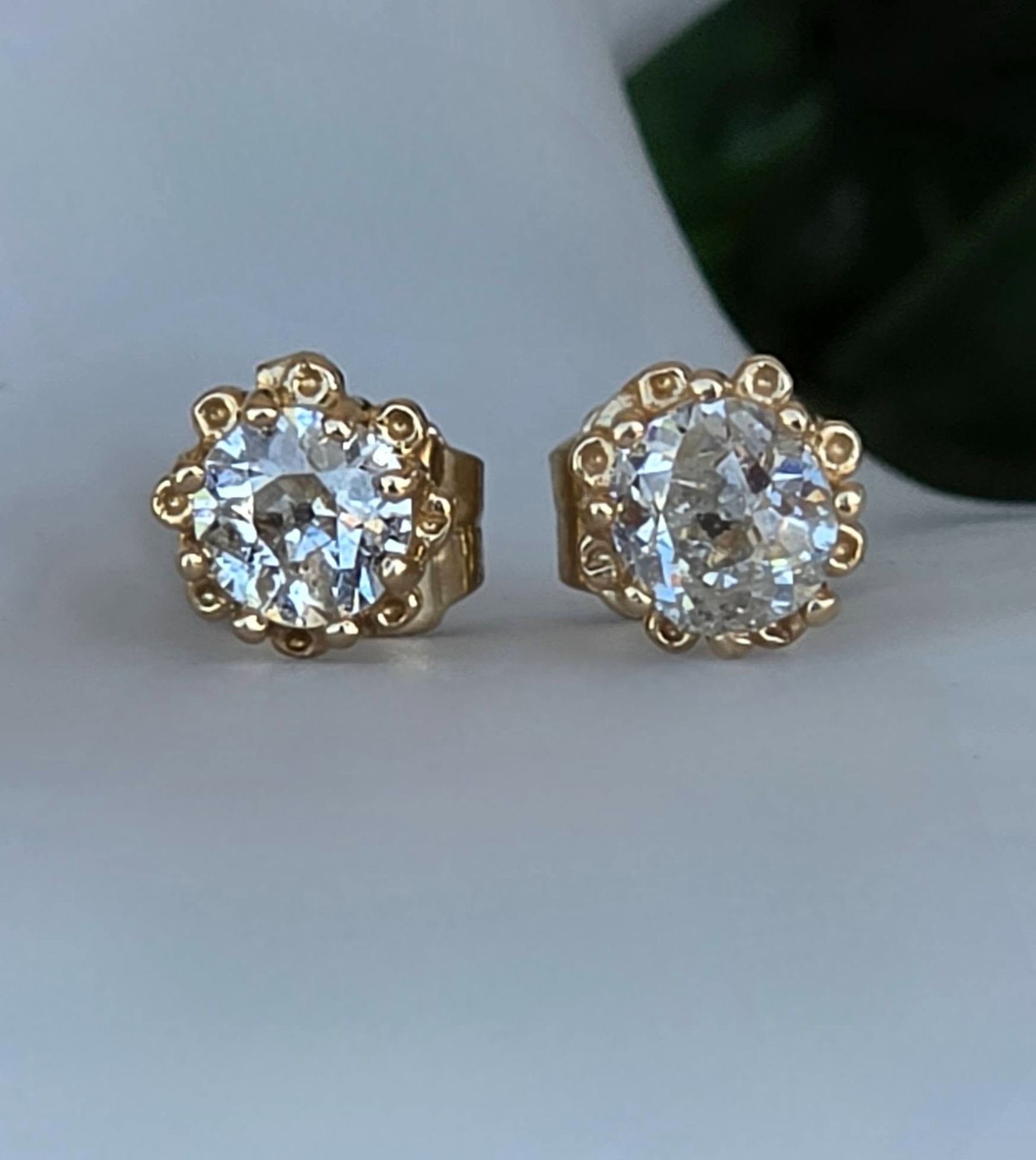 Cercei vechi spectaculoși, din aur de 14K, cu 2 diamante naturale "Old European Cut" (0.83ct), cu dispersie foarte bună a luminii ("foc"), care oferă reflexii albăstrui remarcabile, manufactură deosebită, cu montură de tip „halo” perlat, care protejează piatra și îi conferă un volum vizual mai mare.