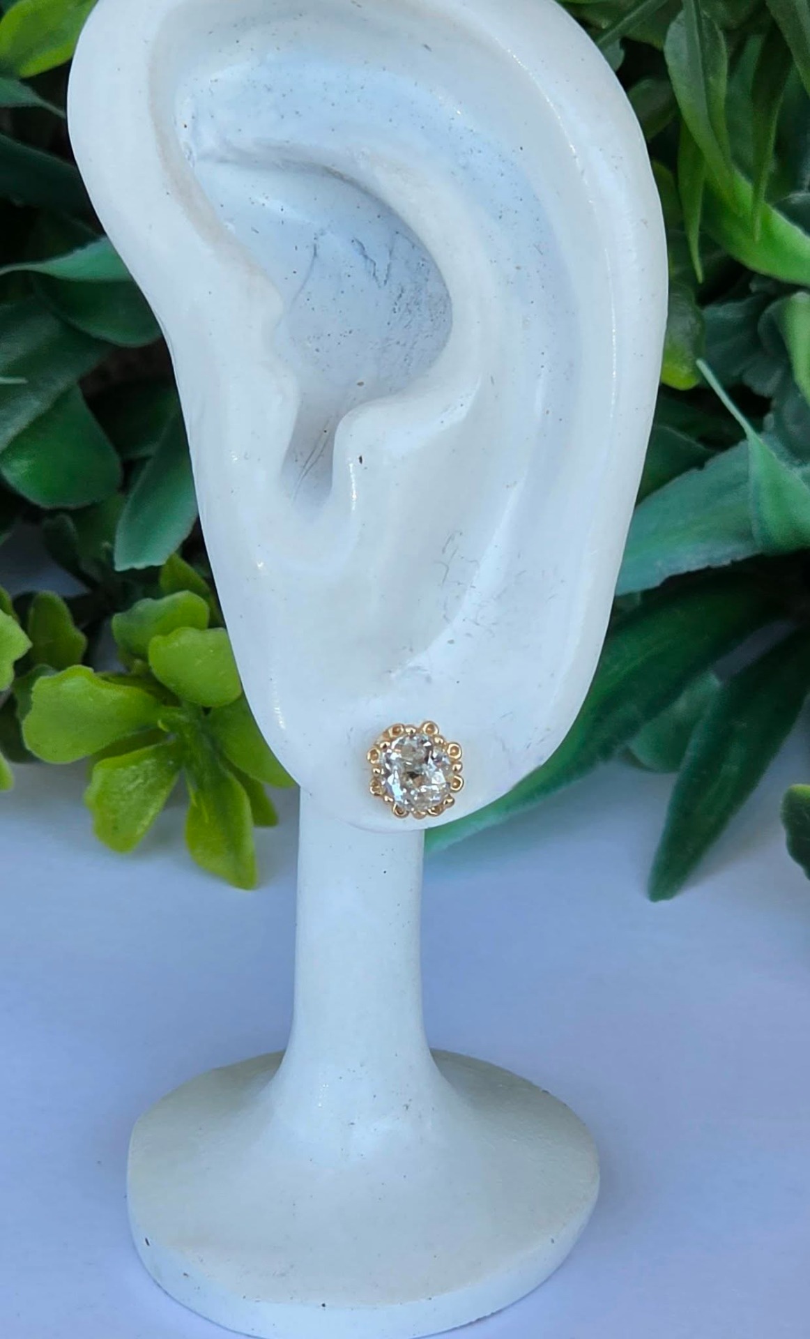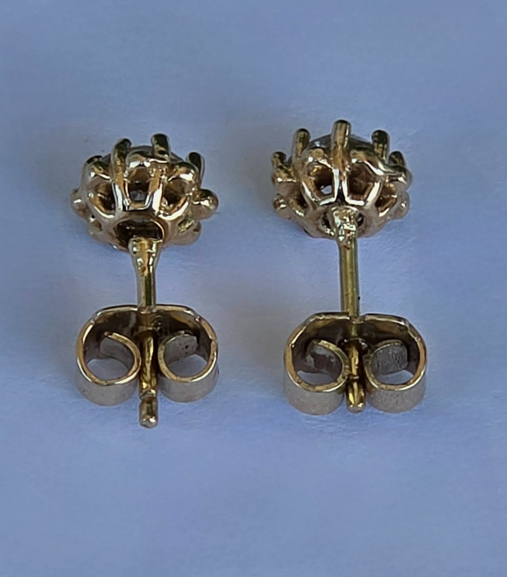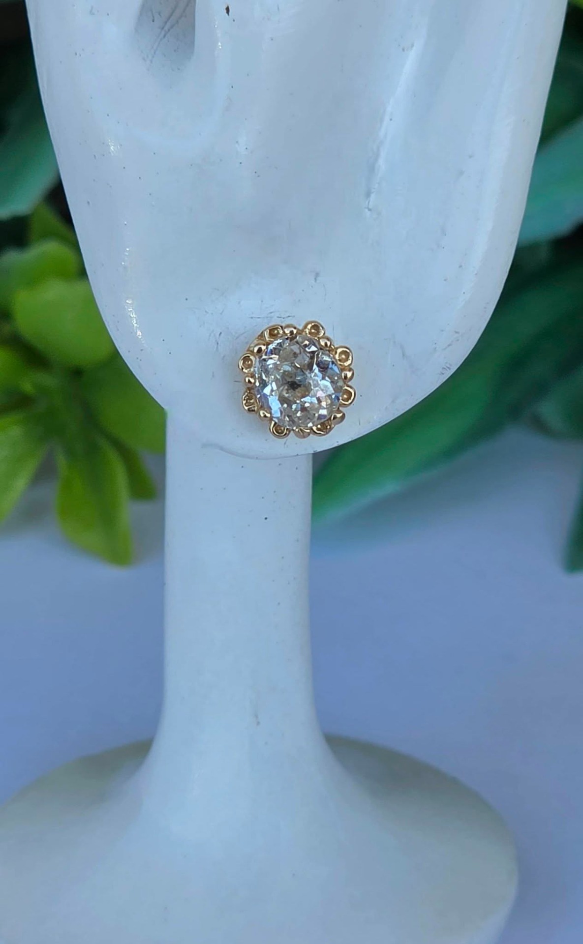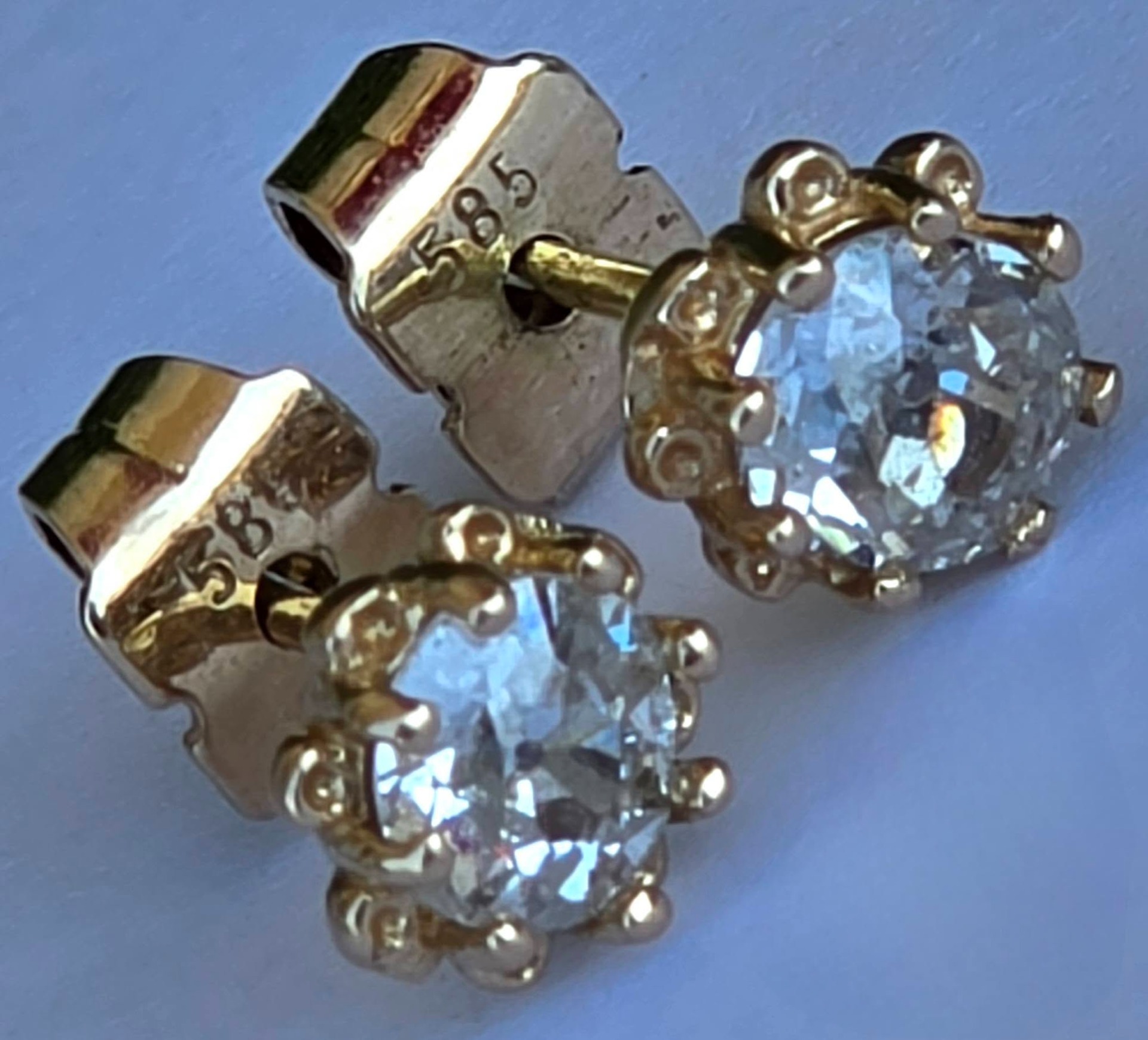 Cercei vechi spectaculoși, din aur de 14K, cu 2 diamante naturale "Old European Cut" (0.83ct), cu dispersie foarte bună a luminii ("foc"), care oferă reflexii albăstrui remarcabile, manufactură deosebită, cu montură de tip „halo” perlat, care protejează piatra și îi conferă un volum vizual mai mare.