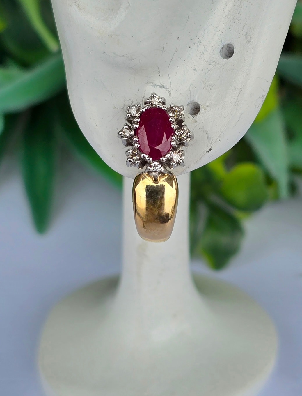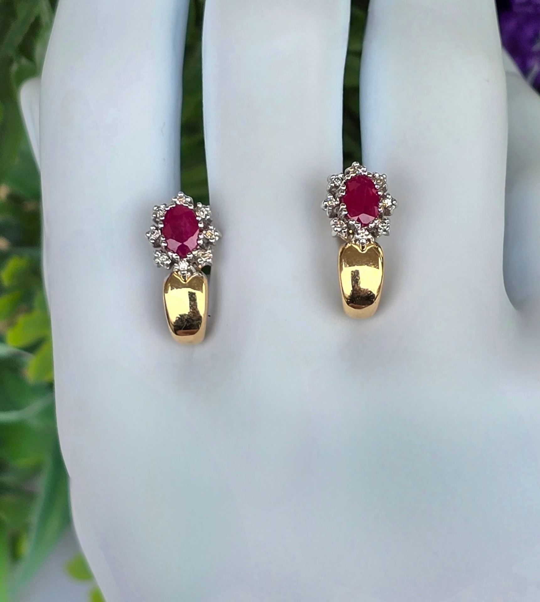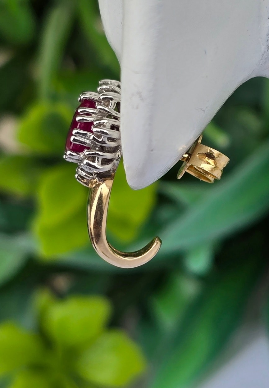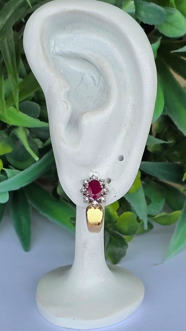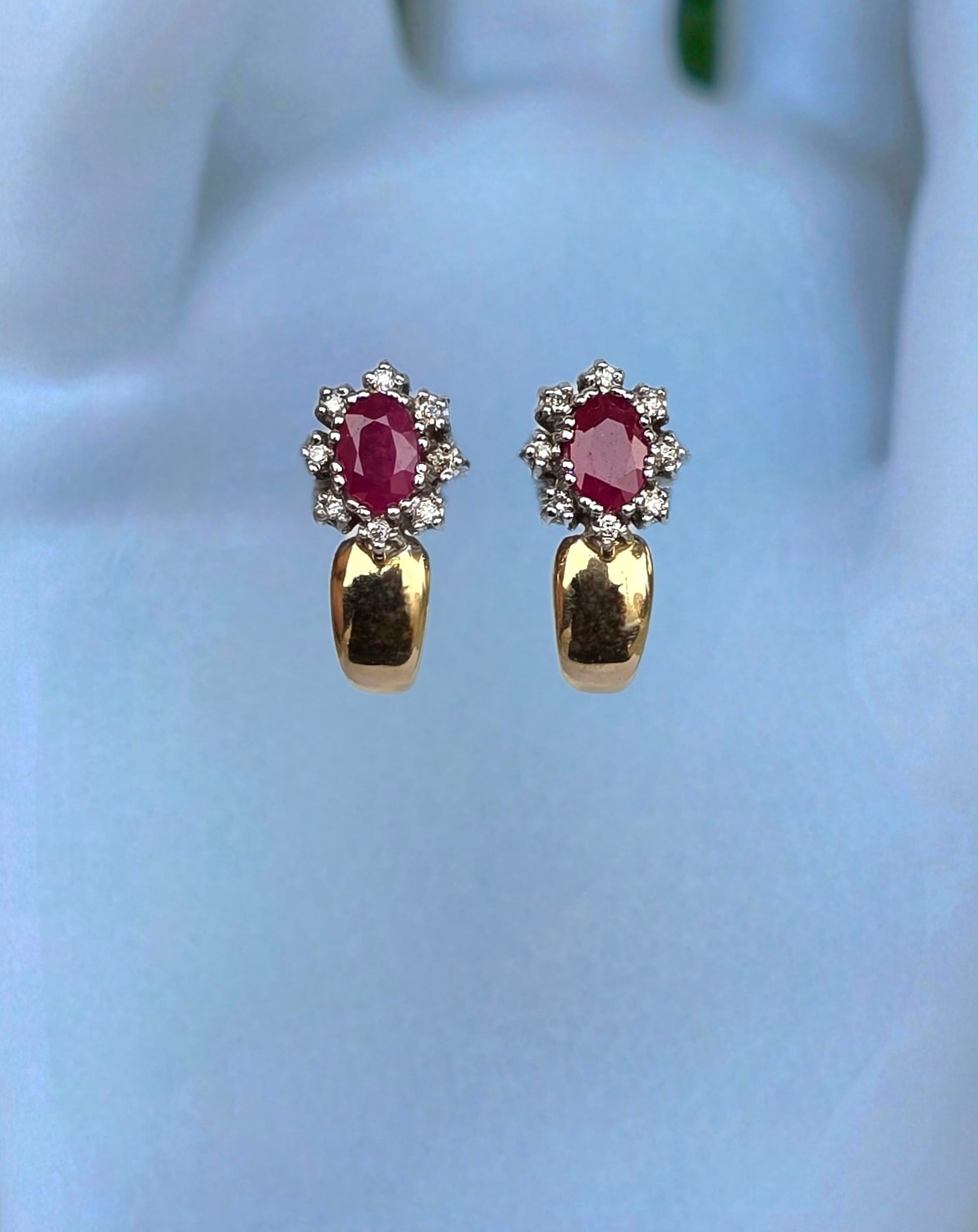 Cercei vechi spectaculoși, din aur de 14K, cu rubine și 16 diamante naturale.
