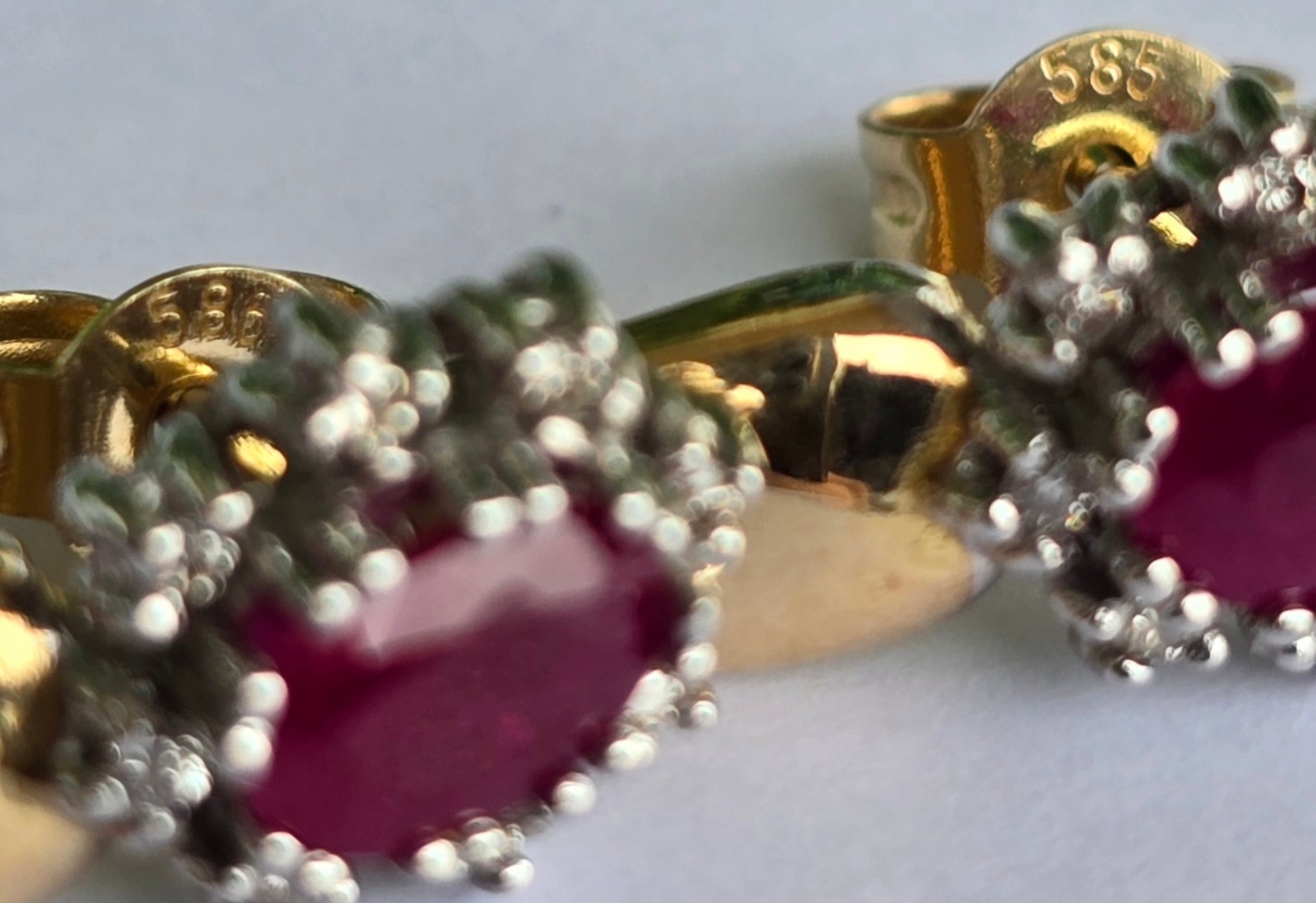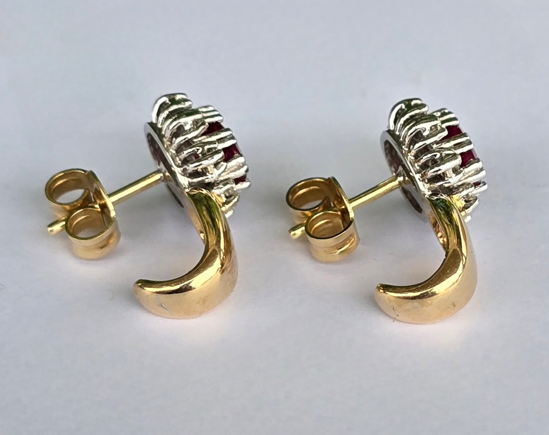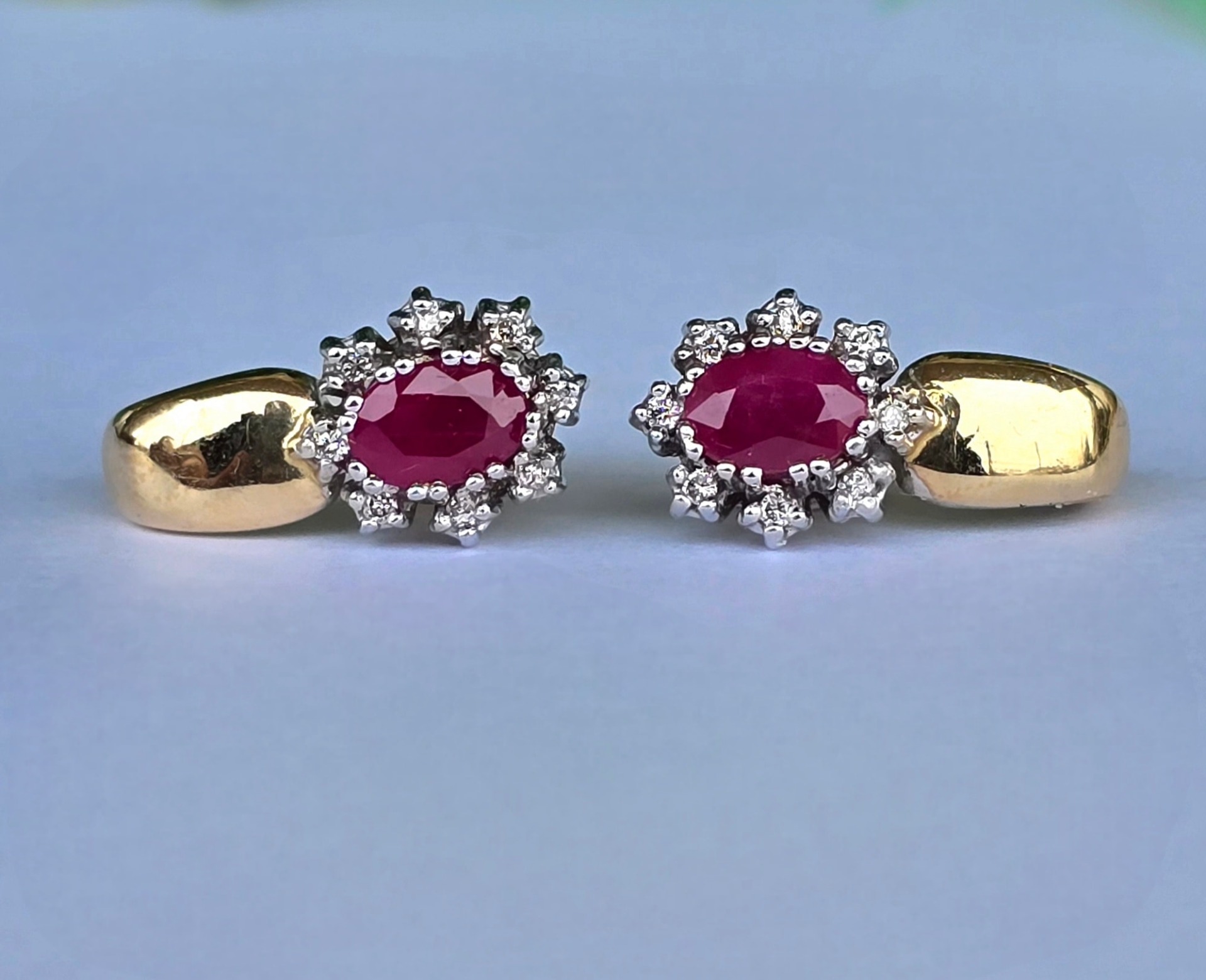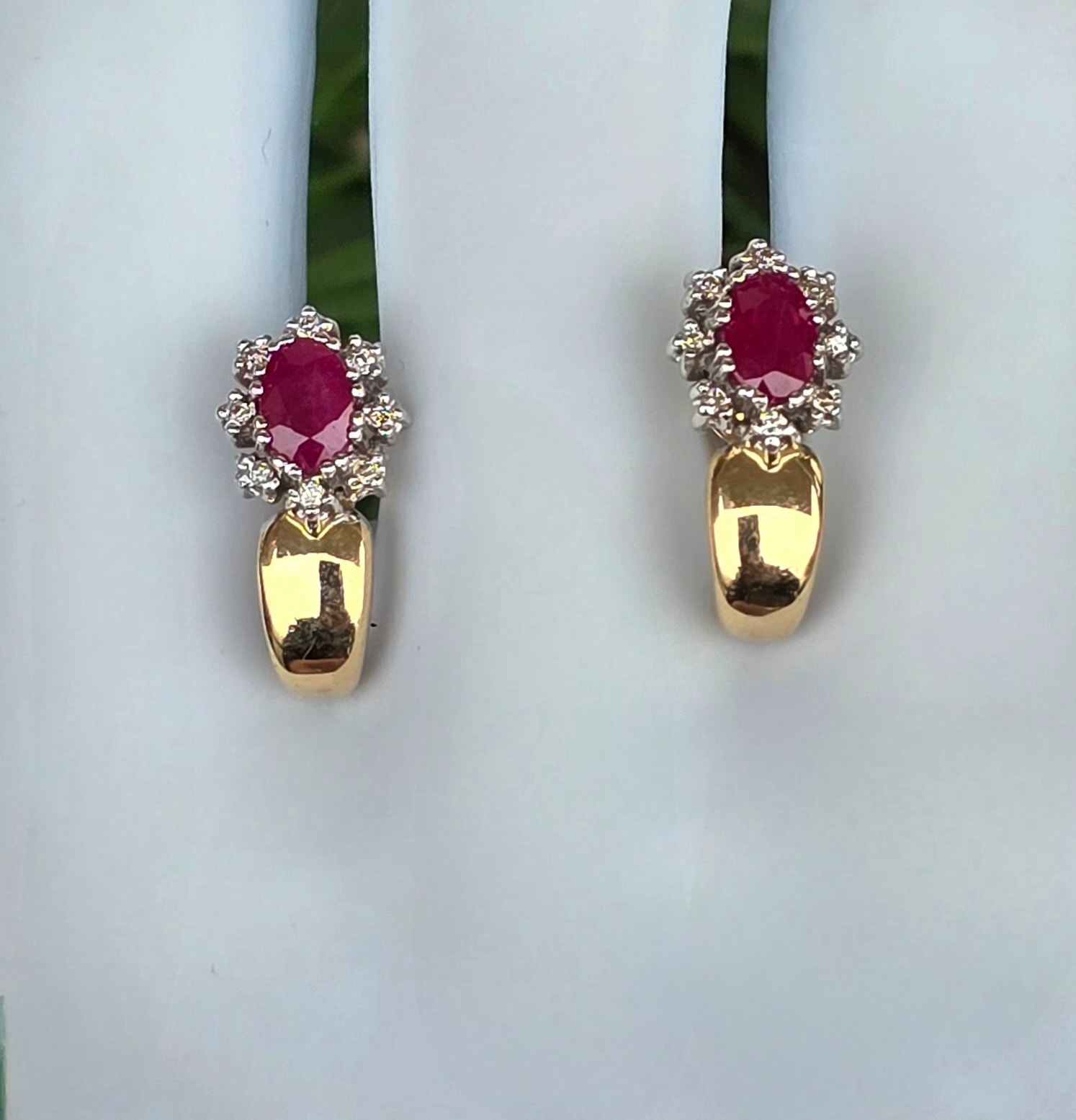 Cercei vechi spectaculoși, din aur de 14K, cu rubine și 16 diamante naturale.