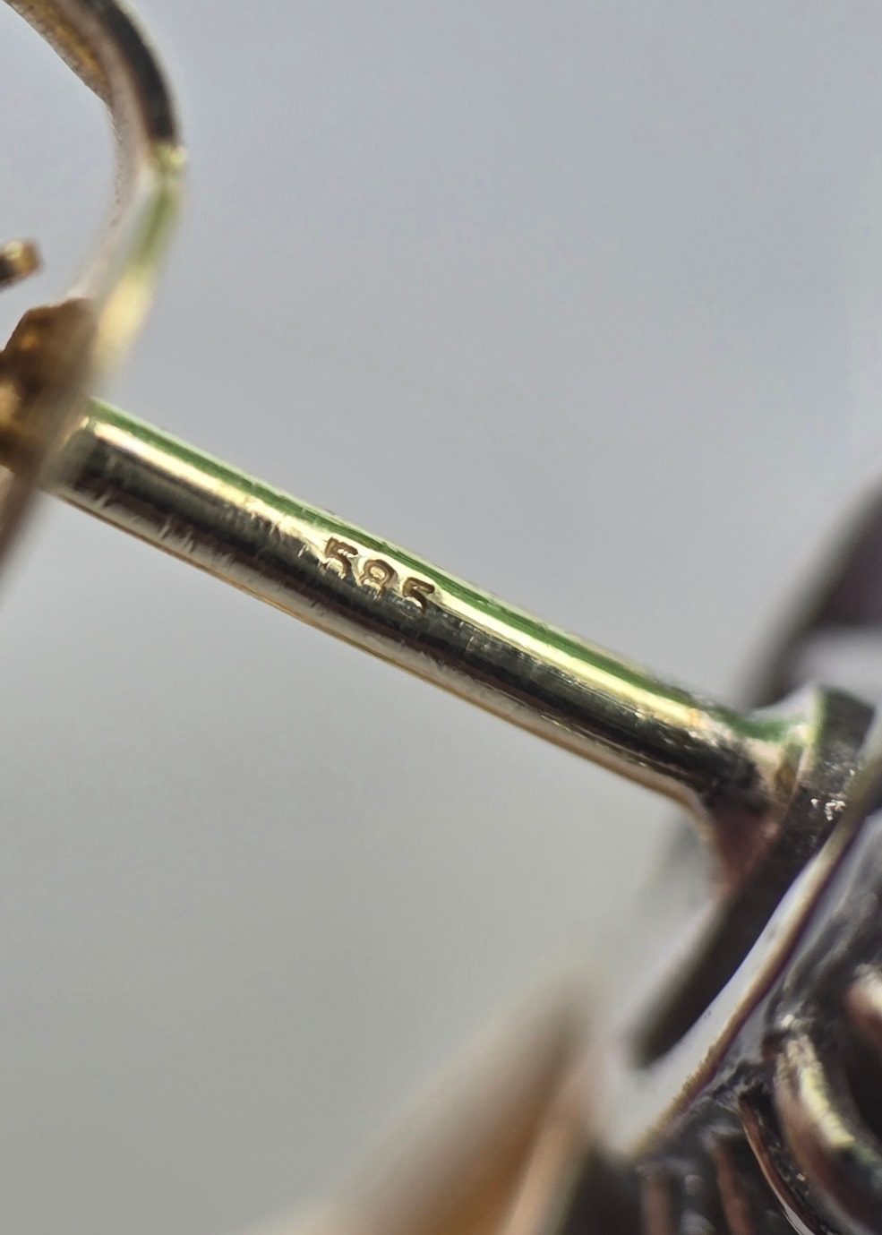 Prezintă marcaje 585 pentru puritate aur de 14K.