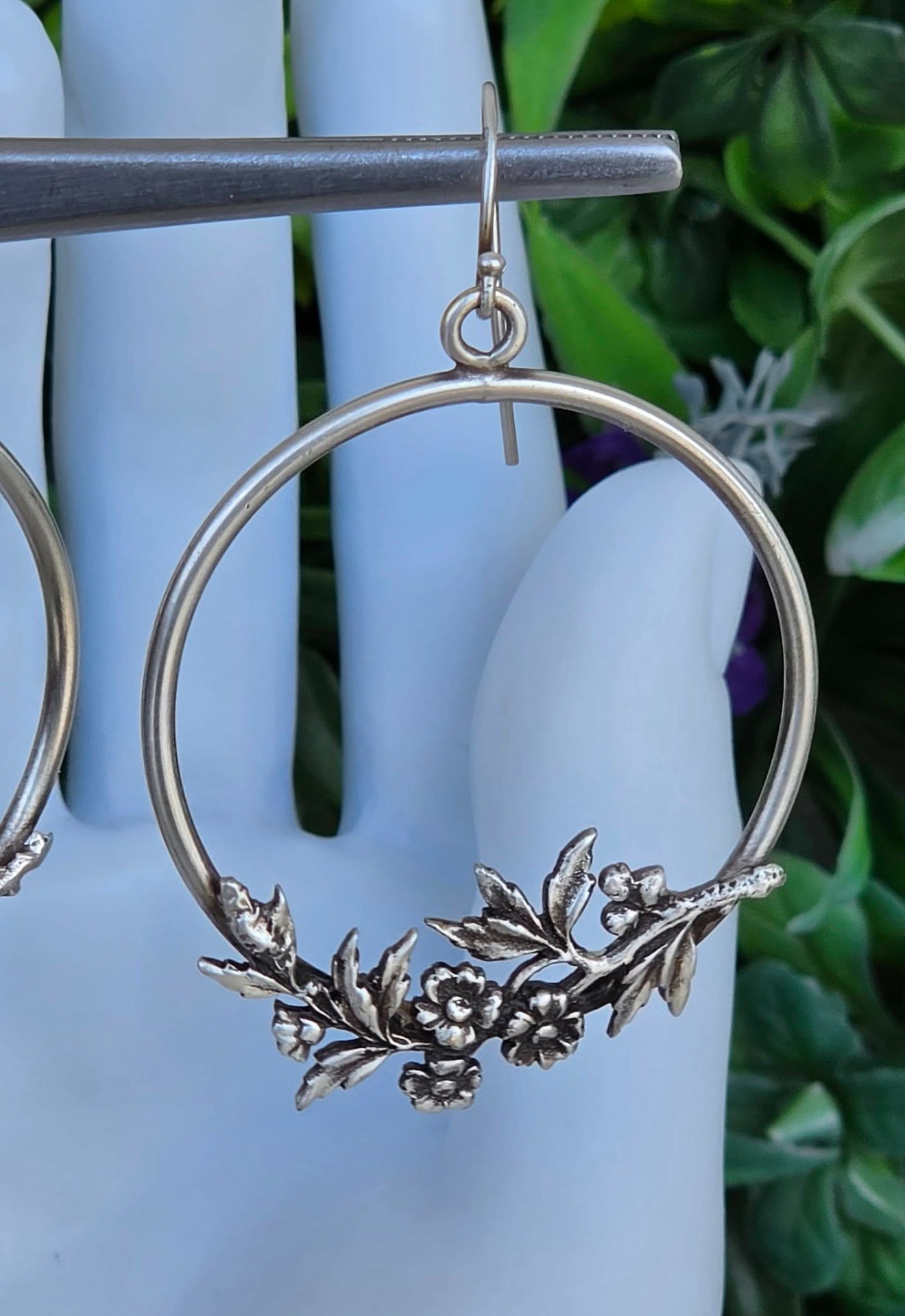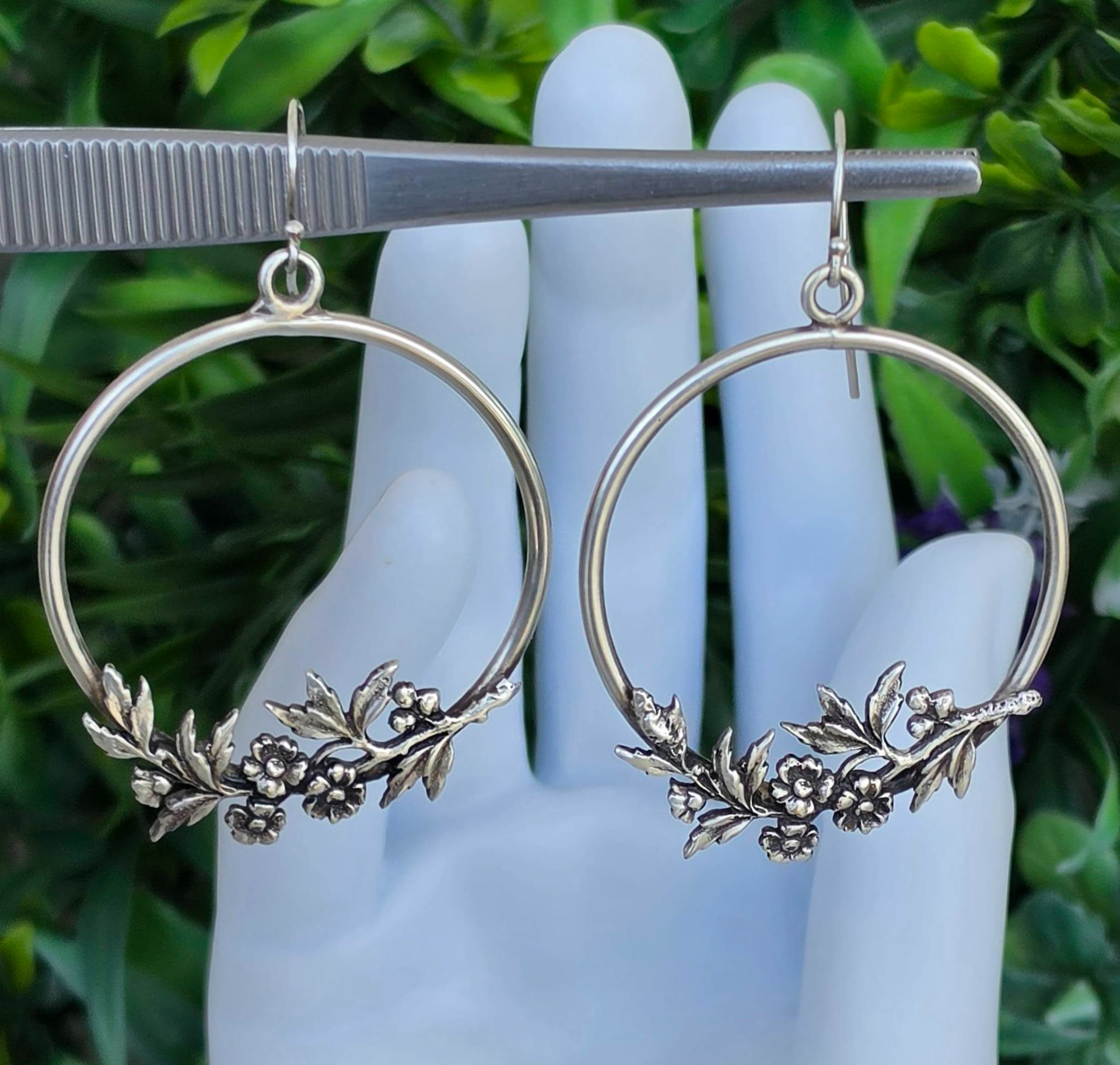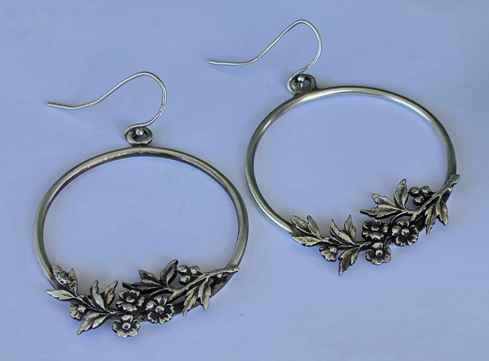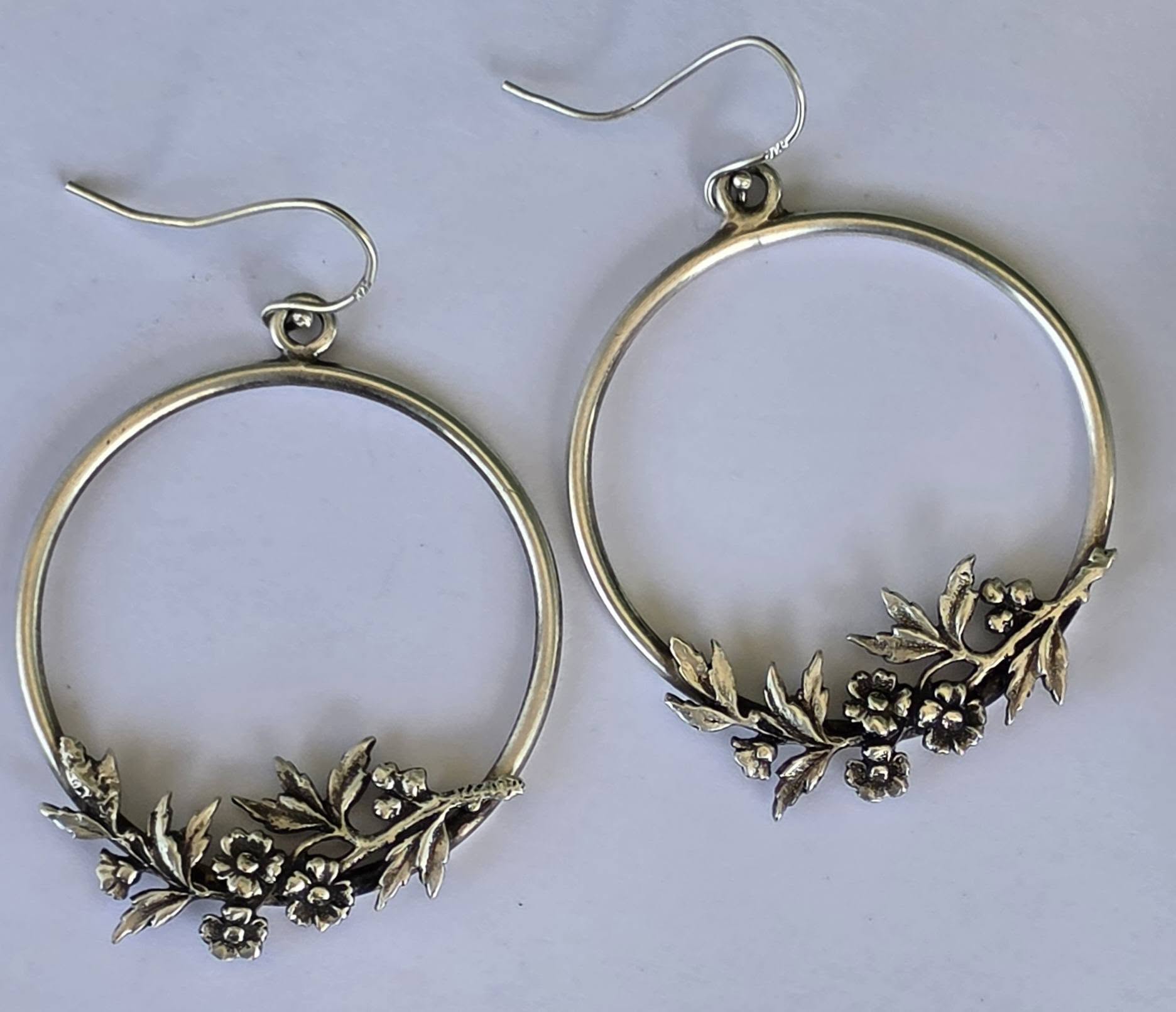 Cercei vechi spectaculoși, din metal argintat și tortițe din argint, manufactură în motiv floral în stil Art Nouveau.
