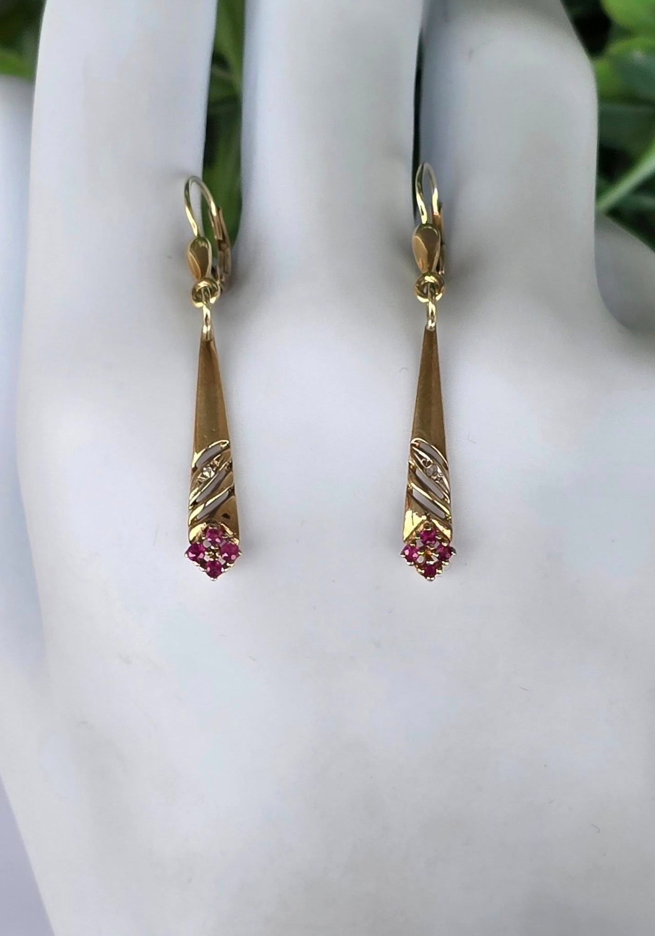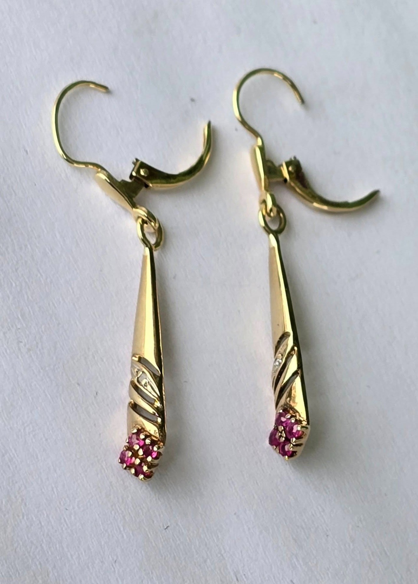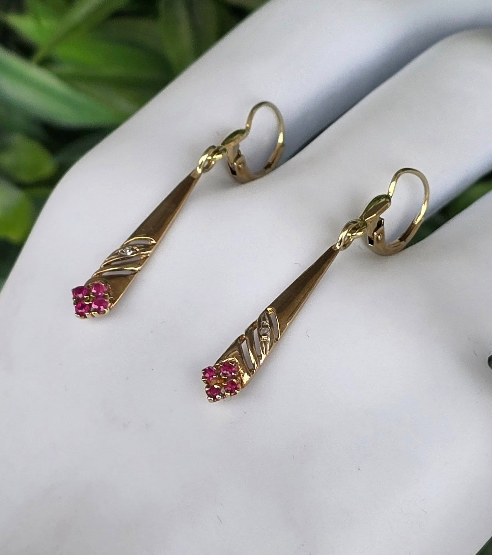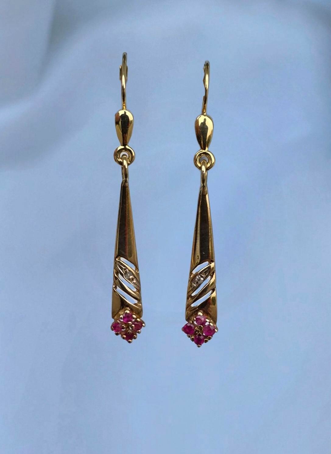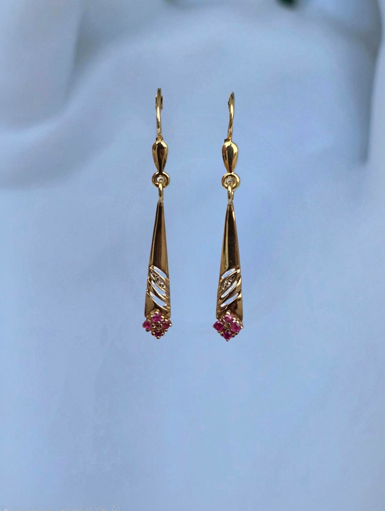 Cercei vechi superbi, din aur de 14K, cu 8 rubine și 2 diamante naturale.
