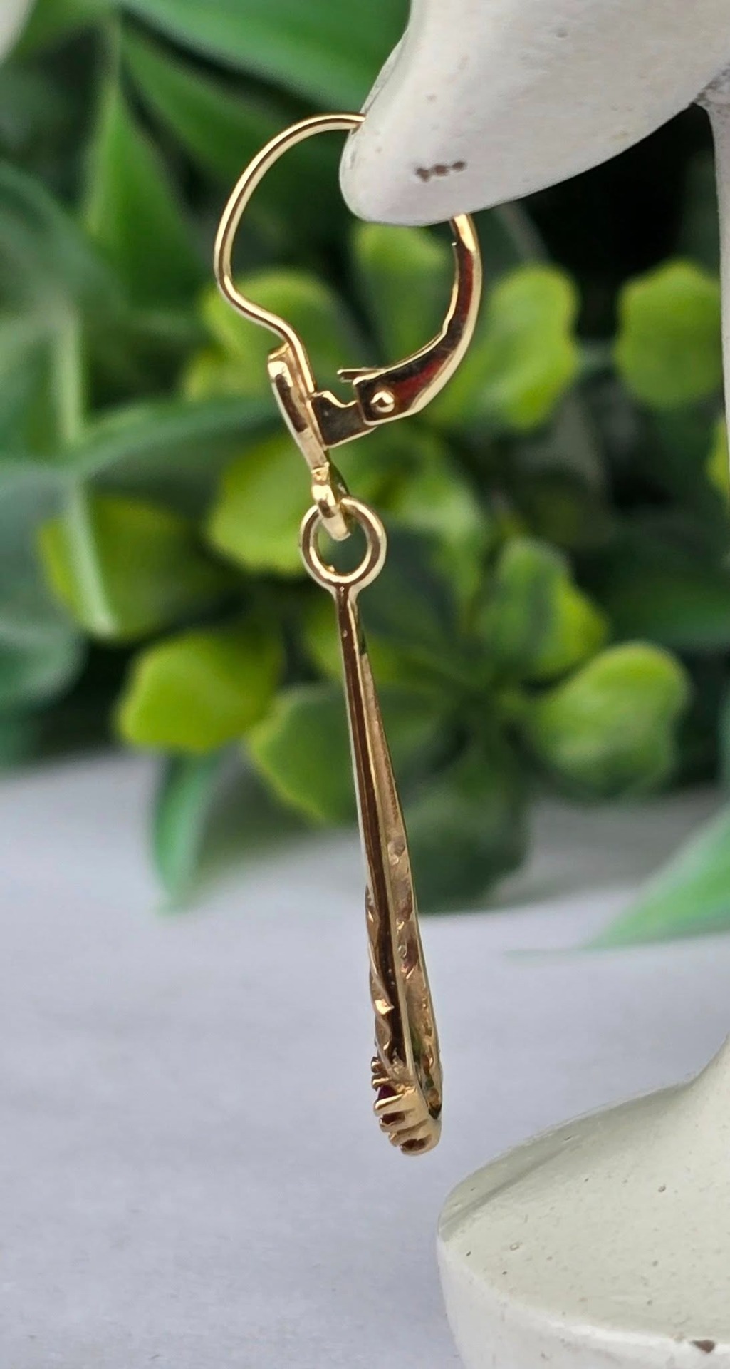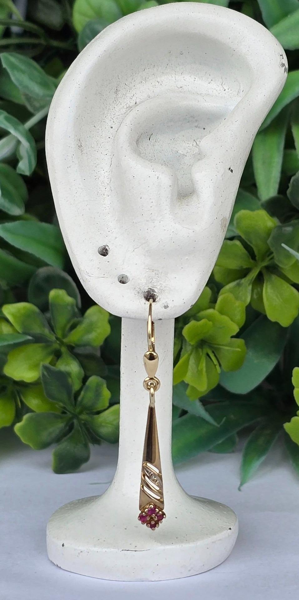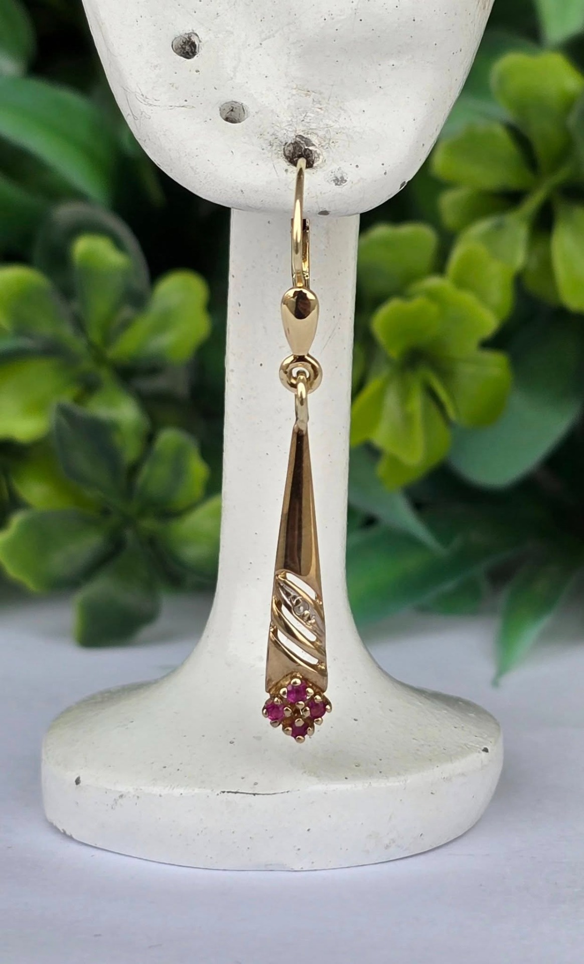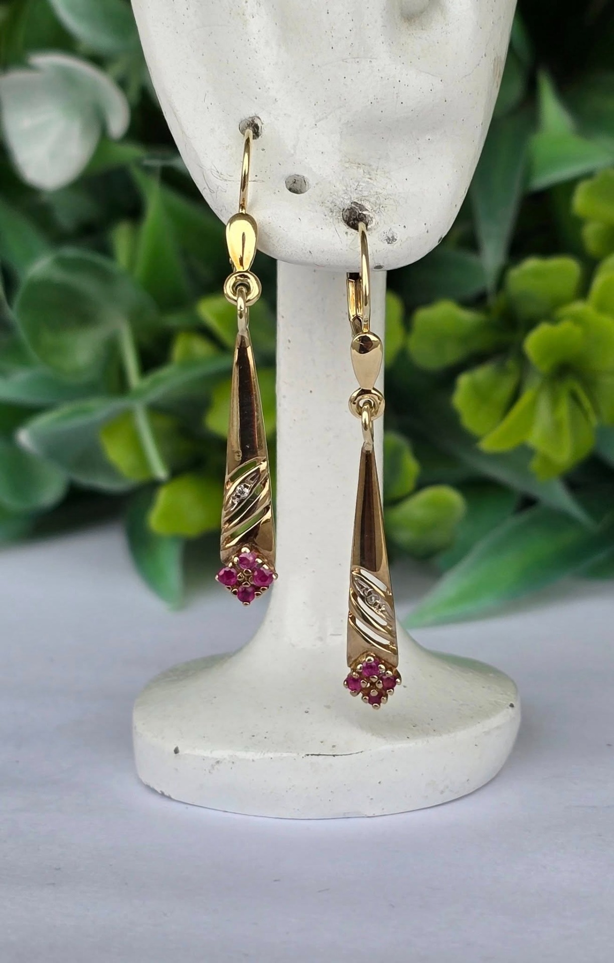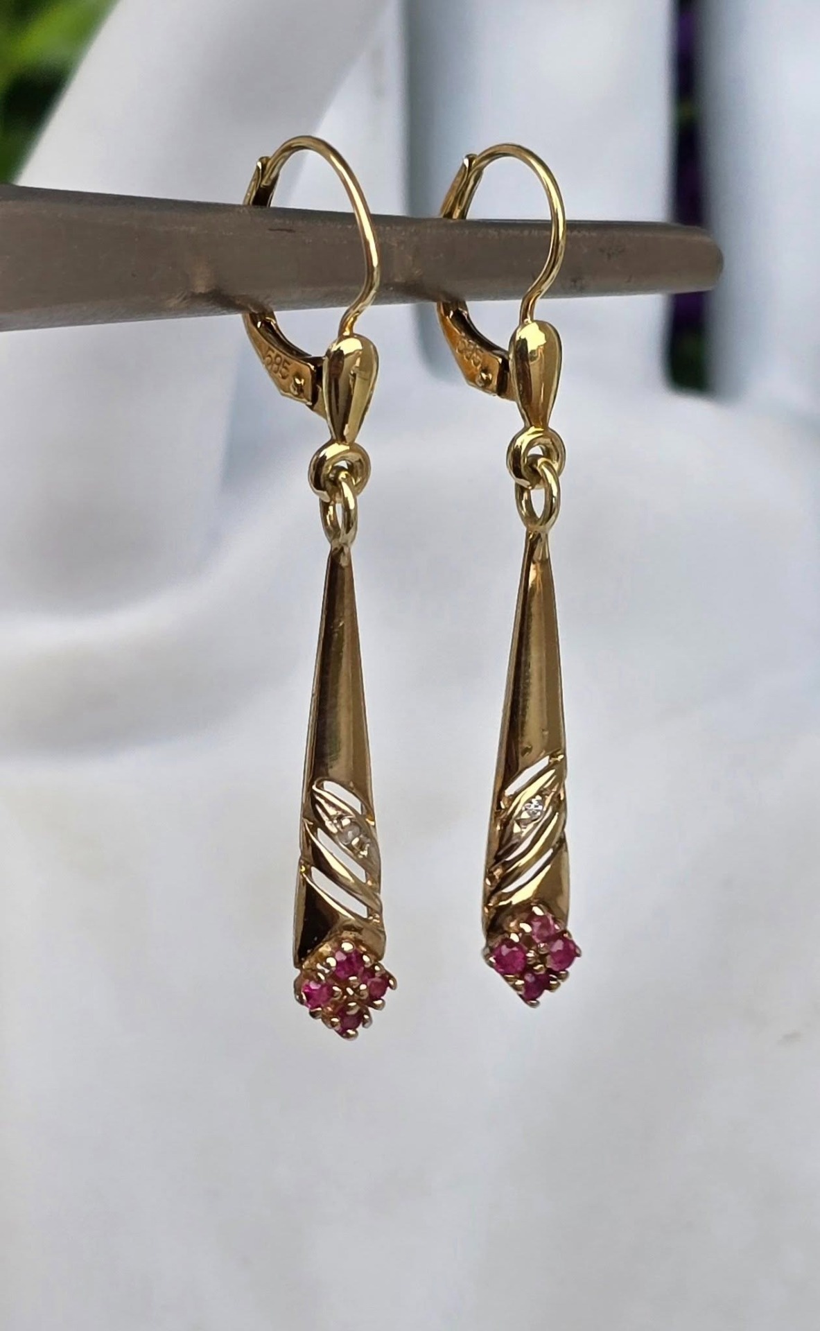 Cercei vechi superbi, din aur de 14K, cu 8 rubine și 2 diamante naturale.