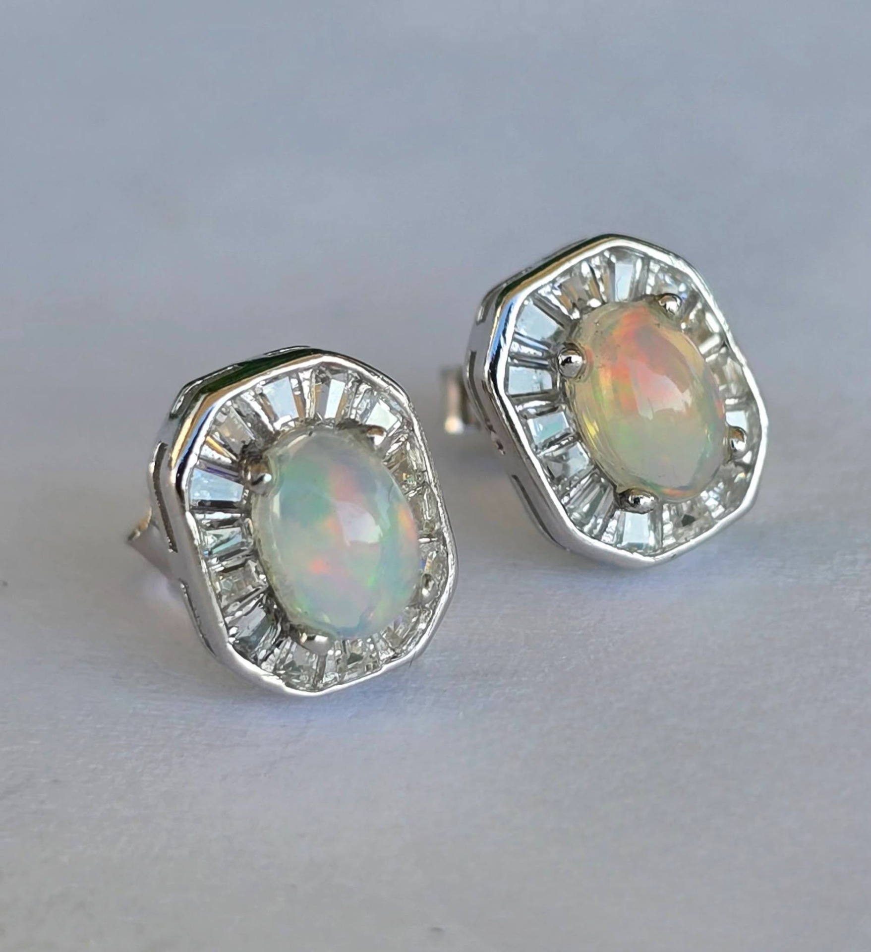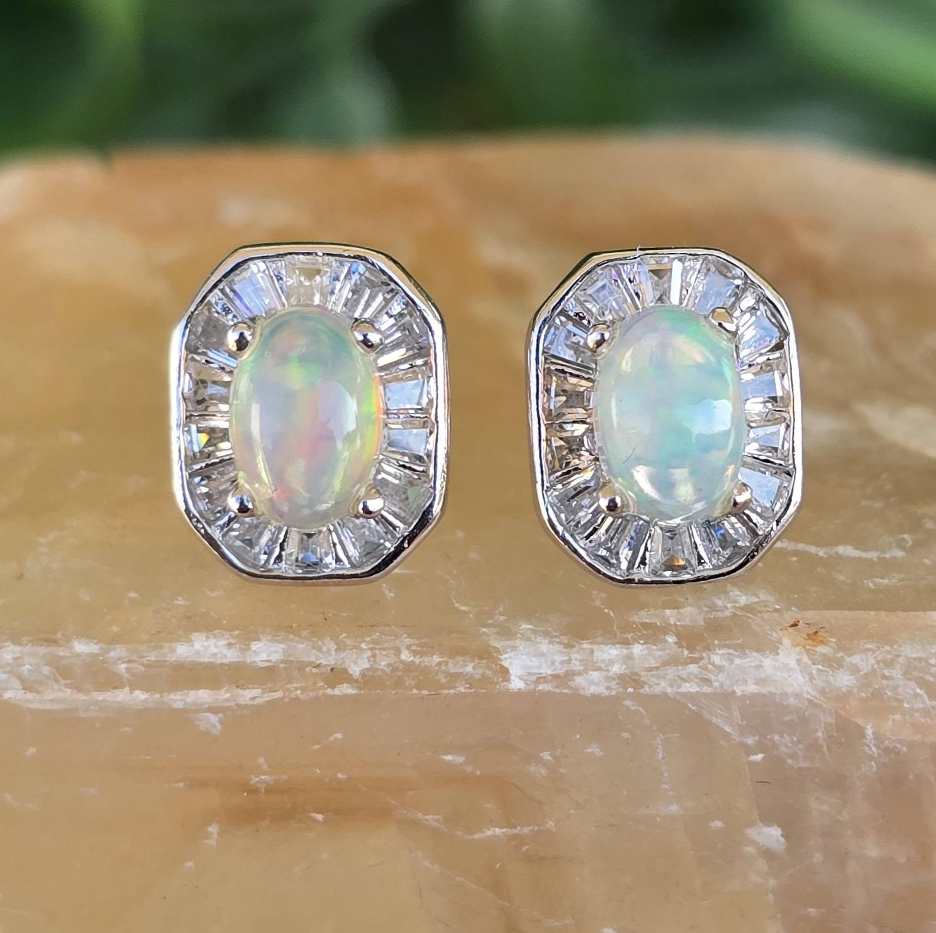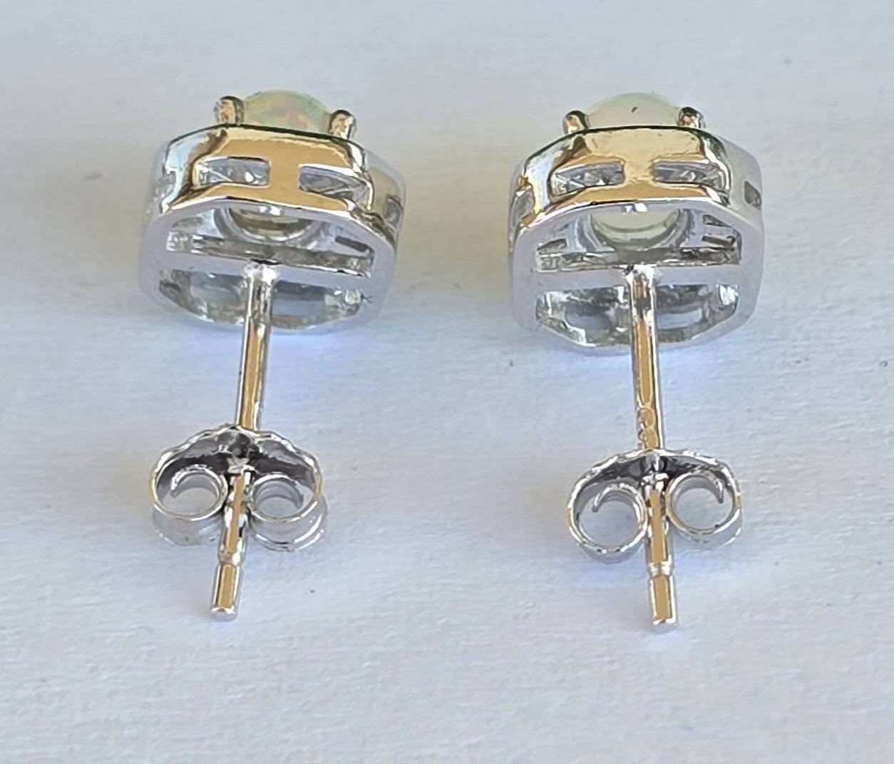 Cercel contemporani delicaţi, din argint placat cu aur alb de 18K, cu opale naturale și pietre cubic zirconia.