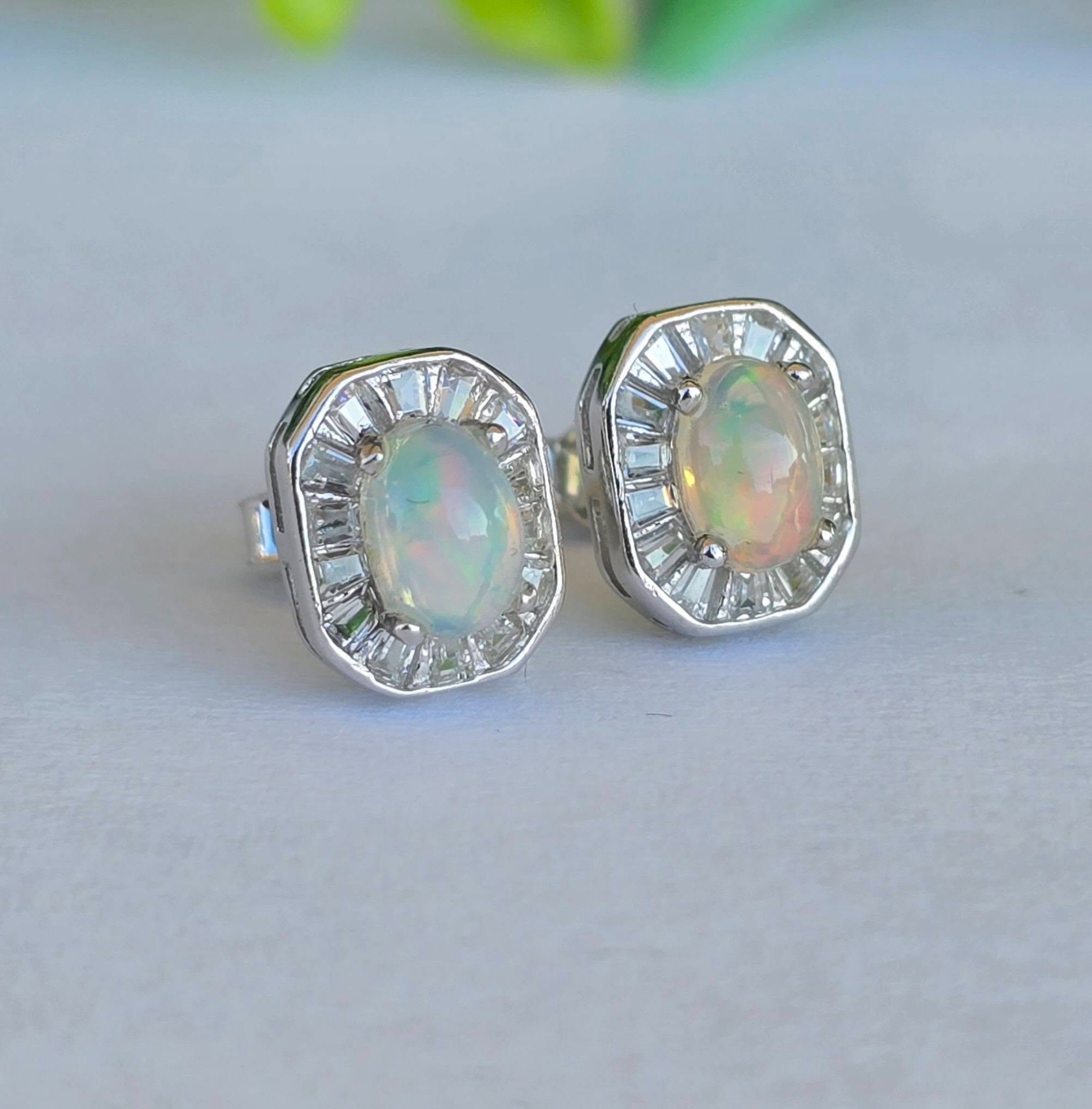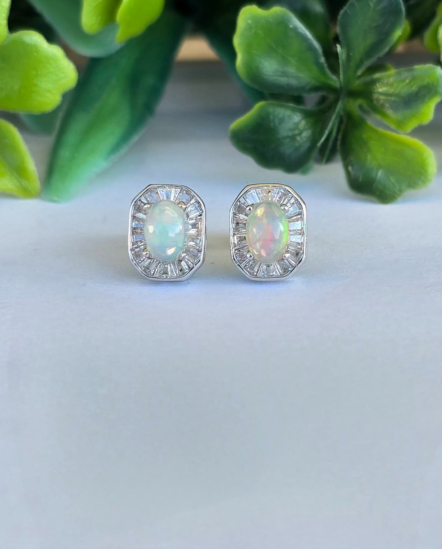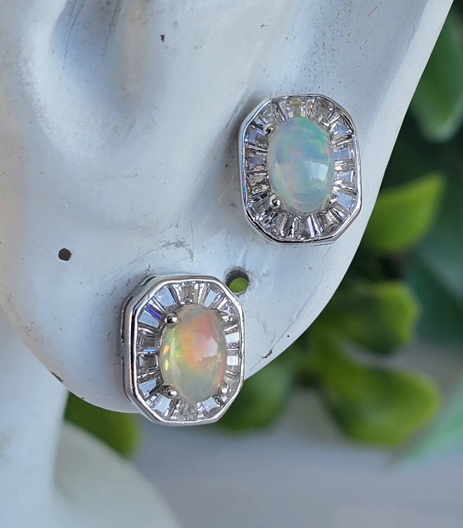 Cercel contemporani delicaţi, din argint placat cu aur alb de 18K, cu opale naturale și pietre cubic zirconia.