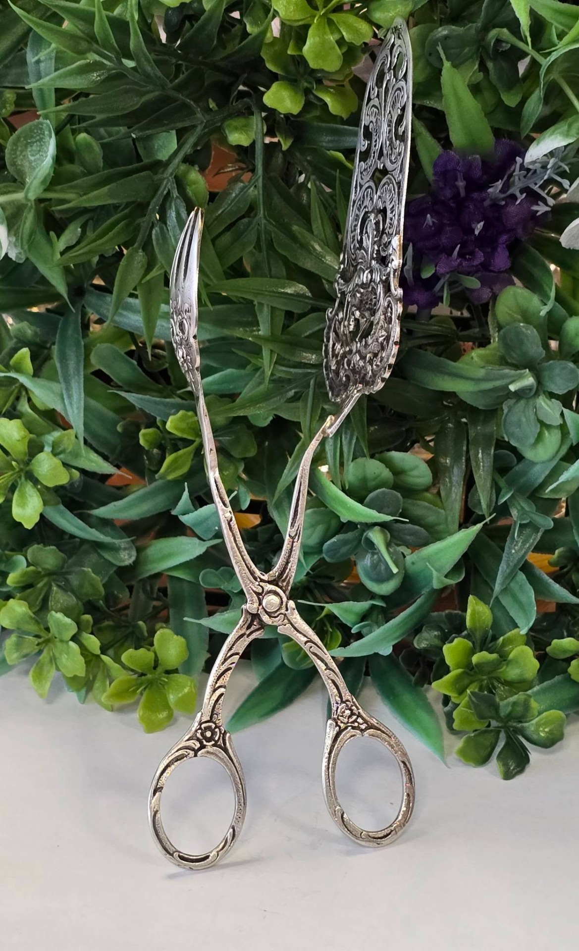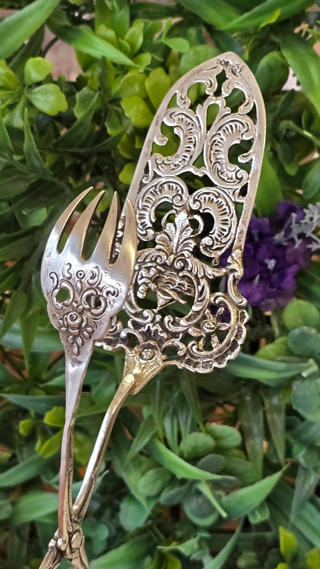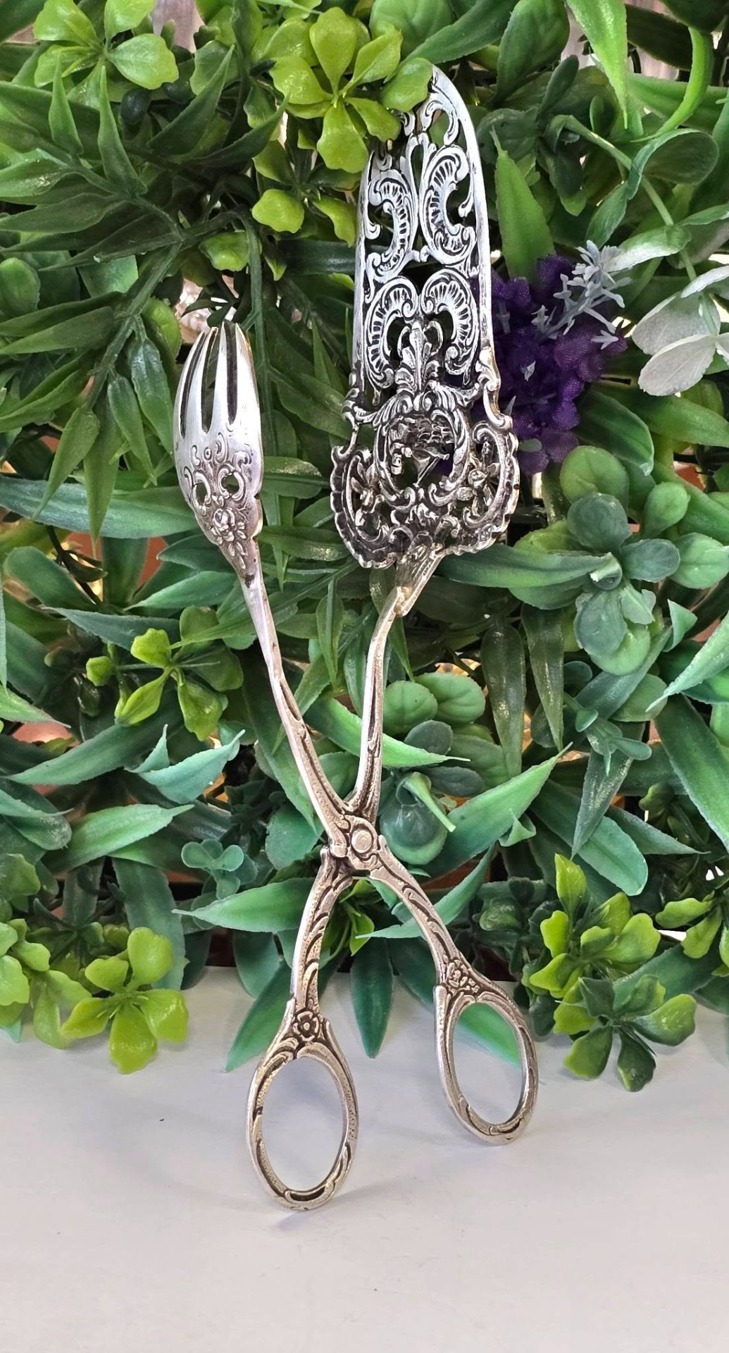 Clește vechi pentru servirea tortului, prăjiturilor, produselor de patiserie, din argint, compus din paletă și furculiță, manufactură în motiv floral