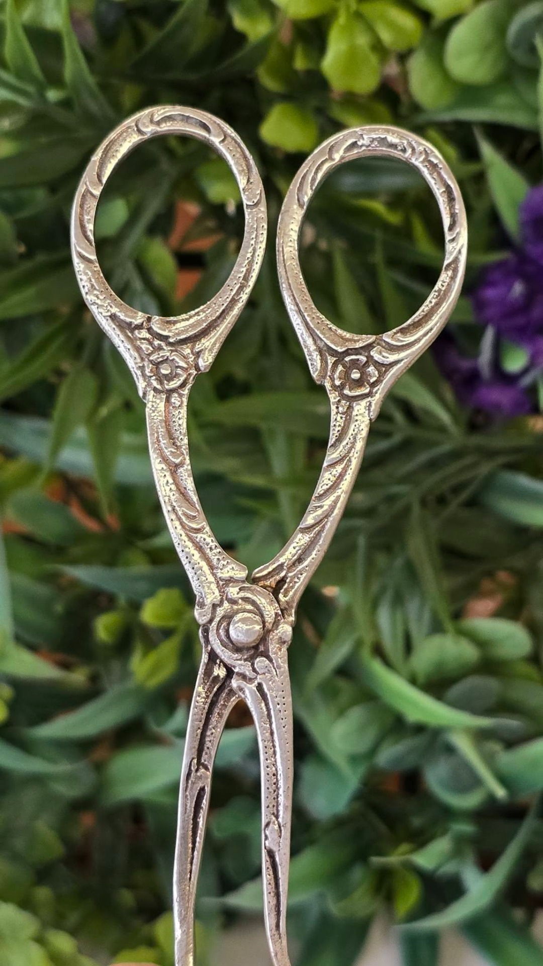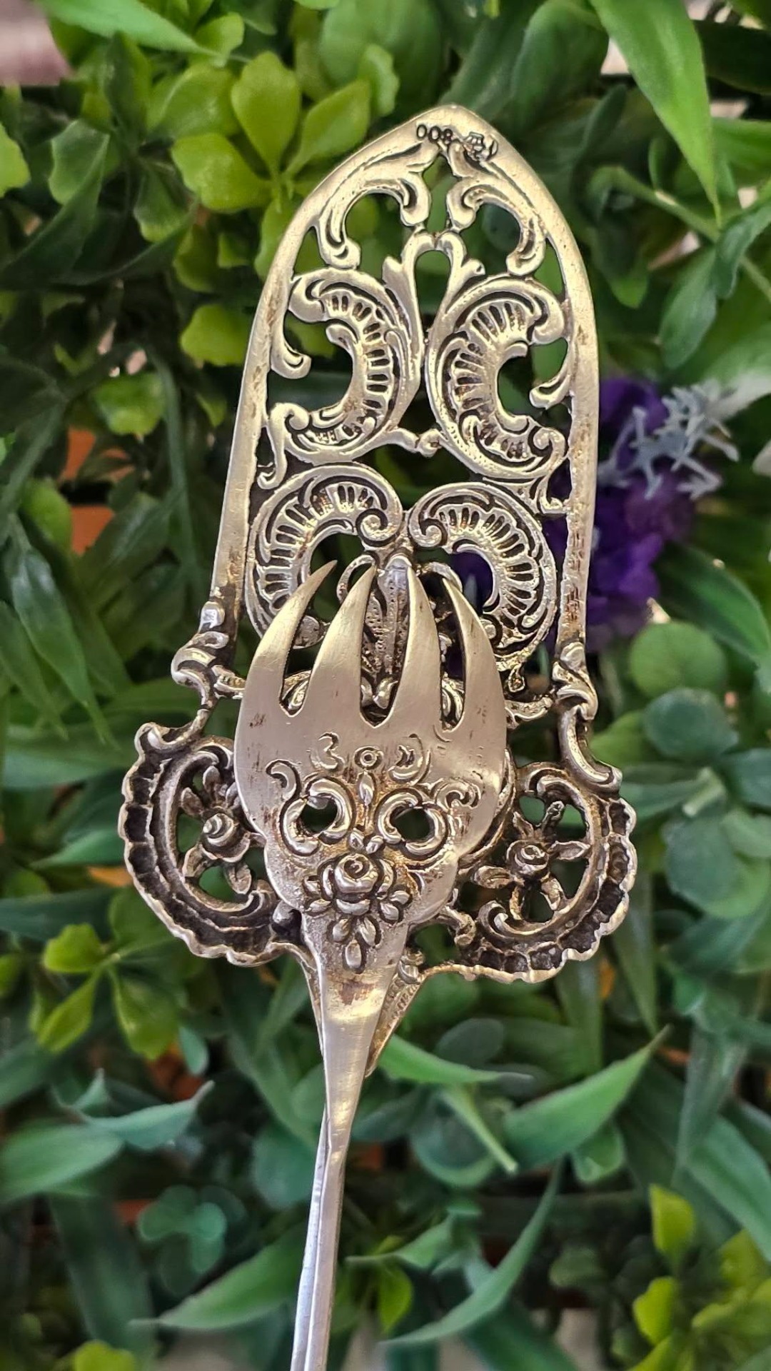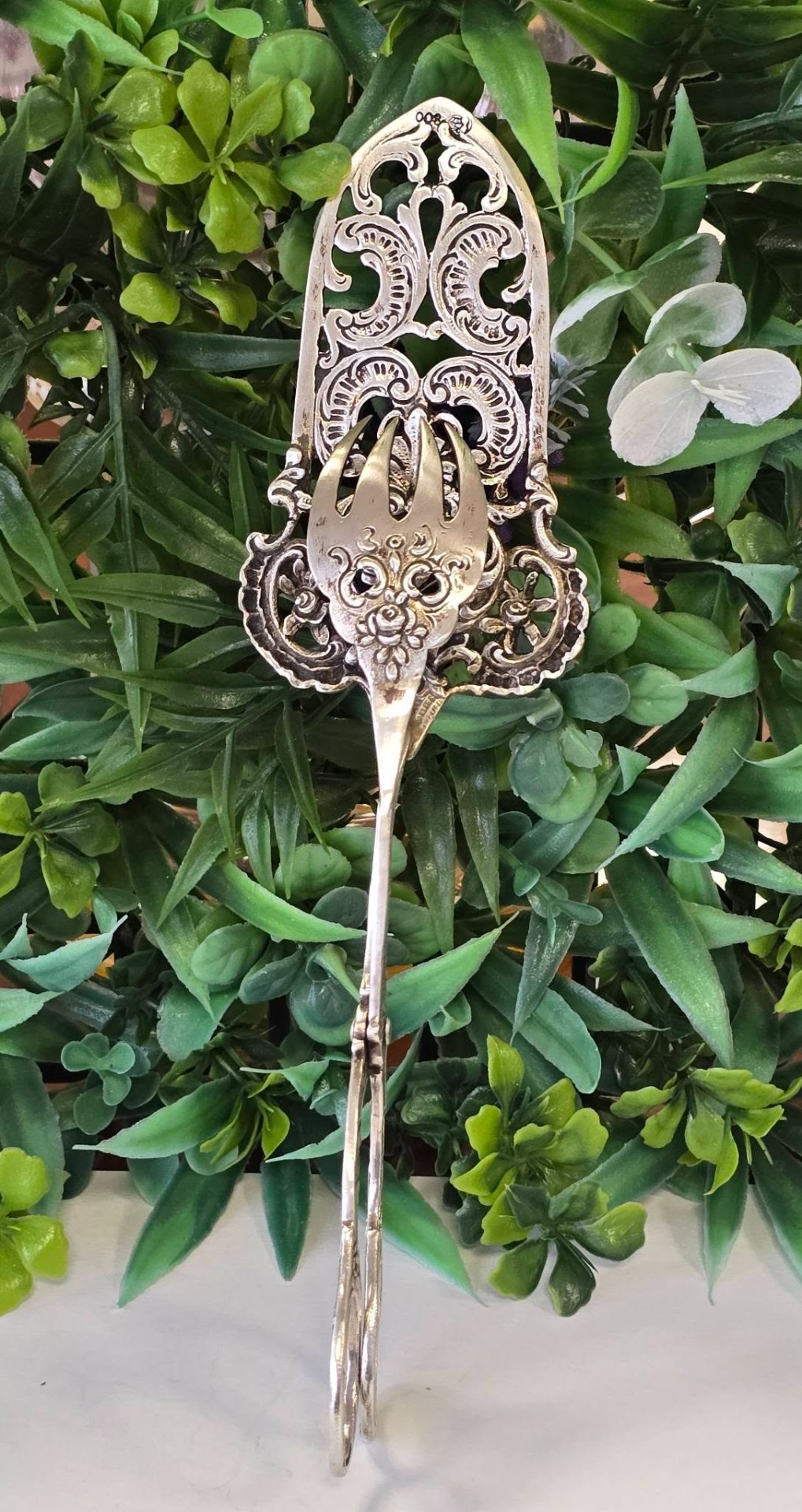 Clește vechi pentru servirea tortului, prăjiturilor, produselor de patiserie, din argint, compus din paletă și furculiță, manufactură în motiv floral