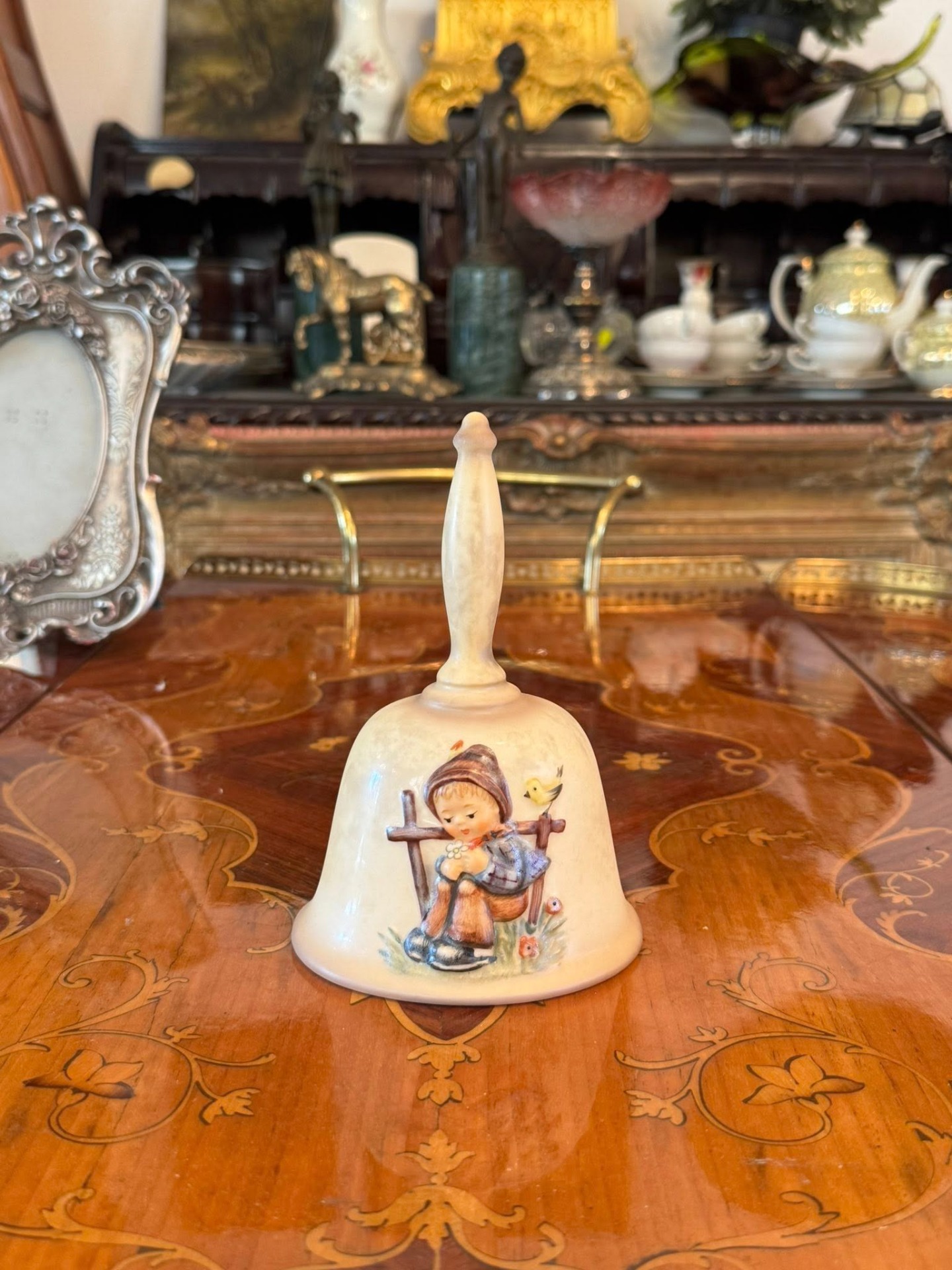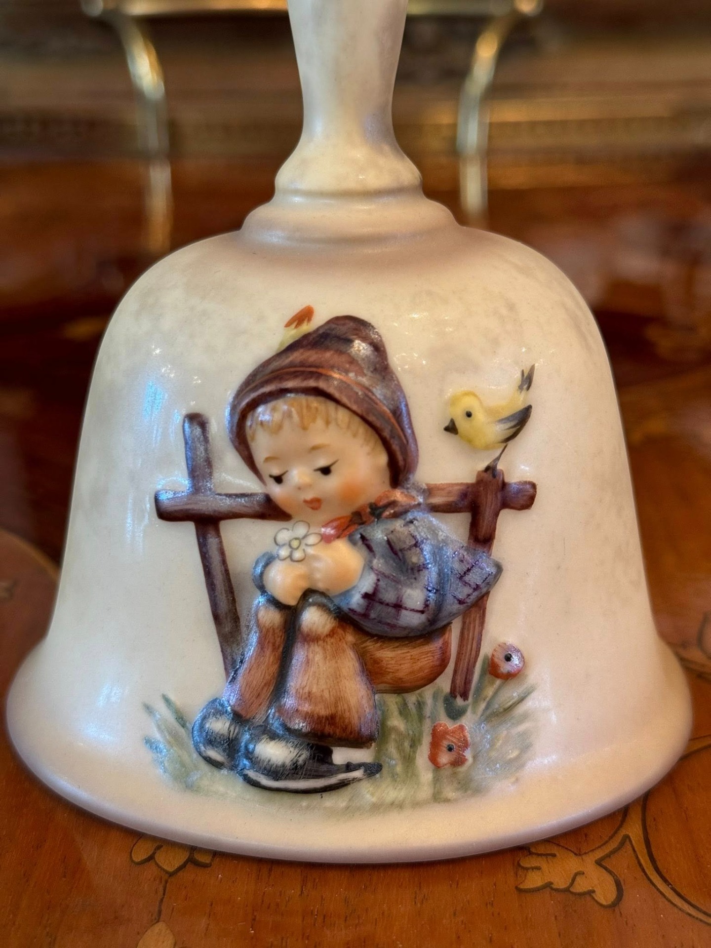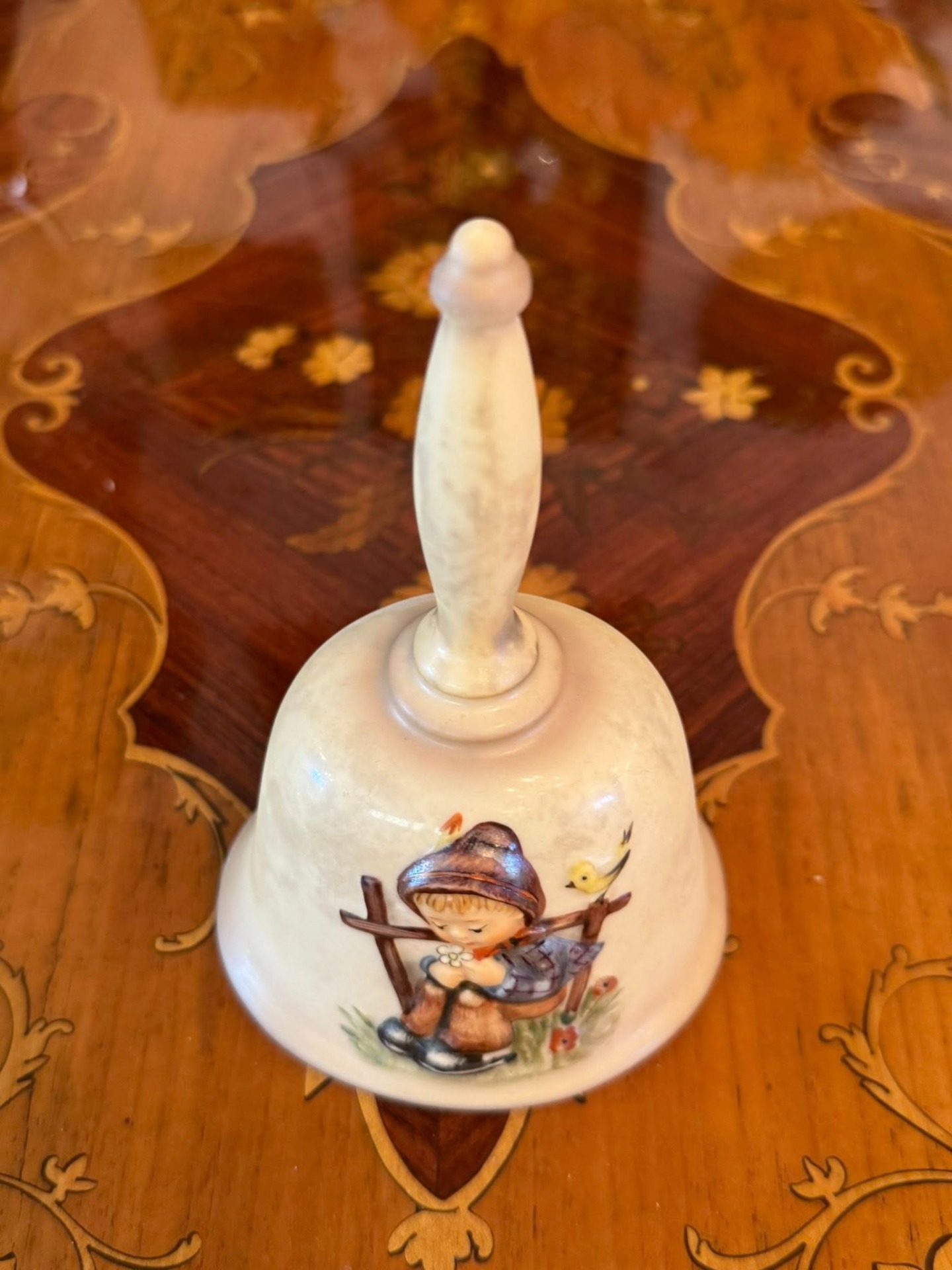 Clopoțel din seria M.I. Hummel, produsă de Goebel. Realizat din porțelan fin tip biskuit (mat), pictat manual în culori naturale. Decorul în basorelief înfățișează un băiețel așezat pe iarbă, ținând în mână o floare.