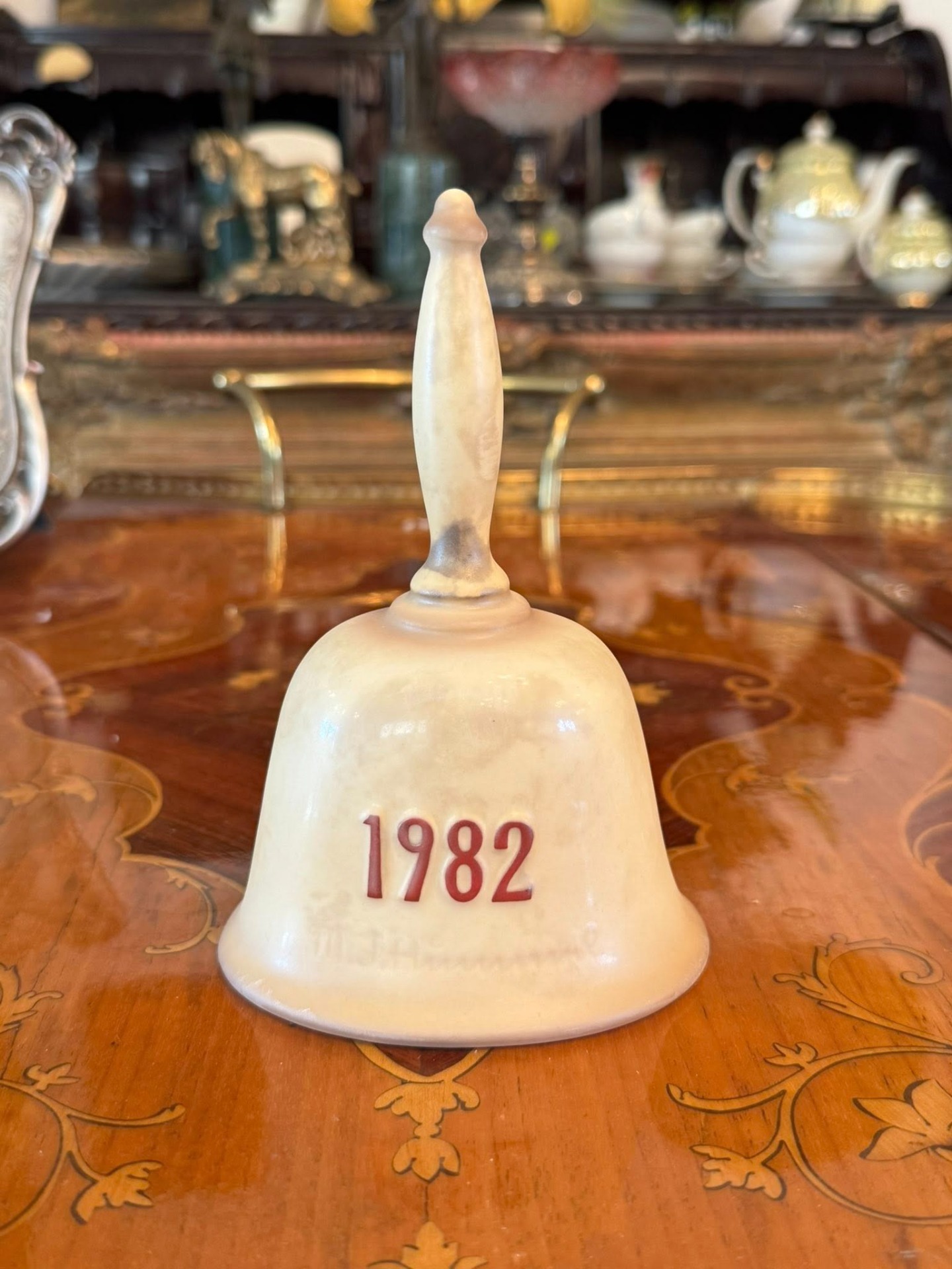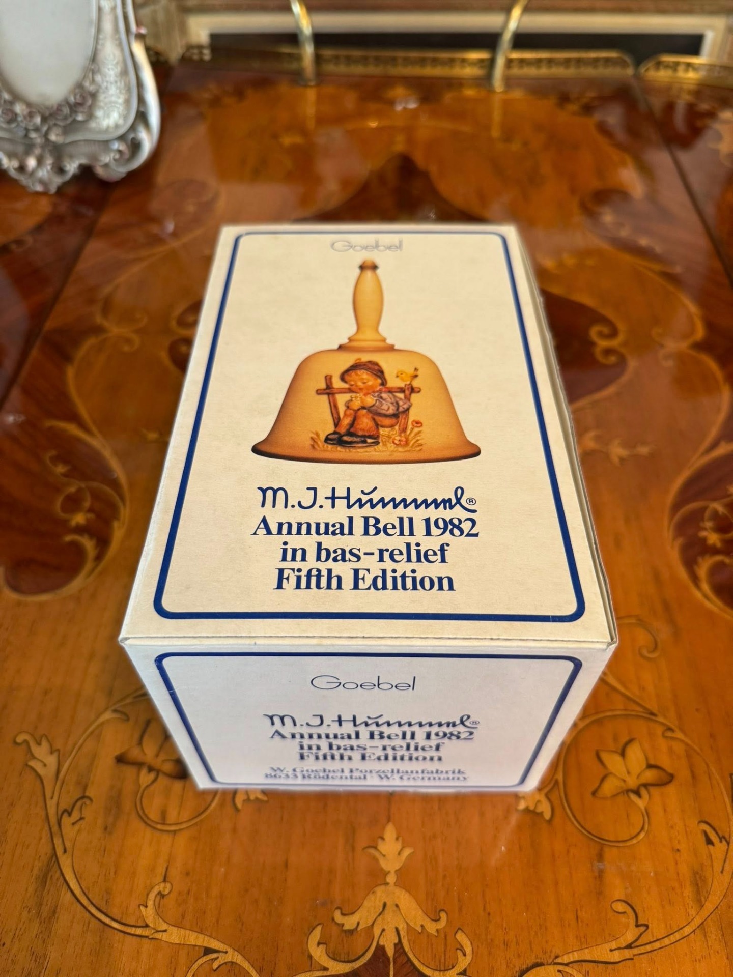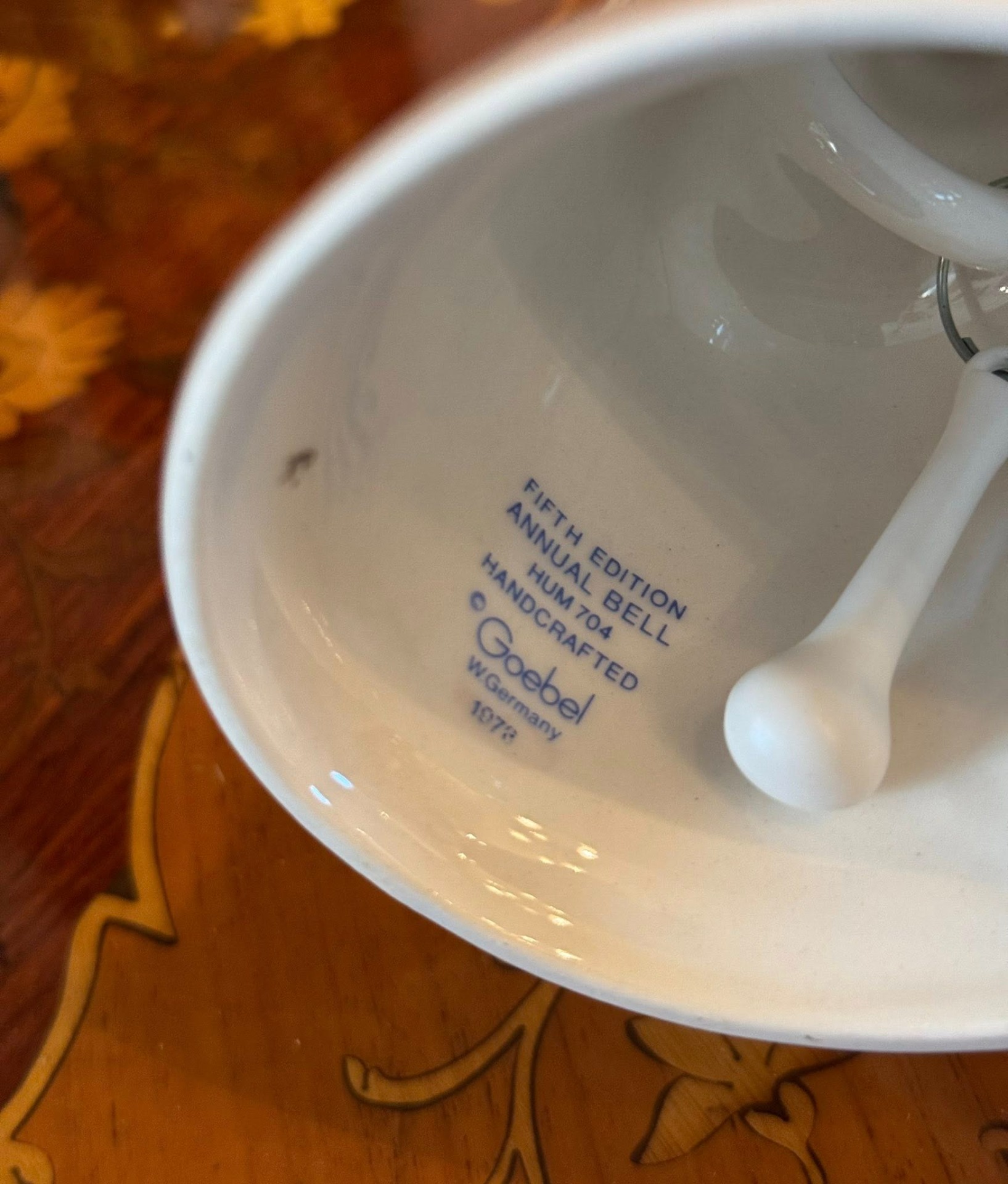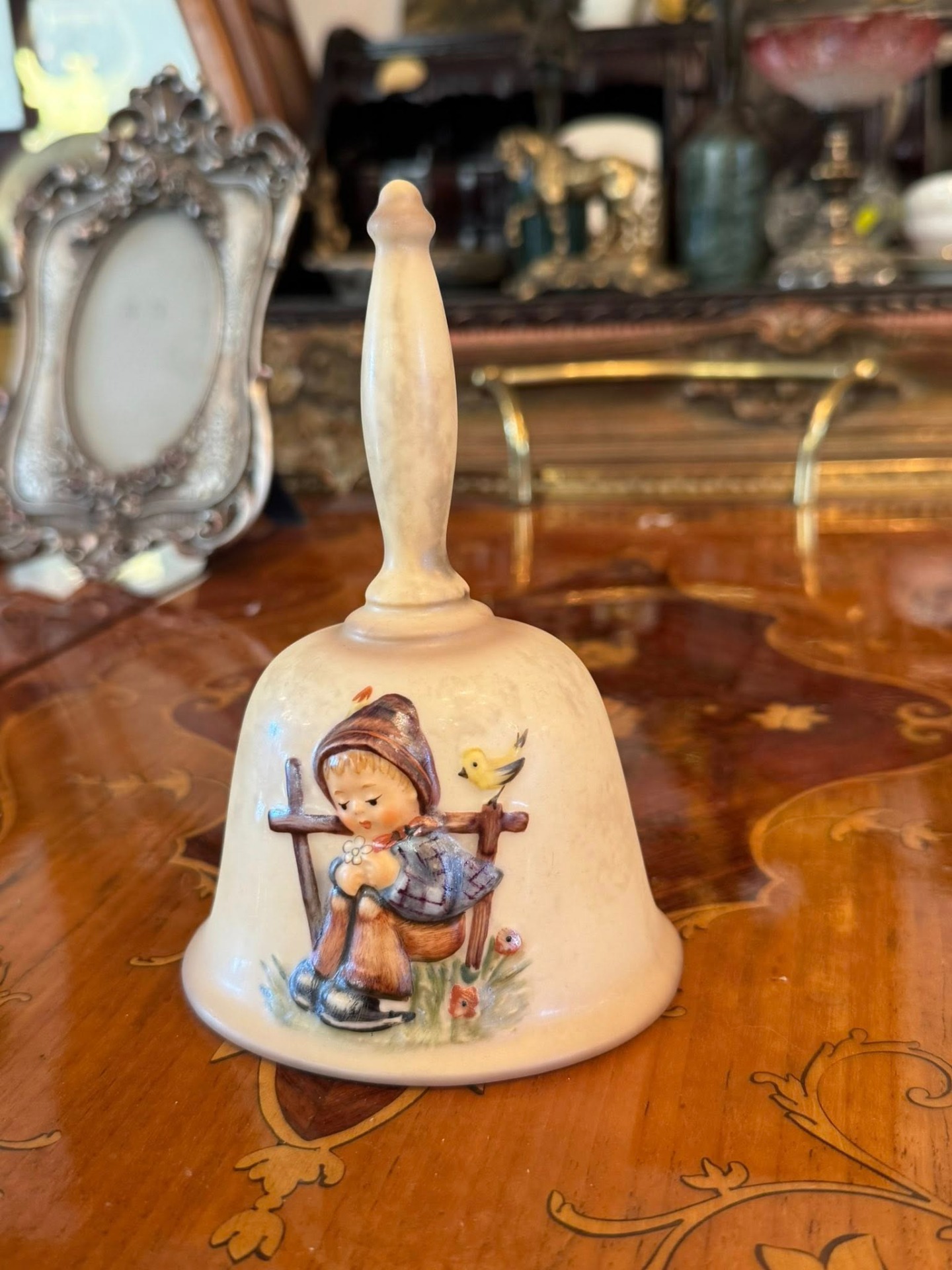 Clopoțel din seria M.I. Hummel, produsă de Goebel. Realizat din porțelan fin tip biskuit (mat), pictat manual în culori naturale. Decorul în basorelief înfățișează un băiețel așezat pe iarbă, ținând în mână o floare.