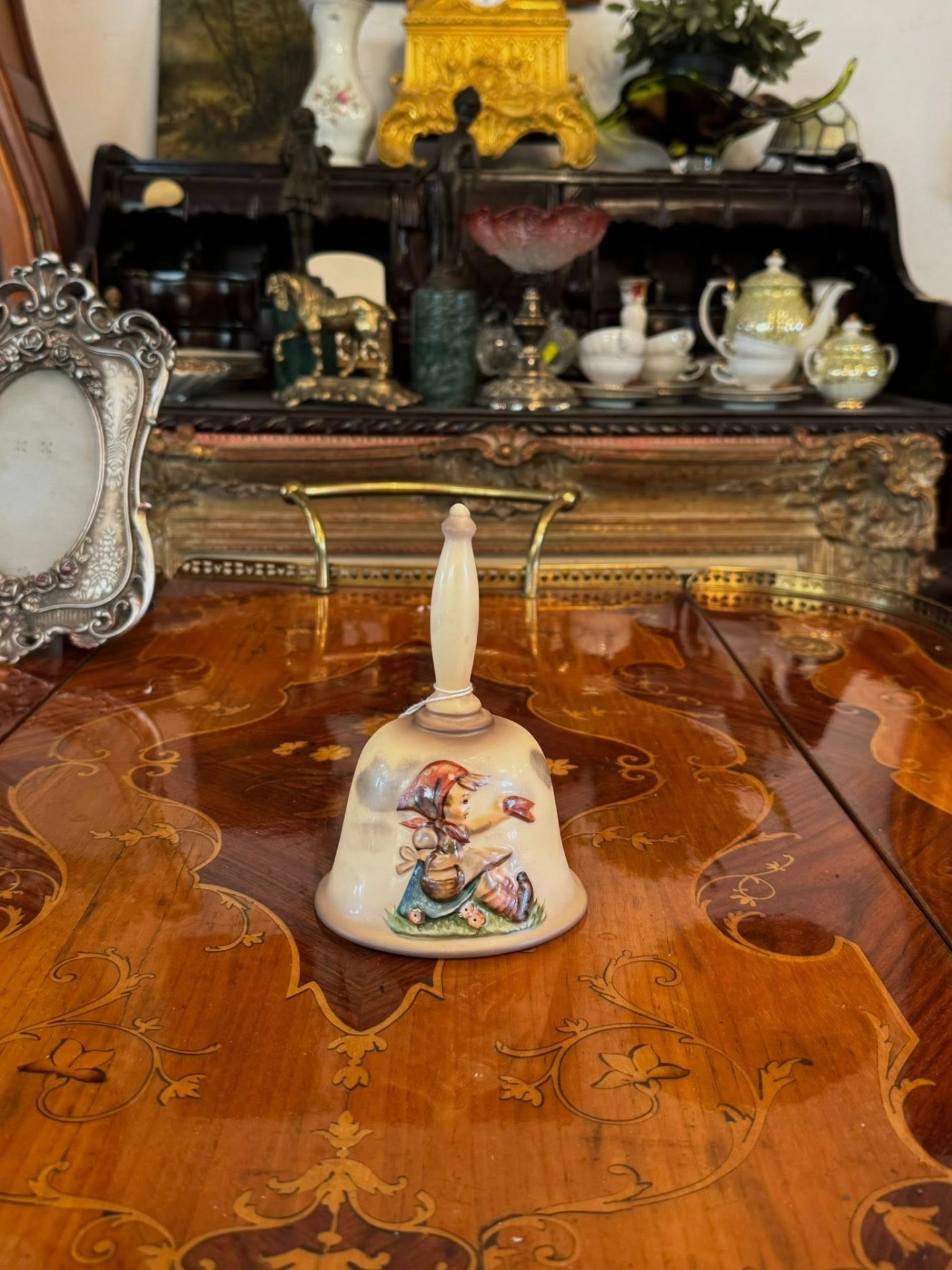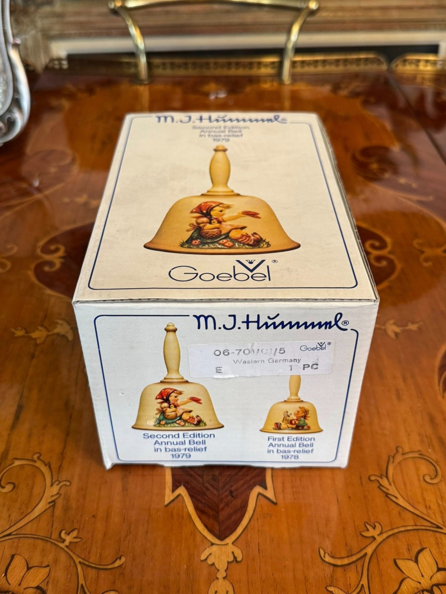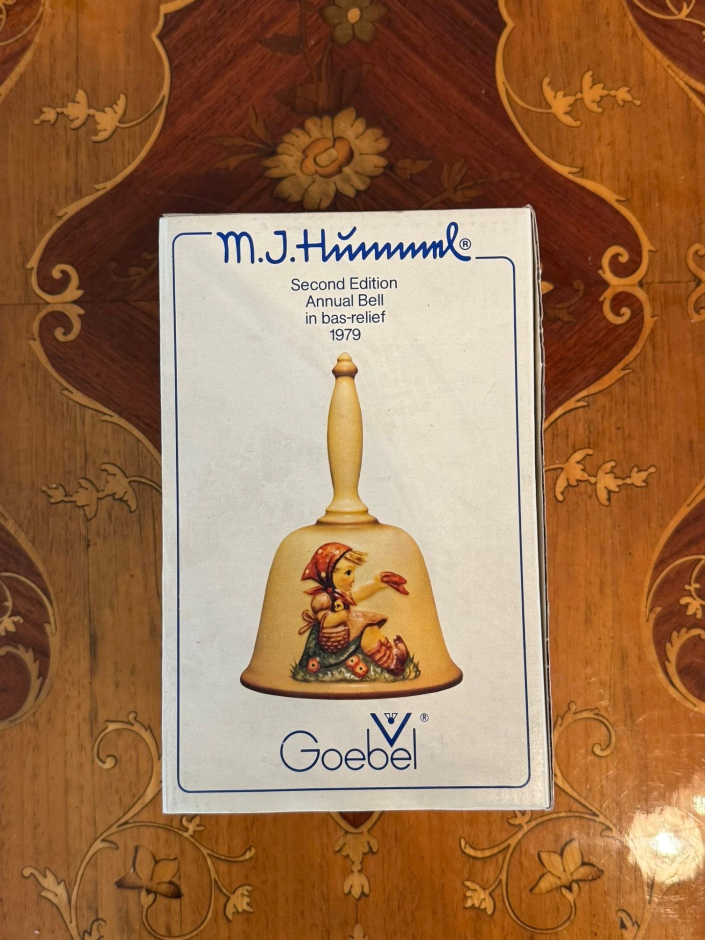 Clopoțel M.I. Hummel, serie bazată pe desenele călugăriței germane Maria Innocentia Hummel. Realizat din porțelan de tip biskuit (porțelan neglazurat sau mat la exterior), pictat manual în culori calde, pastelate. Are cutia originală și eticheta de autenticitate a clubului de colecționari Goebel.
