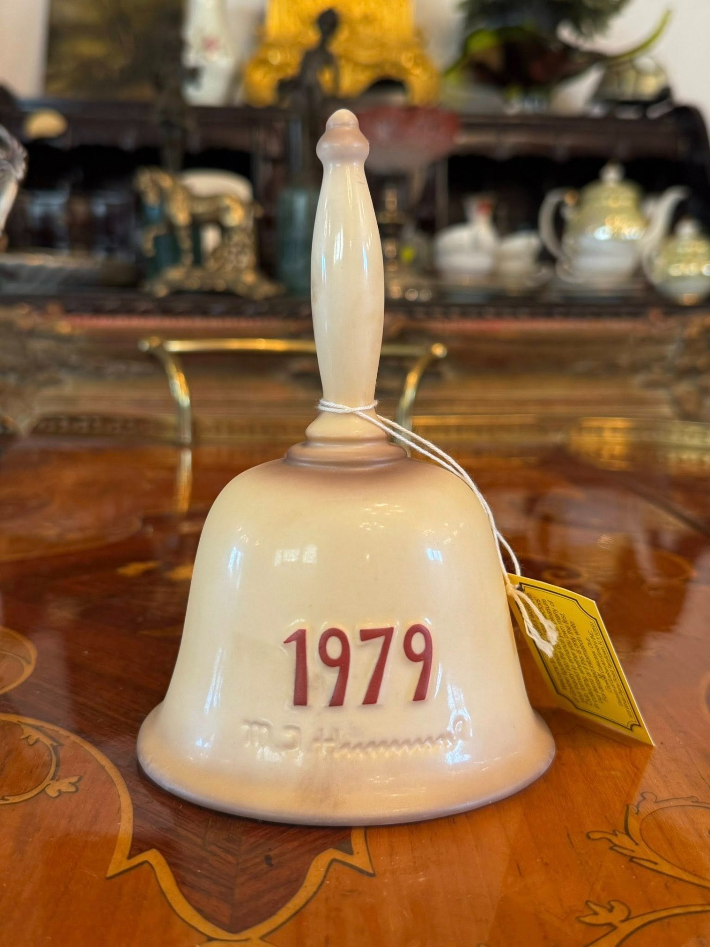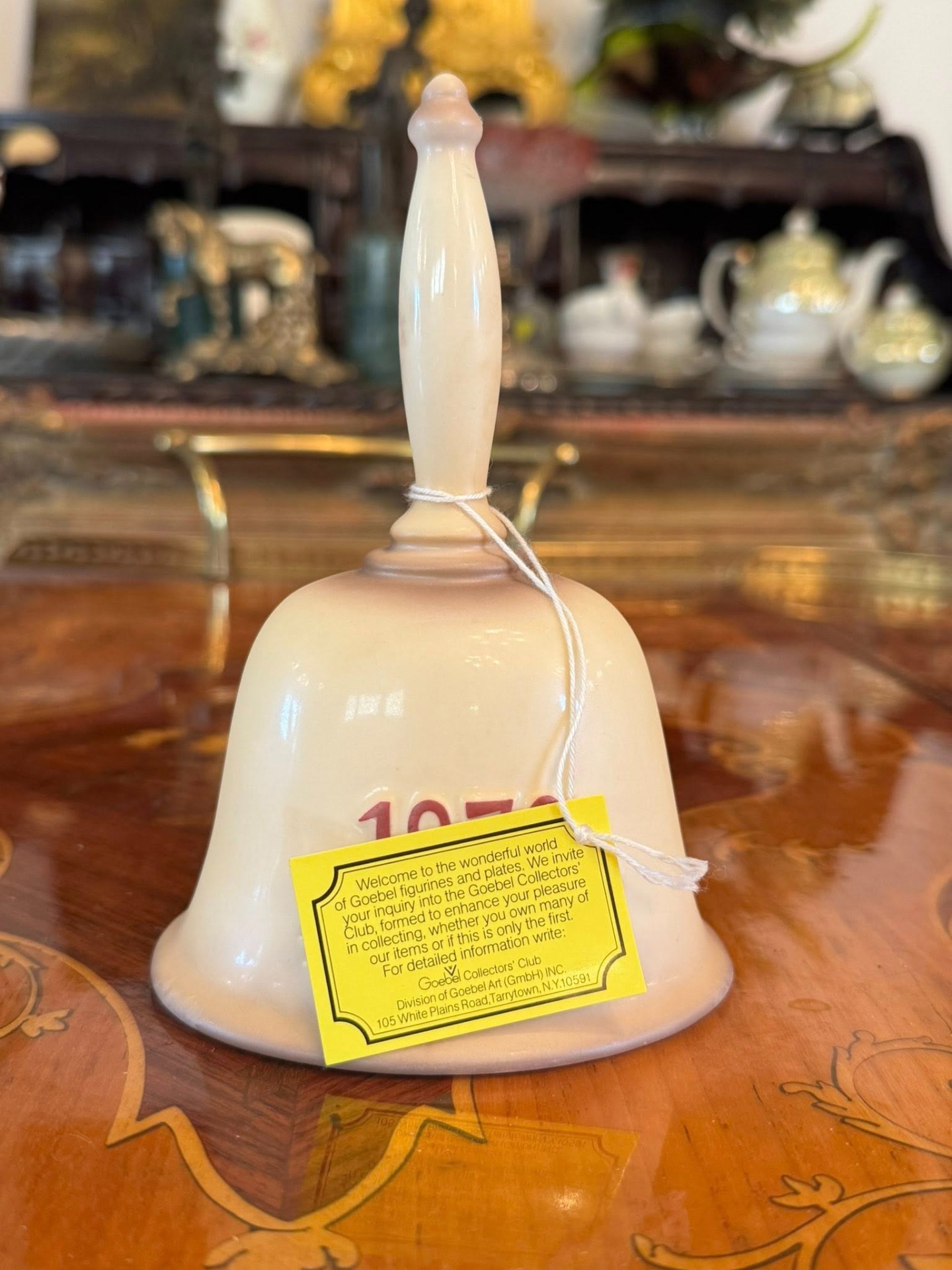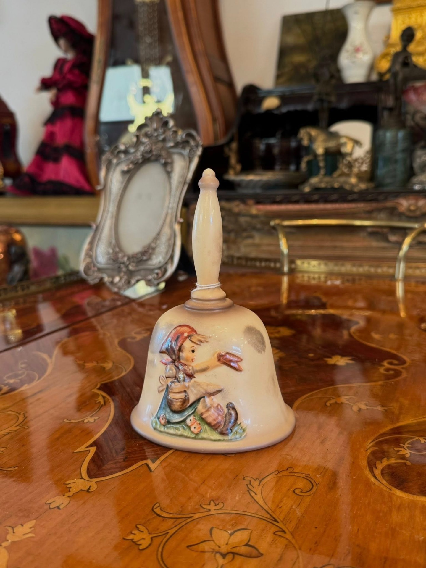 Clopoțel M.I. Hummel, serie bazată pe desenele călugăriței germane Maria Innocentia Hummel. Realizat din porțelan de tip biskuit (porțelan neglazurat sau mat la exterior), pictat manual în culori calde, pastelate. Are cutia originală și eticheta de autenticitate a clubului de colecționari Goebel.