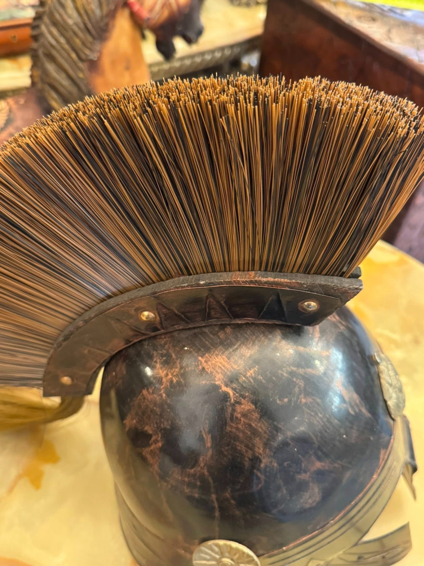 Creasta (Lofos): Elementul cel mai impunător este creasta înaltă, realizată din peri rigizi ce imită părul de cal. Aceasta era folosită în antichitate pentru a identifica ofițerii și pentru a face soldatul să pară mai înalt și mai intimidant.