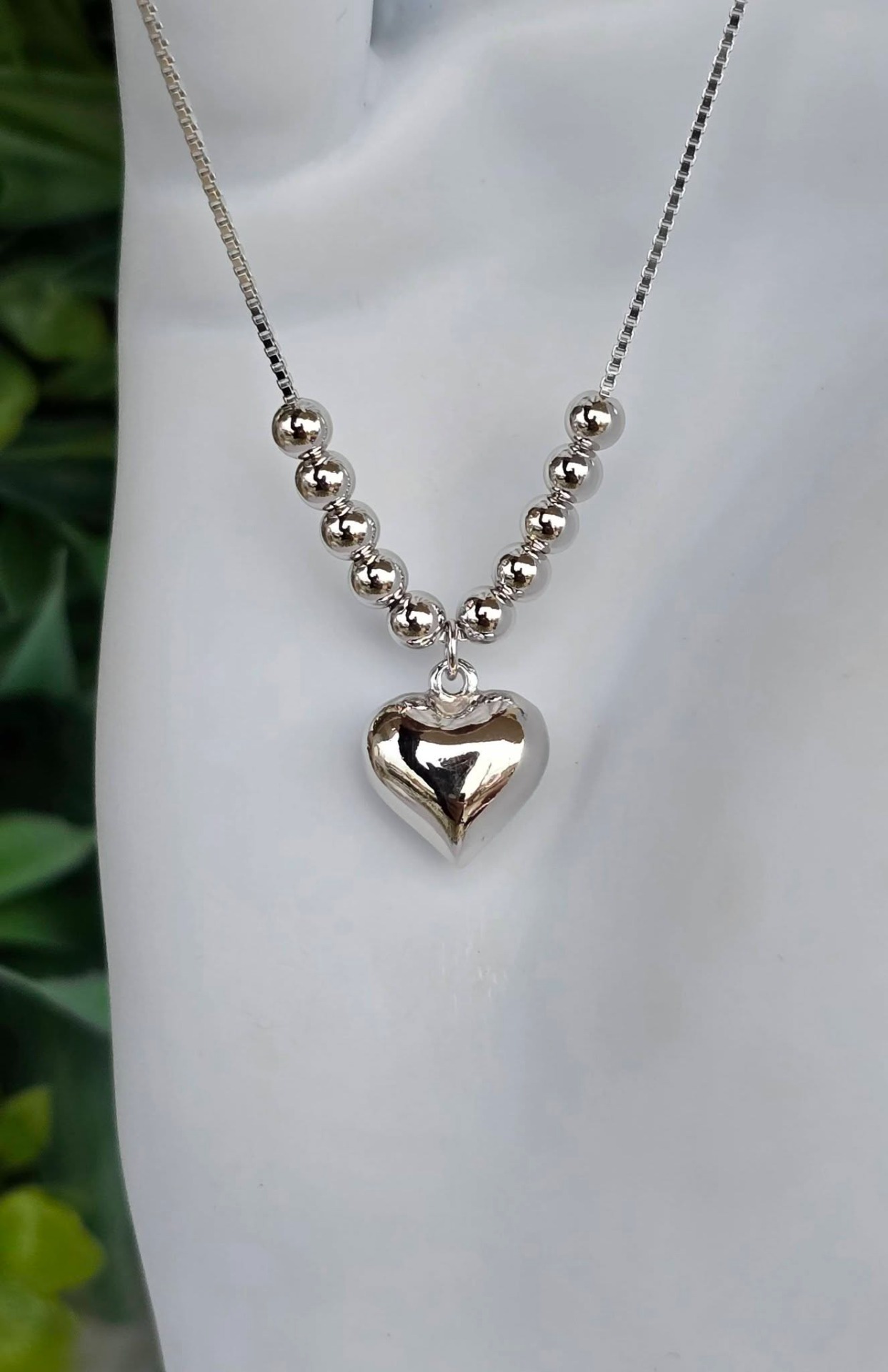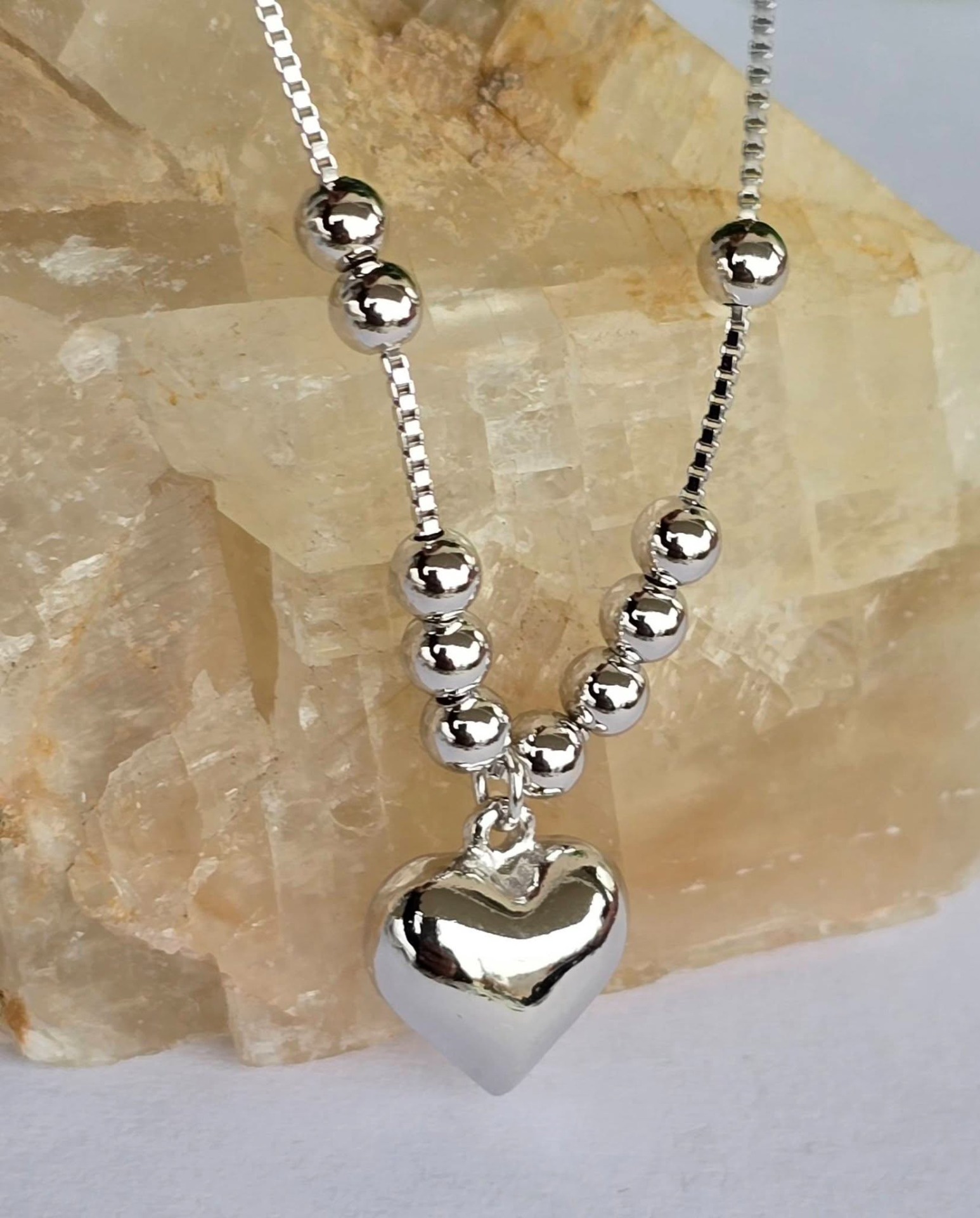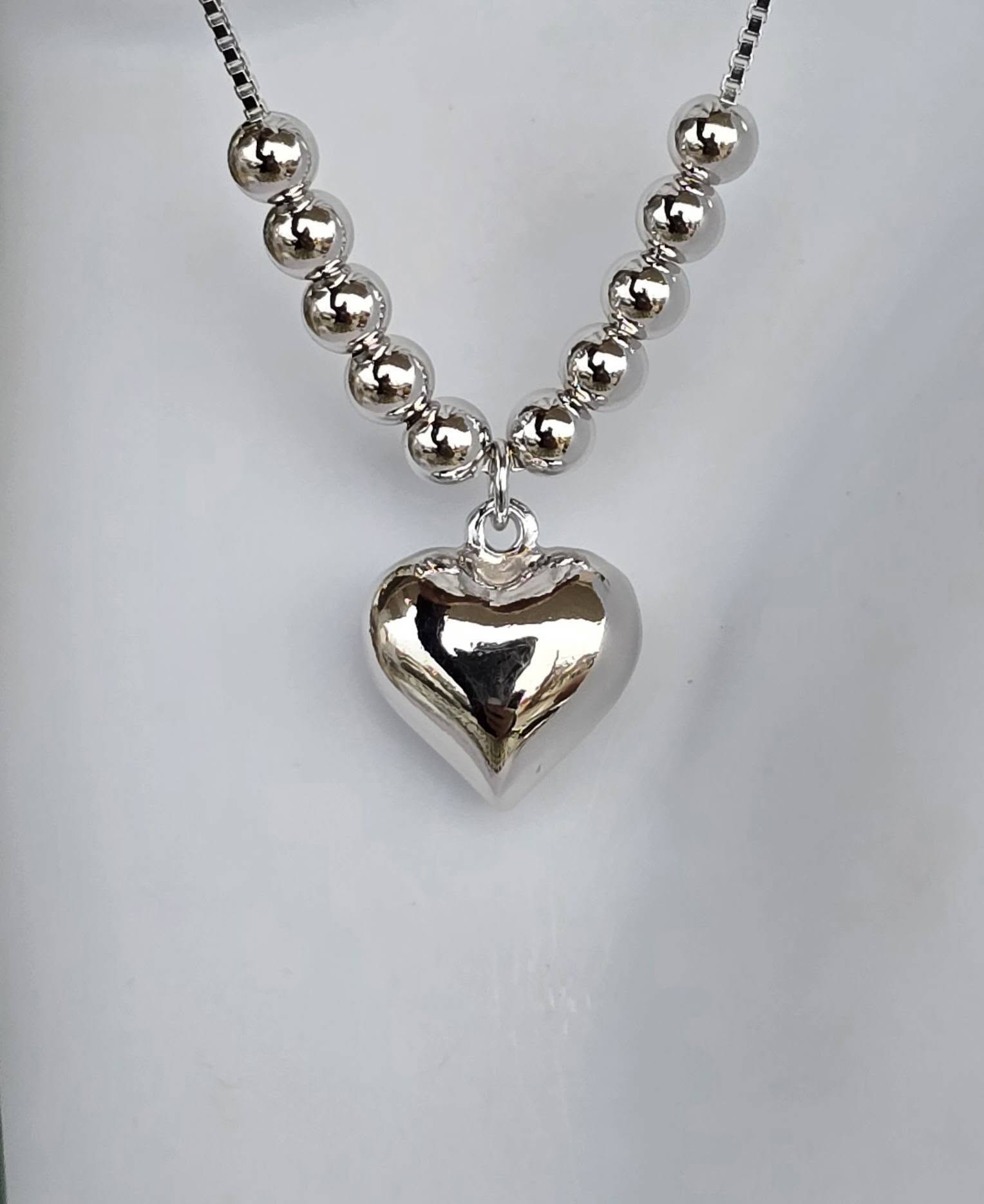 Colier contemporan superb, din argint, stilizat cu inimioară și mărgeluțe mobile din argint.