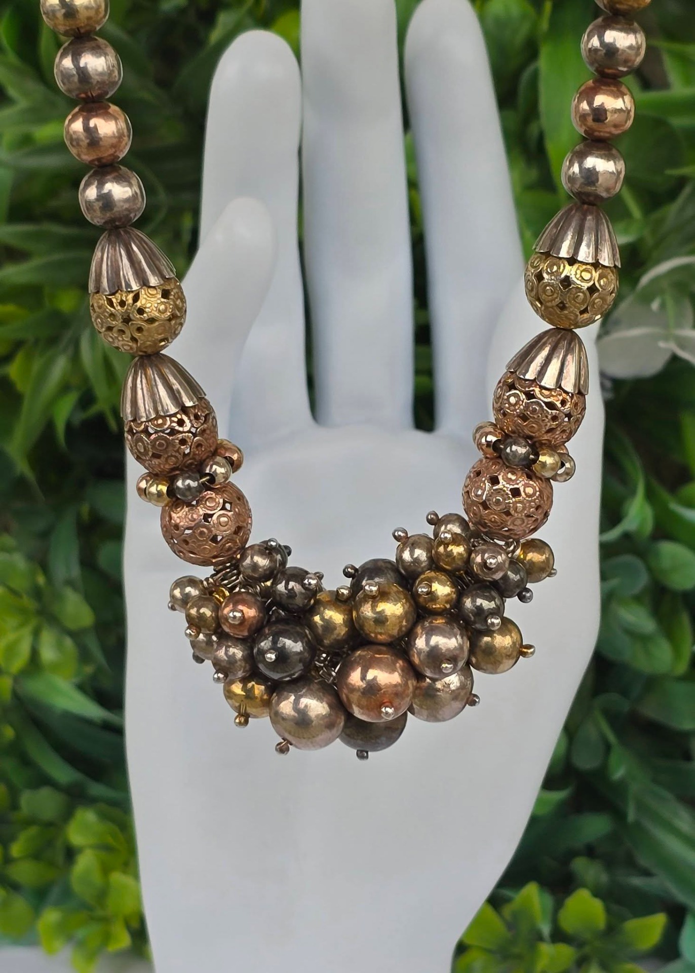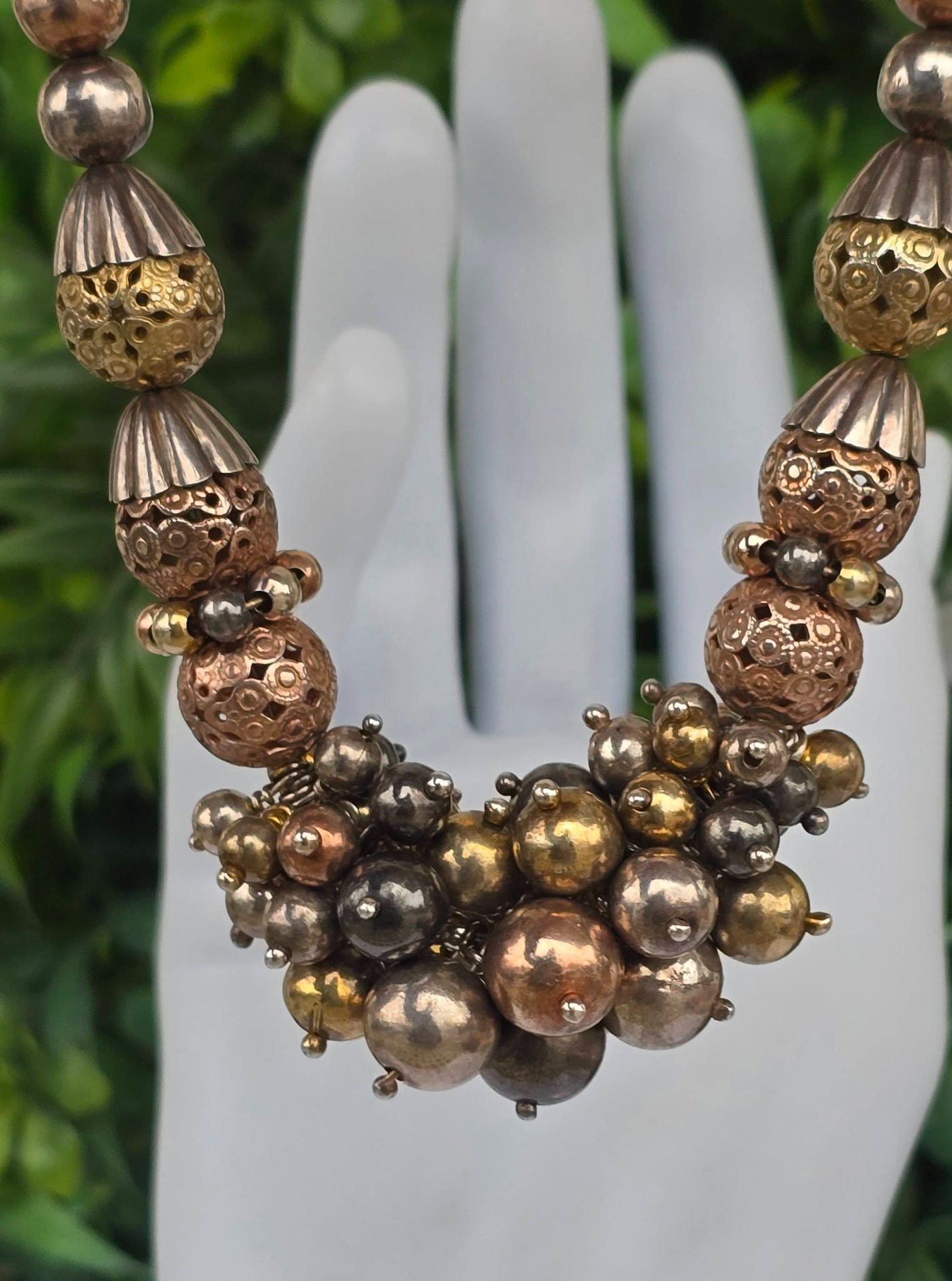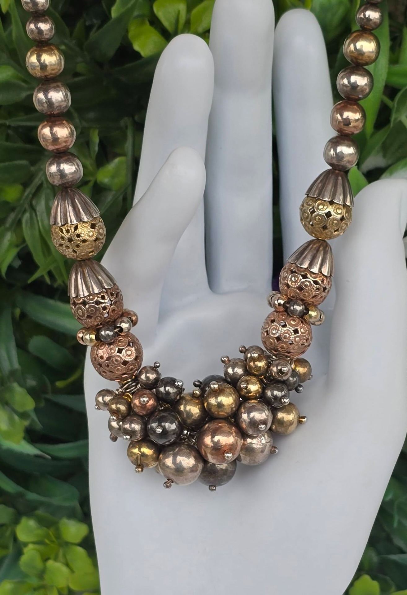 Colier vechi "Boho-Chic" spectaculos, de tip "cluster" (ciorchine), din argint și mărgele placate cu aur roz și aur galben (vermeil tricolor), cu elemente