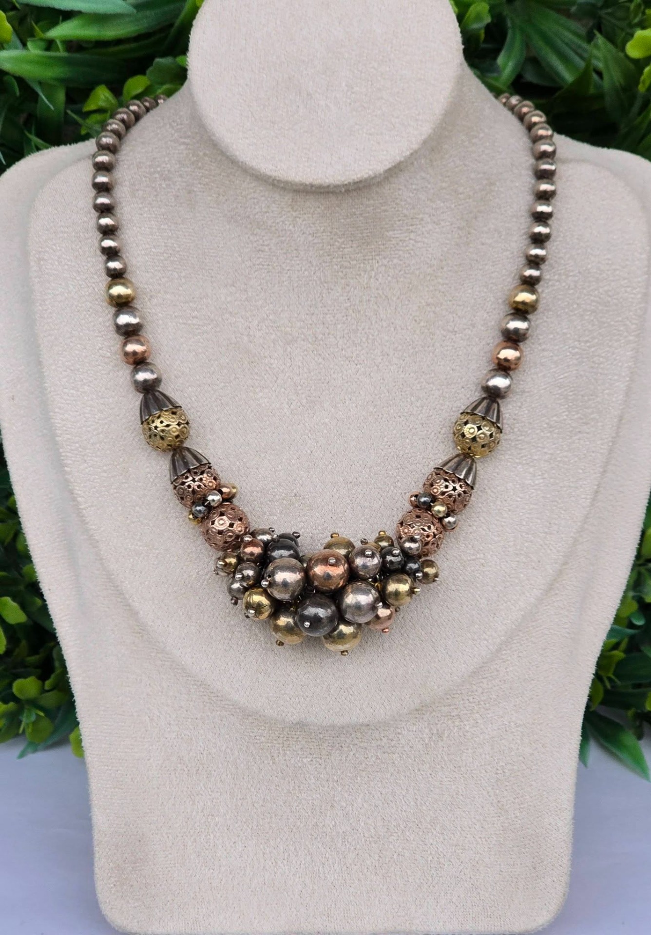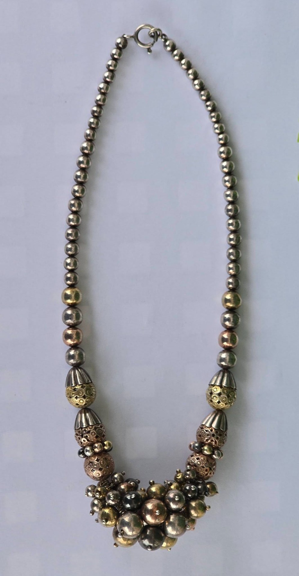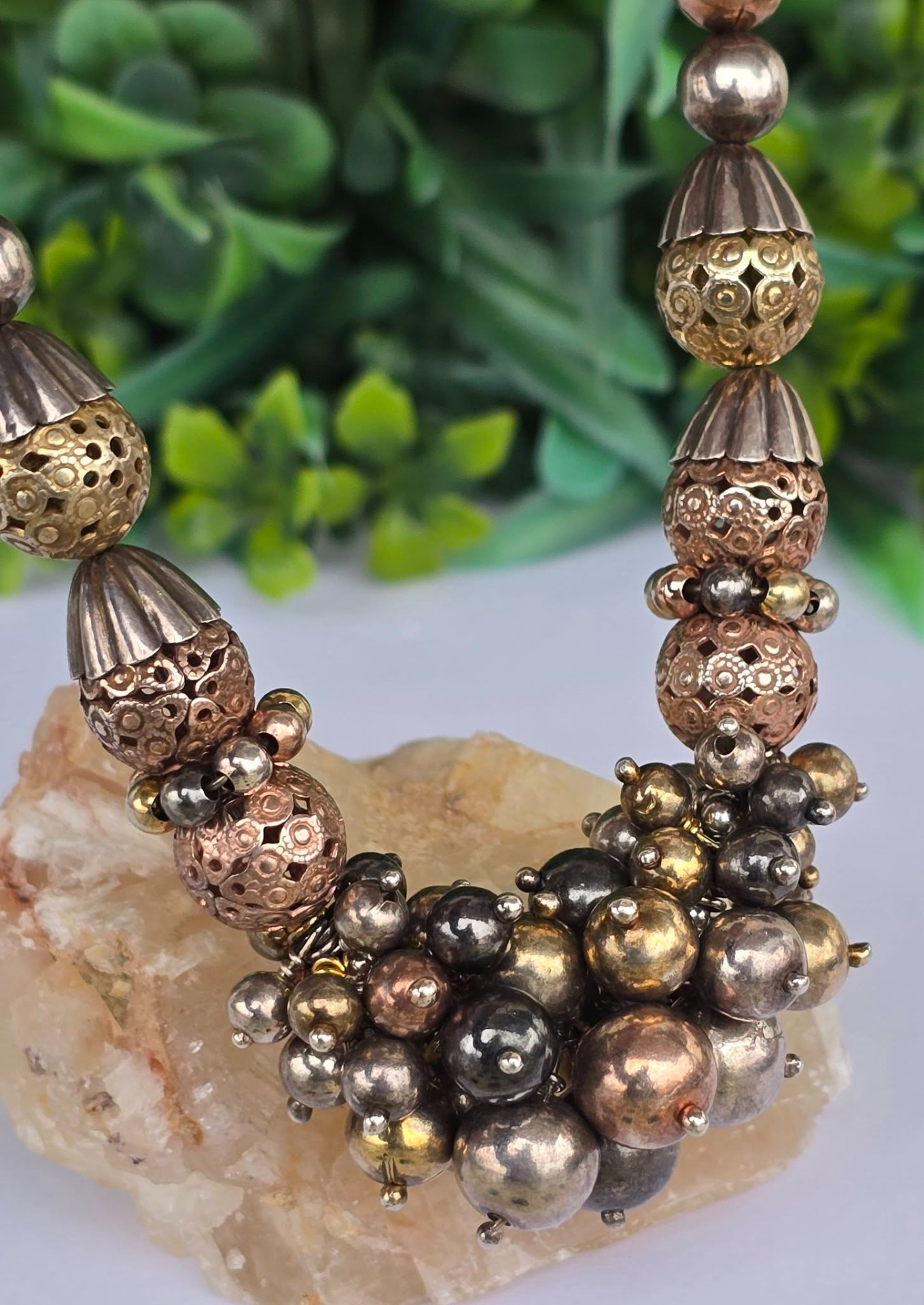 Colier vechi "Boho-Chic" spectaculos, de tip "cluster" (ciorchine), din argint și mărgele placate cu aur roz și aur galben (vermeil tricolor), cu elemente