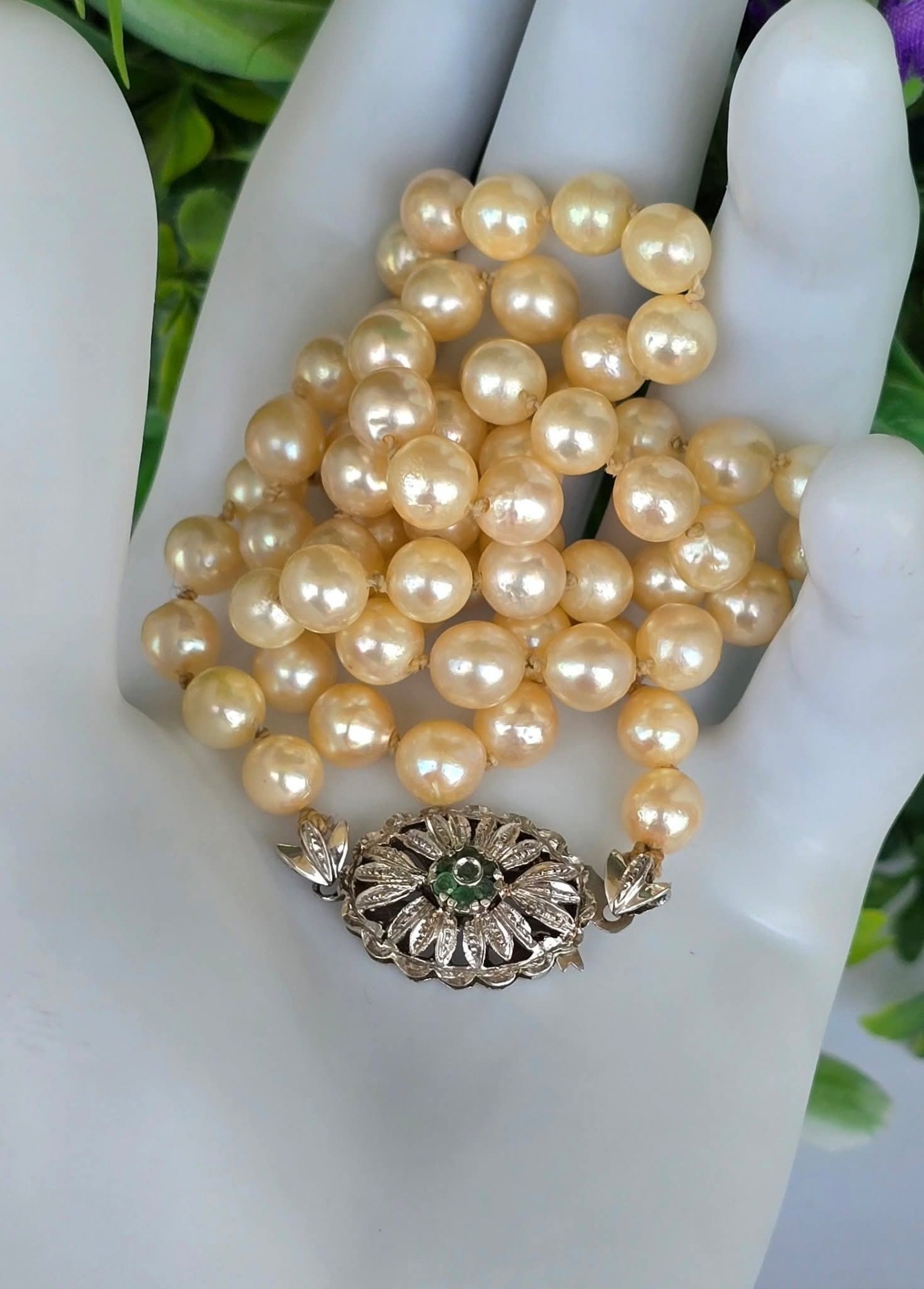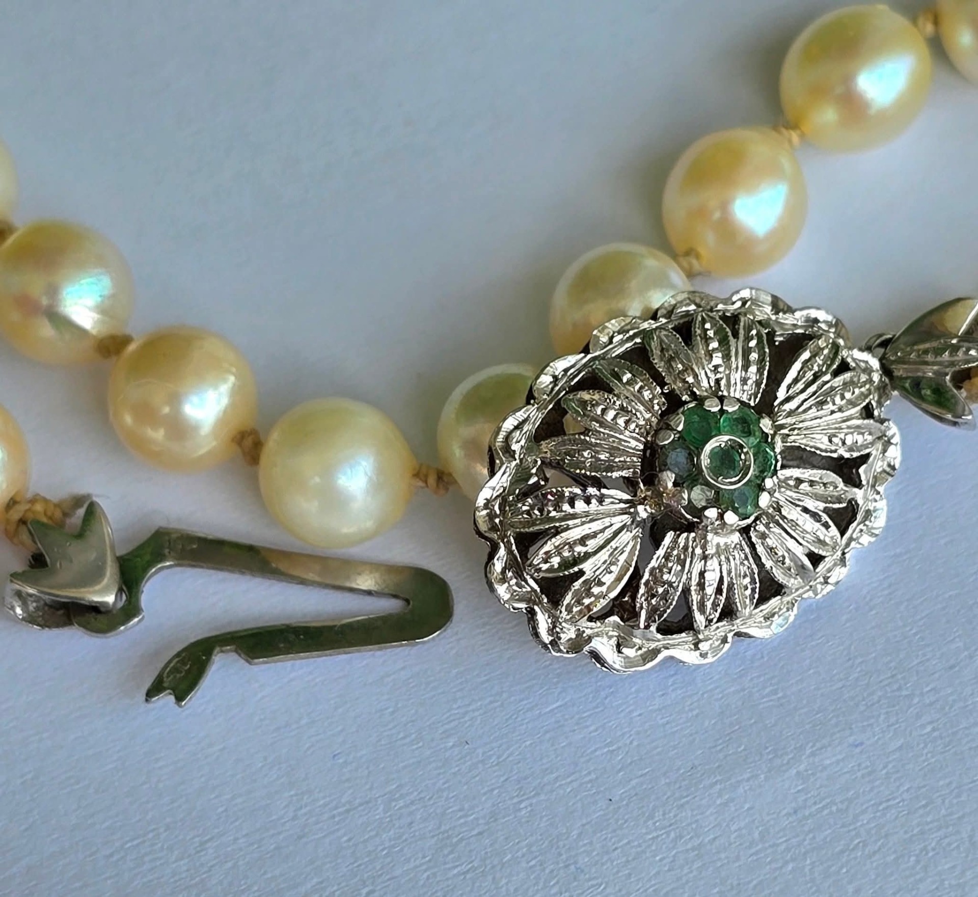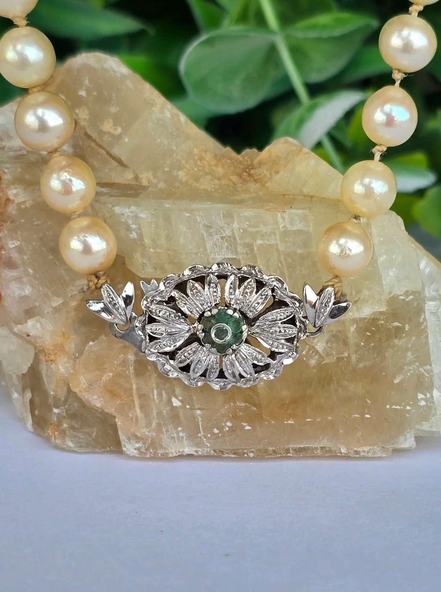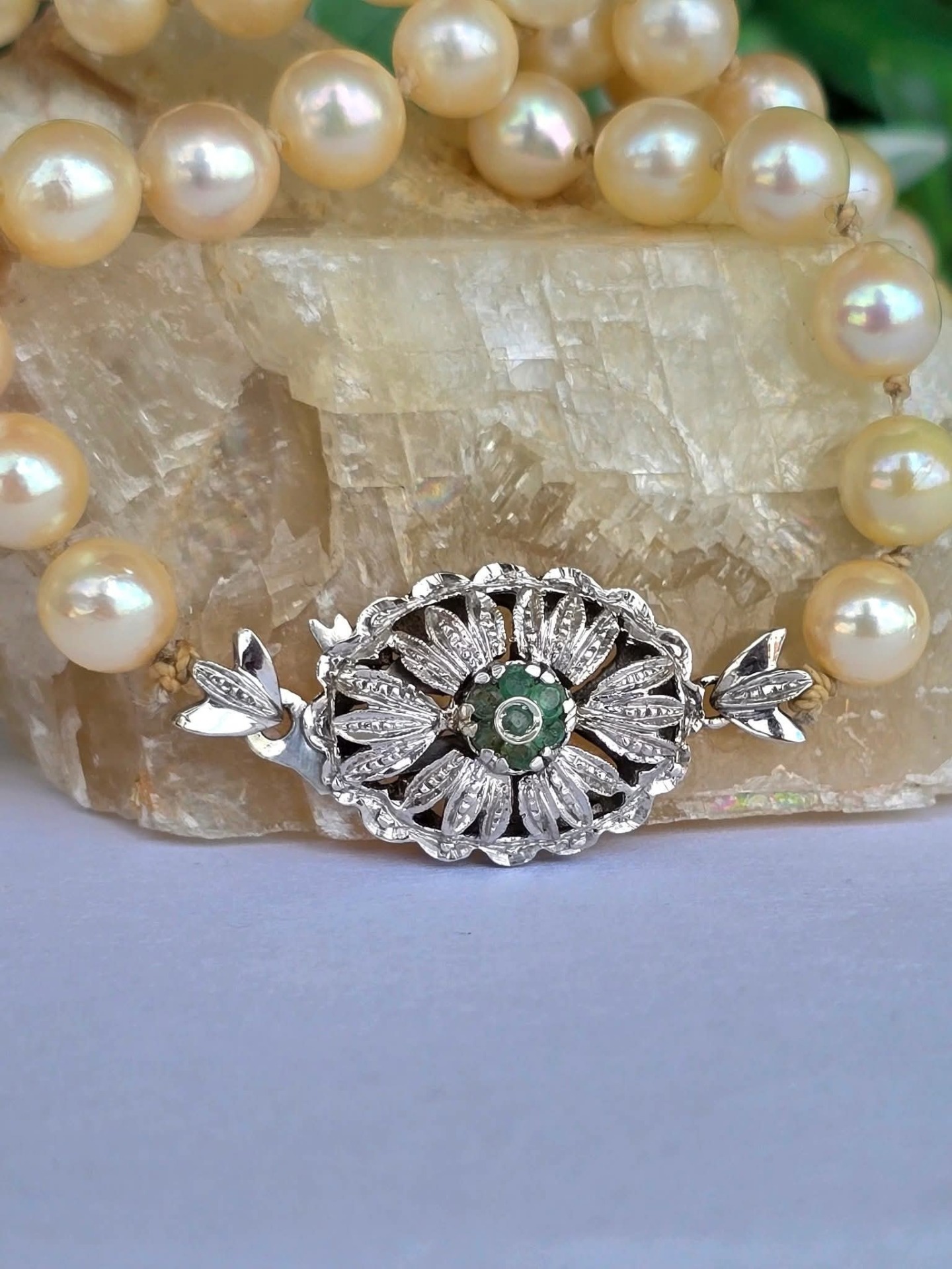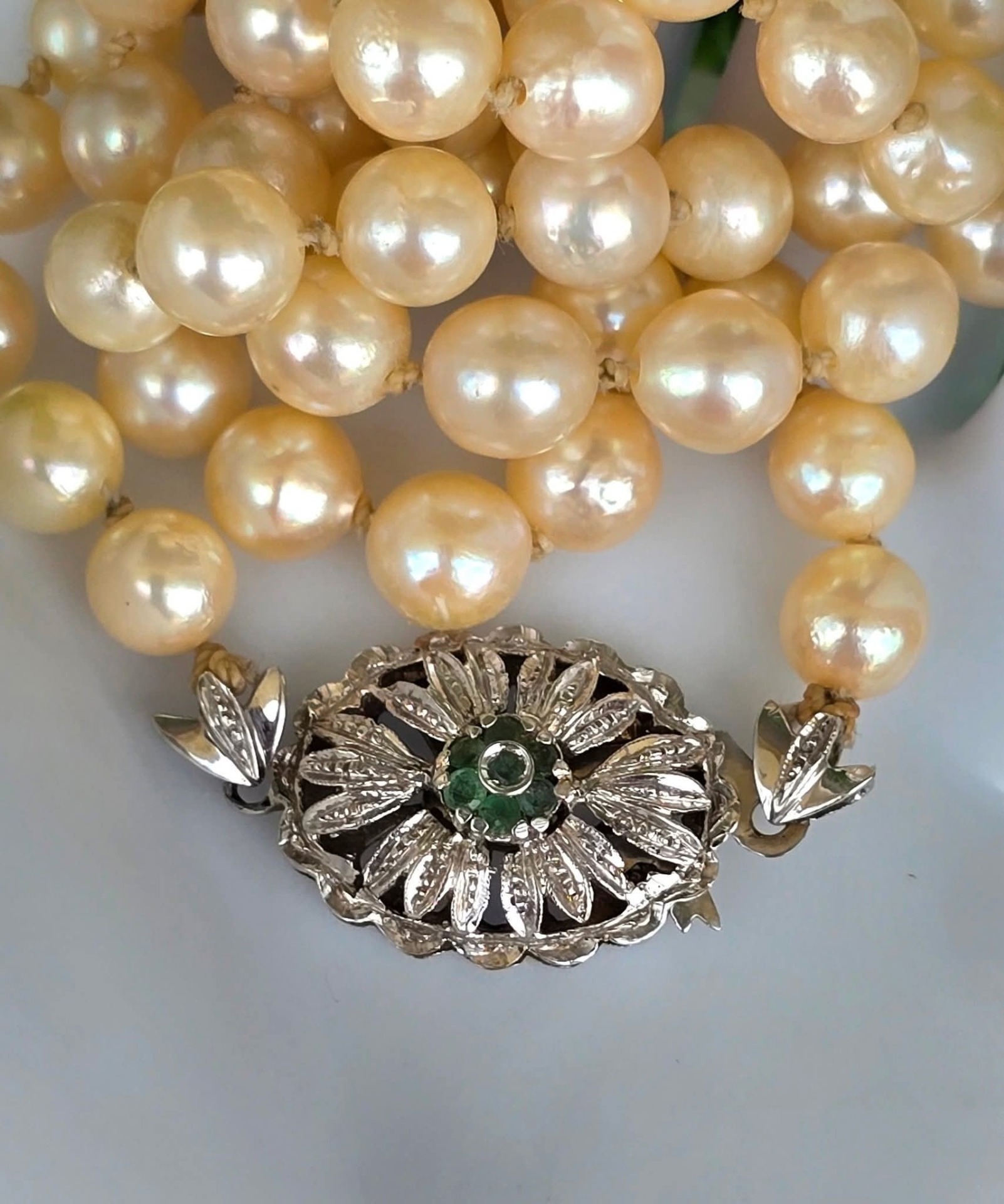 Colier vechi din 67 perle crem naturale de cultură, cu închizătoare din aur de 18K, decorată cu 7 smaralde naturale.