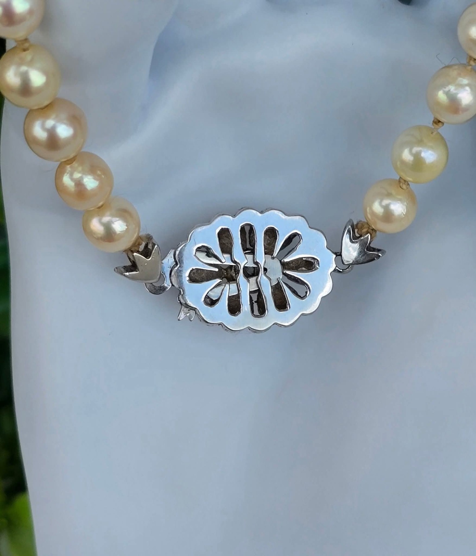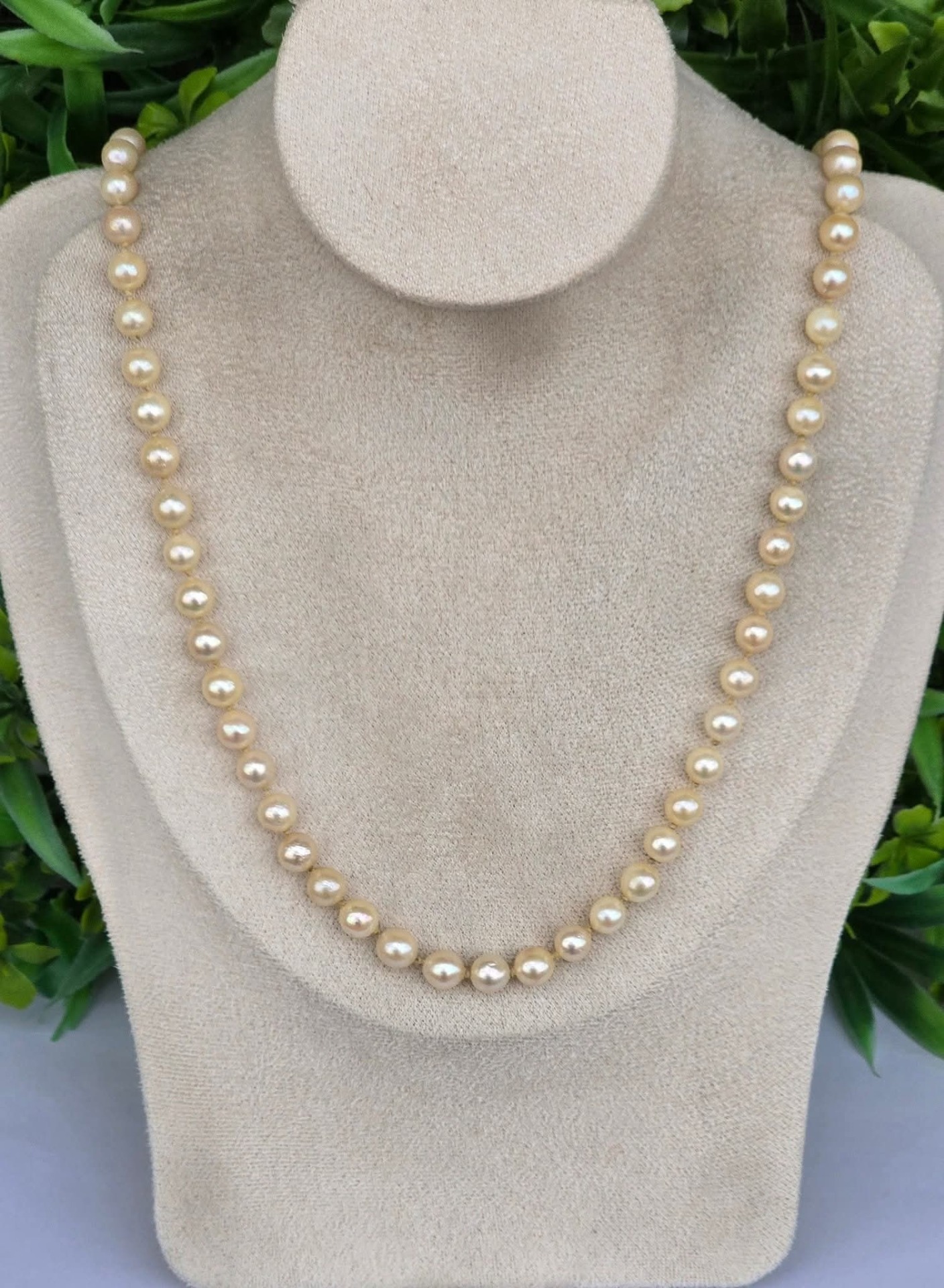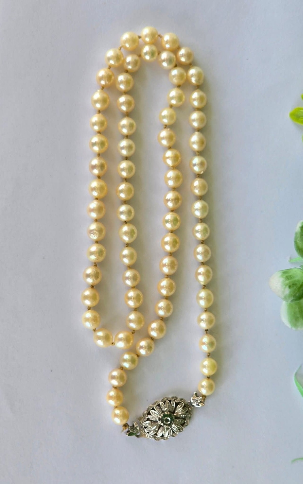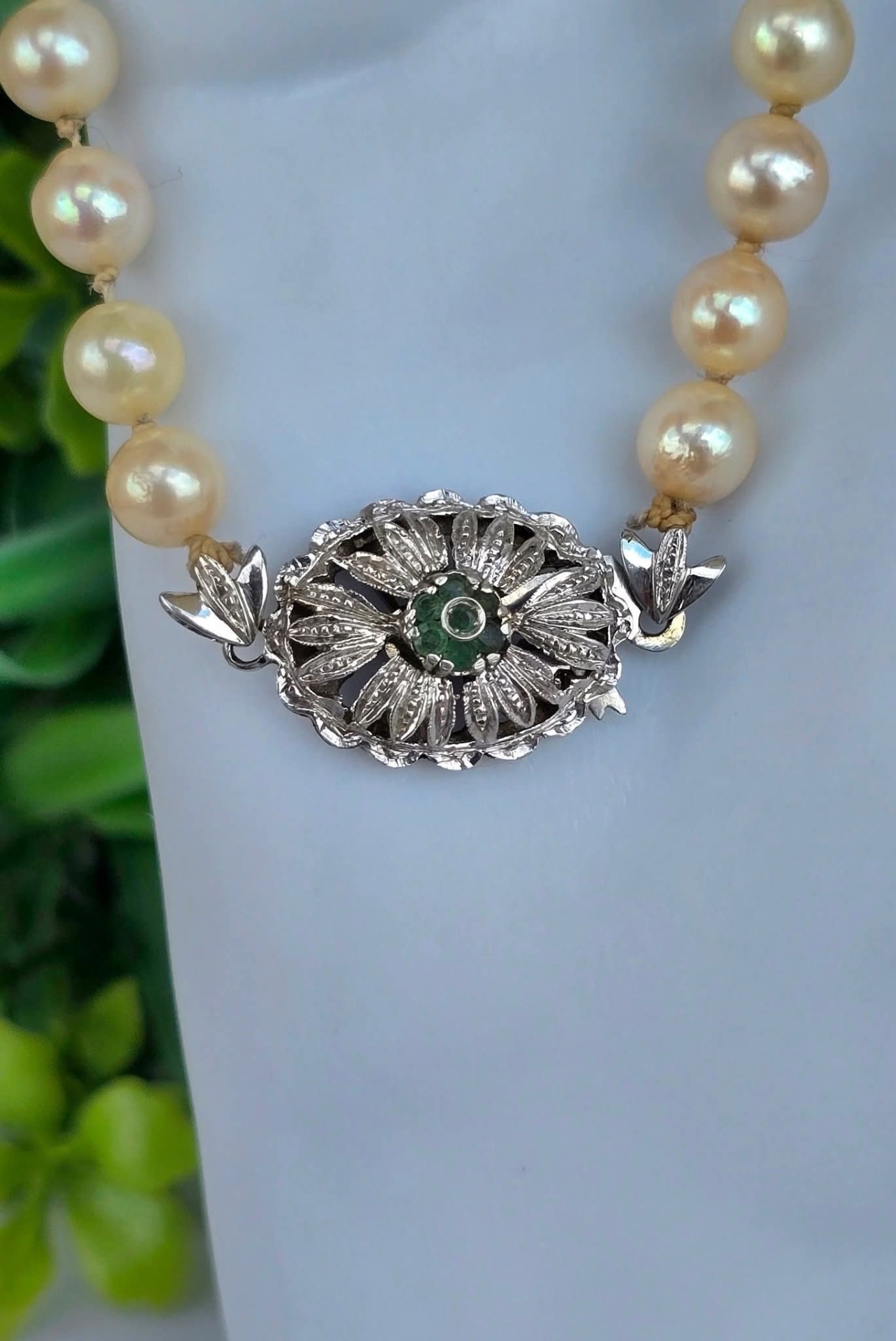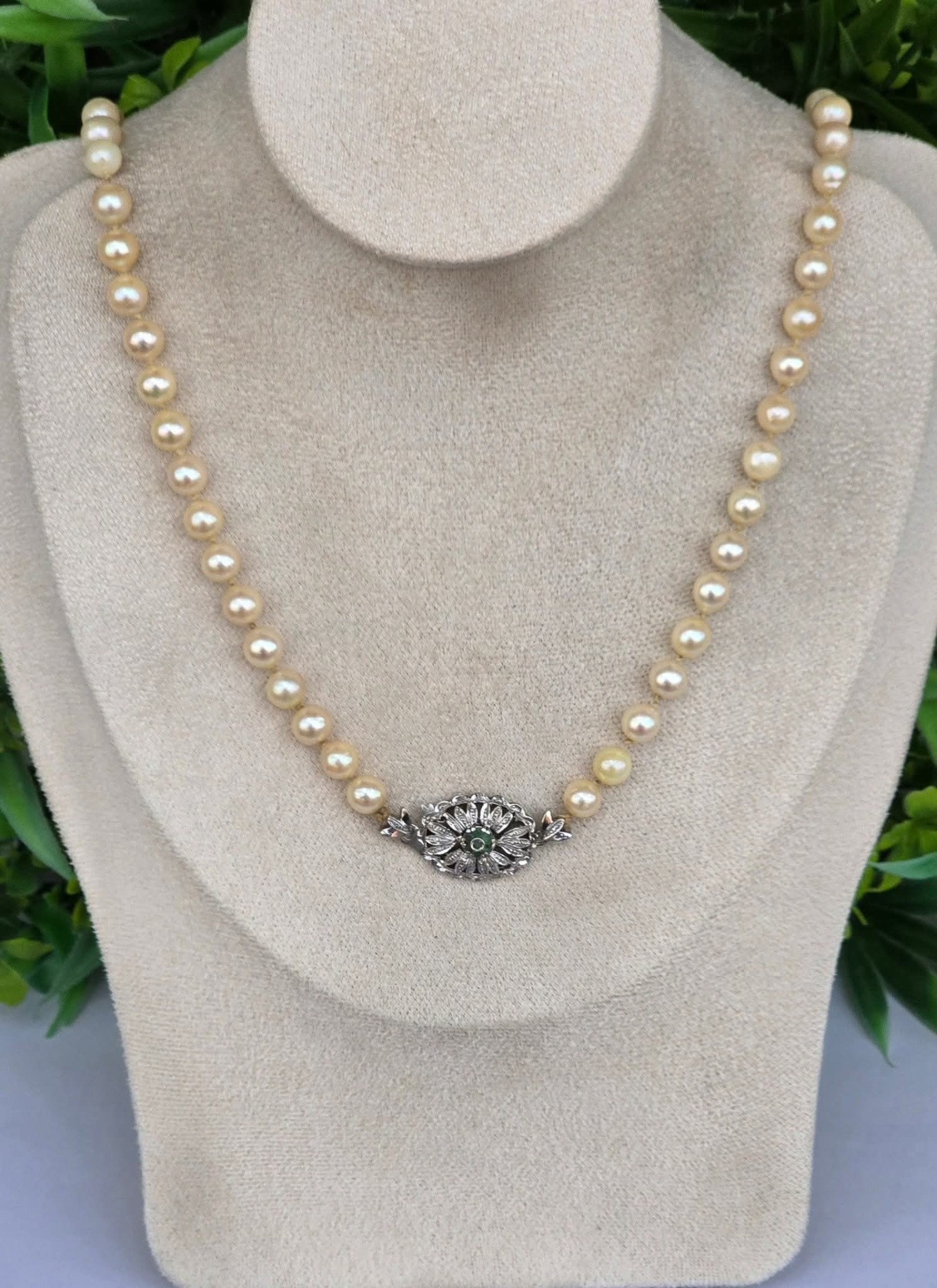 Colier vechi din 67 perle crem naturale de cultură, cu închizătoare din aur de 18K, decorată cu 7 smaralde naturale.