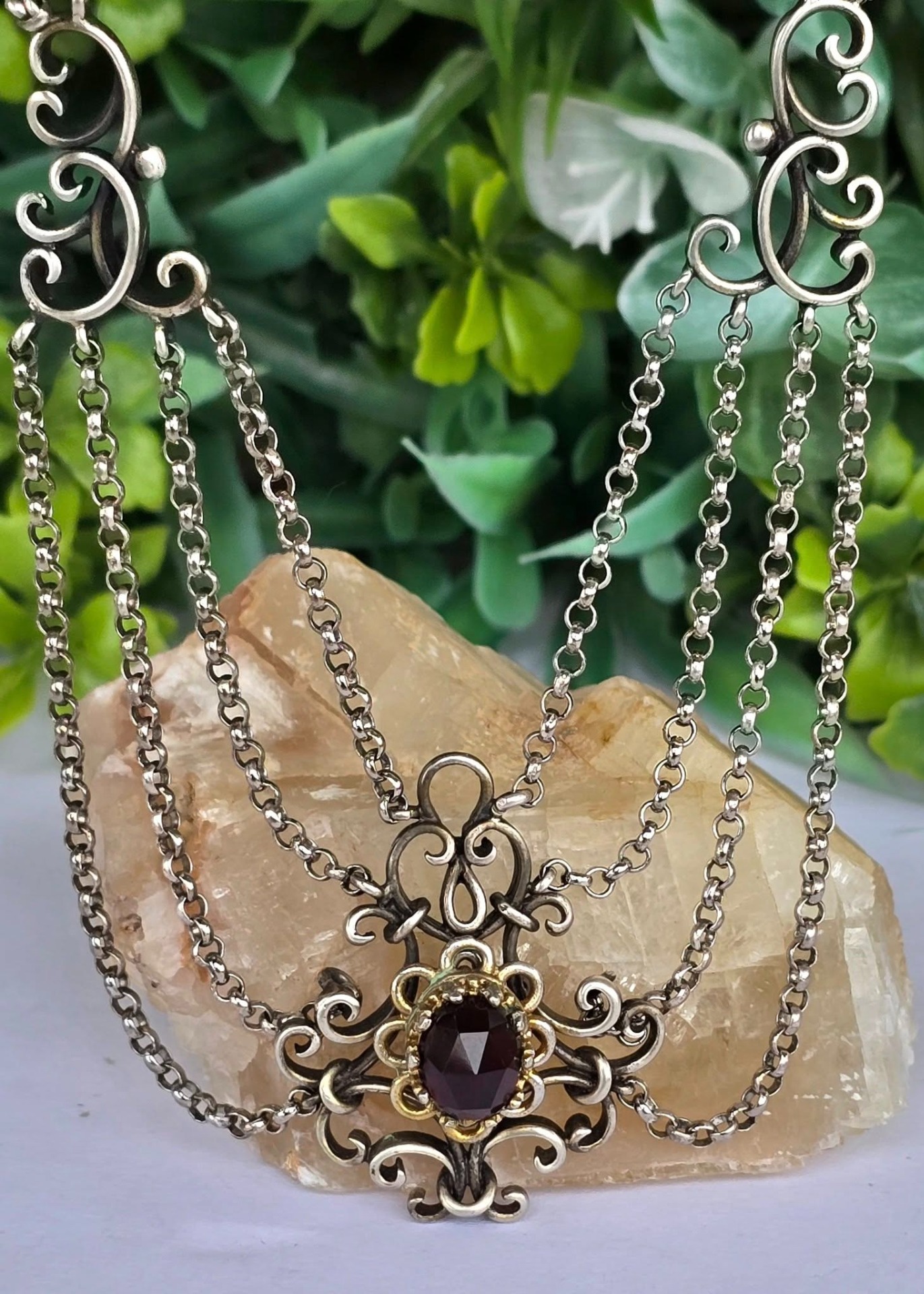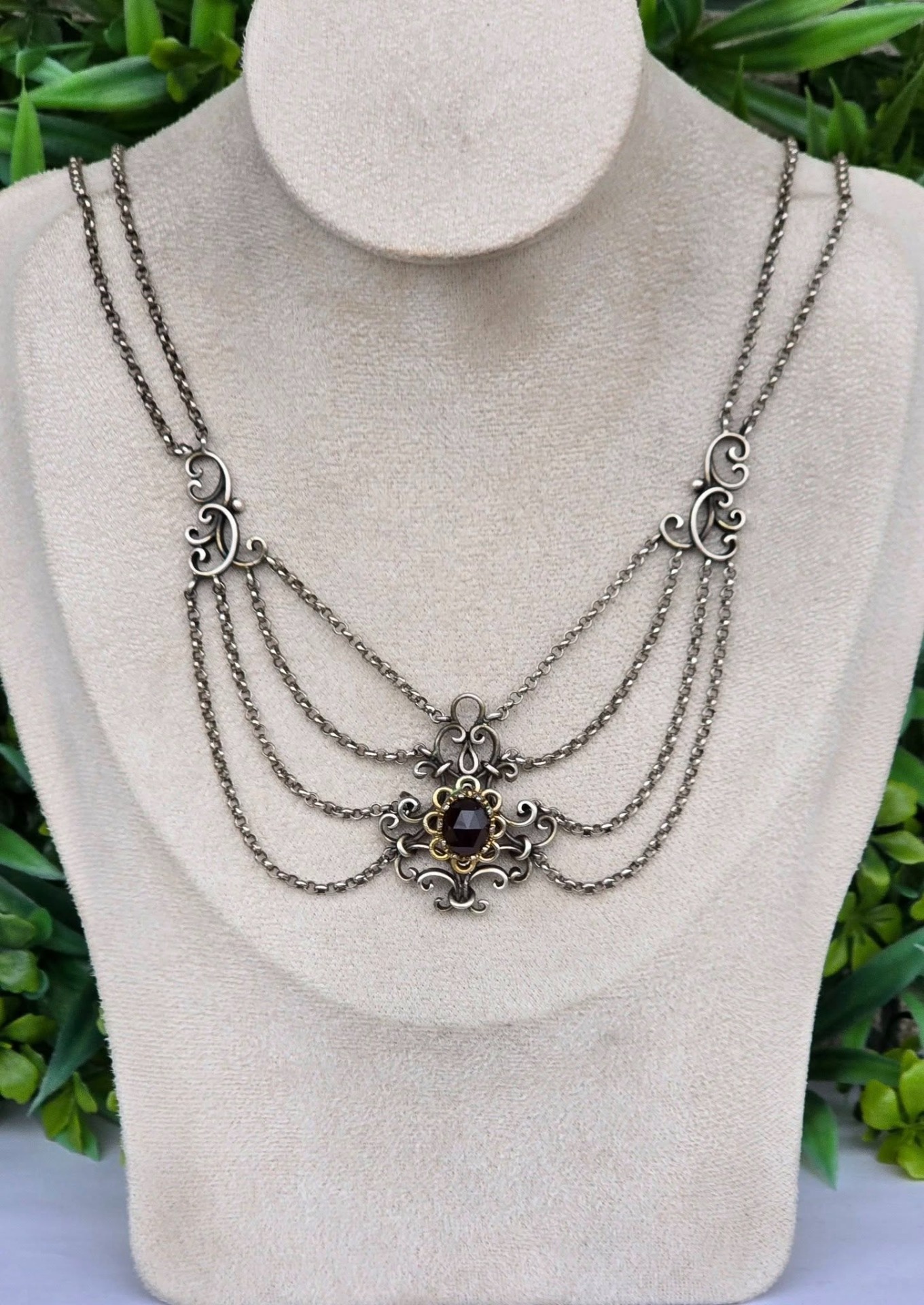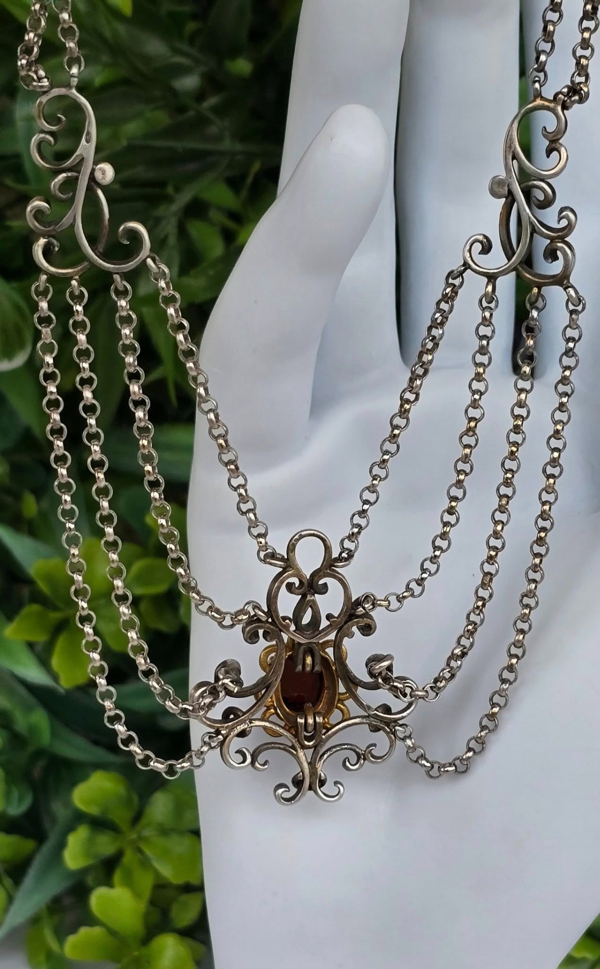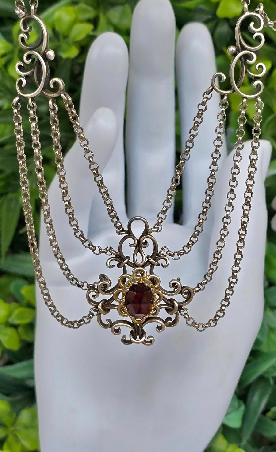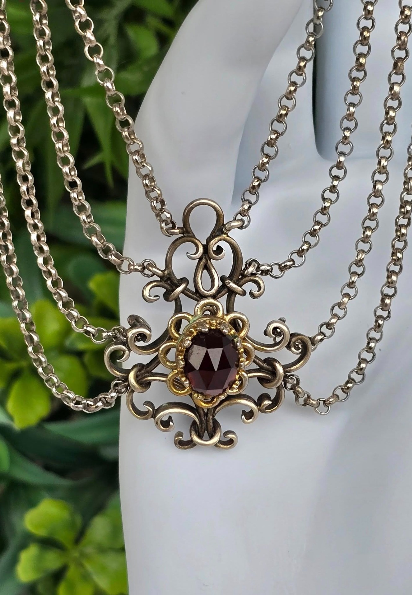 Colier vechi din argint, spectaculos, cu granat Bohemia natural și element aurit, manufactură de atelier austriac (anii 1930, Linz, Austria).