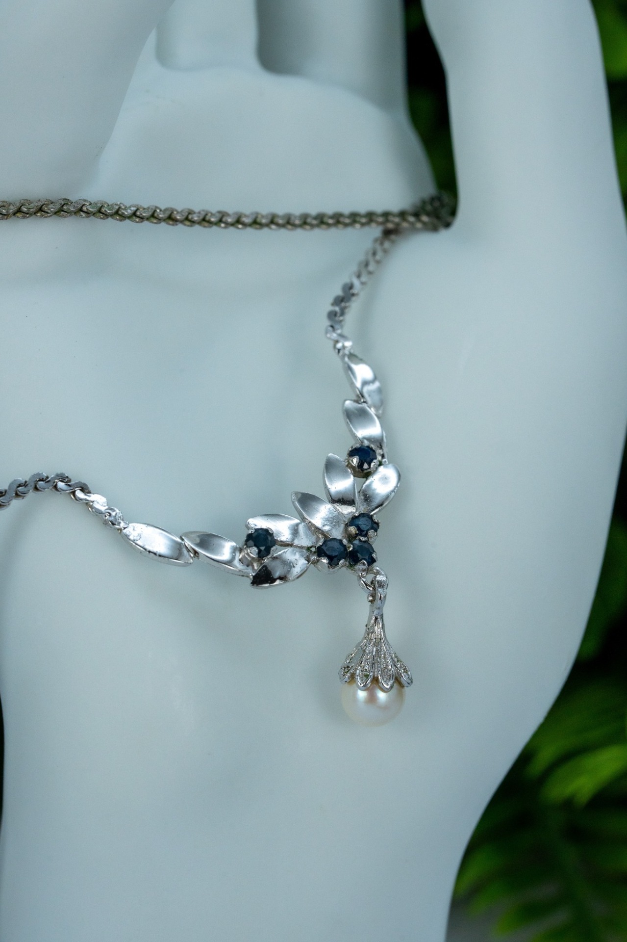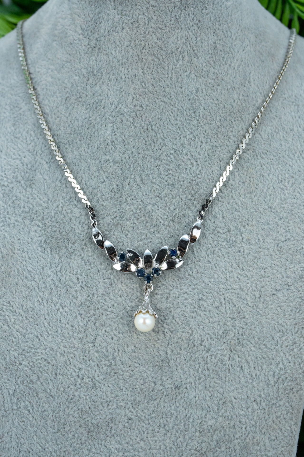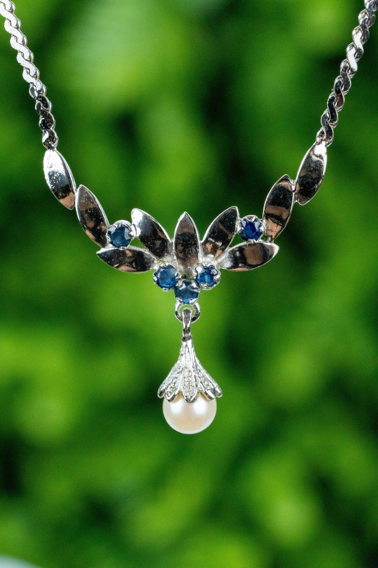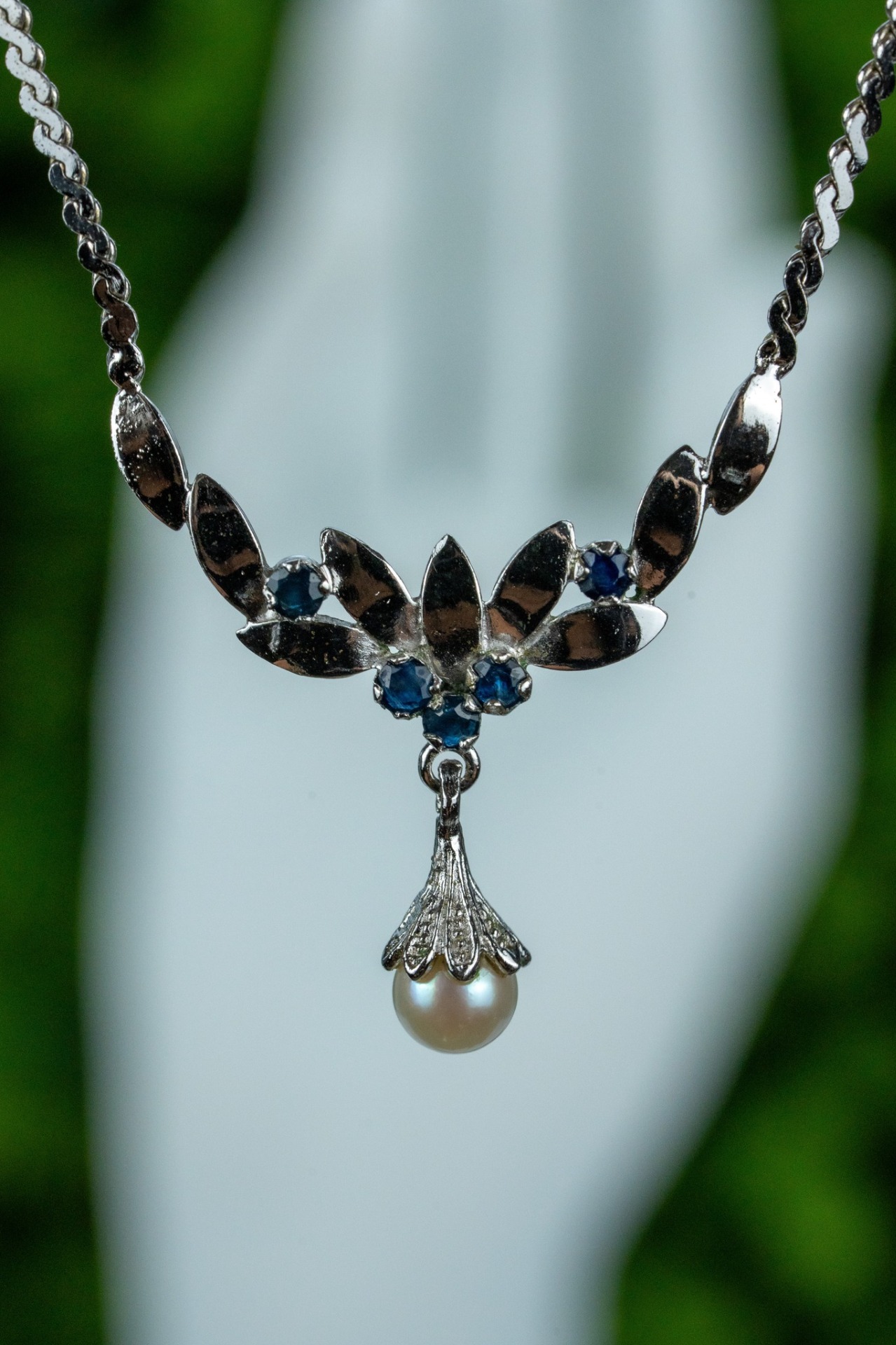 Colier vechi din argint rodiat, cu safire naturale și perlă naturală de cultură.