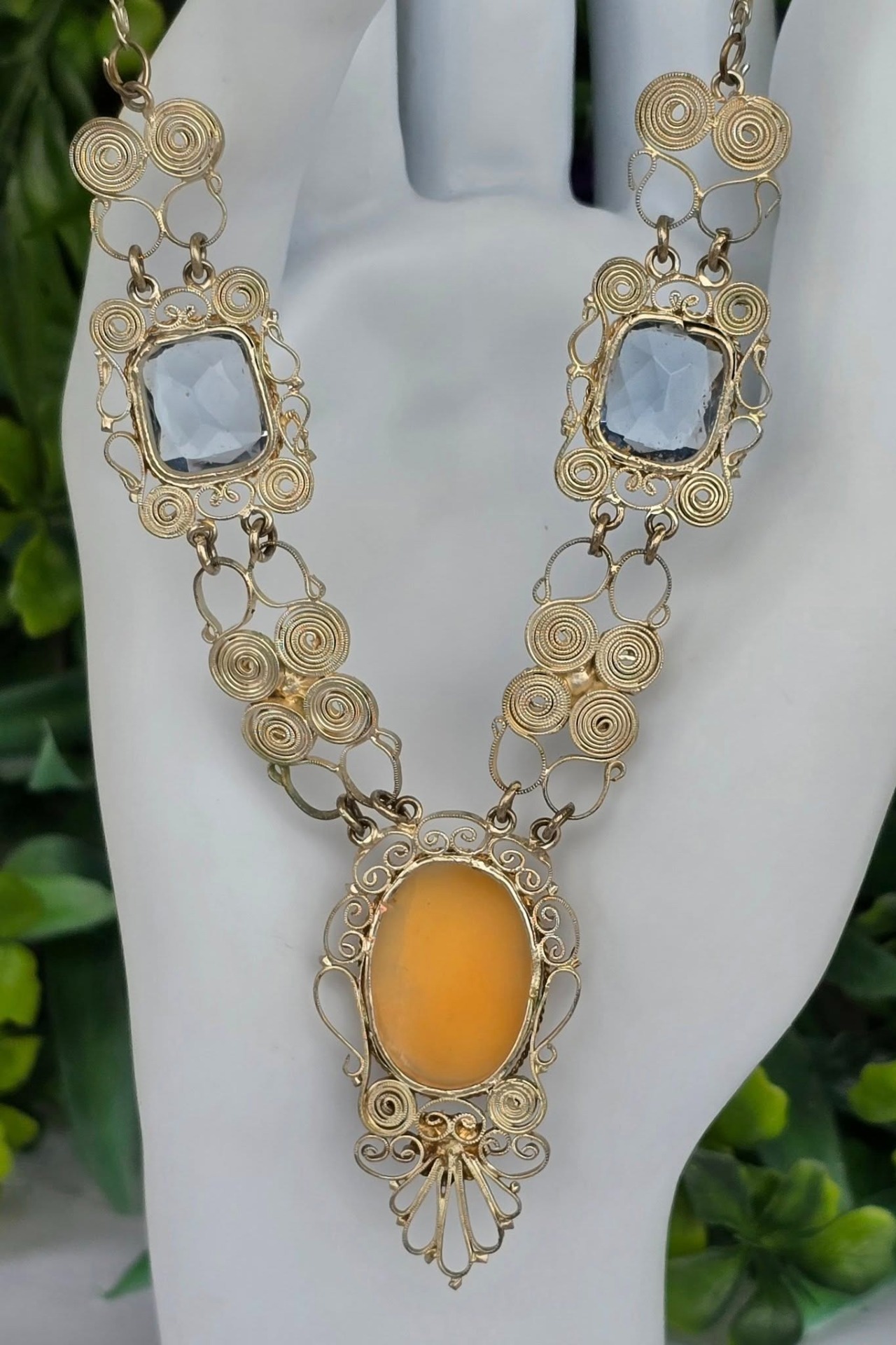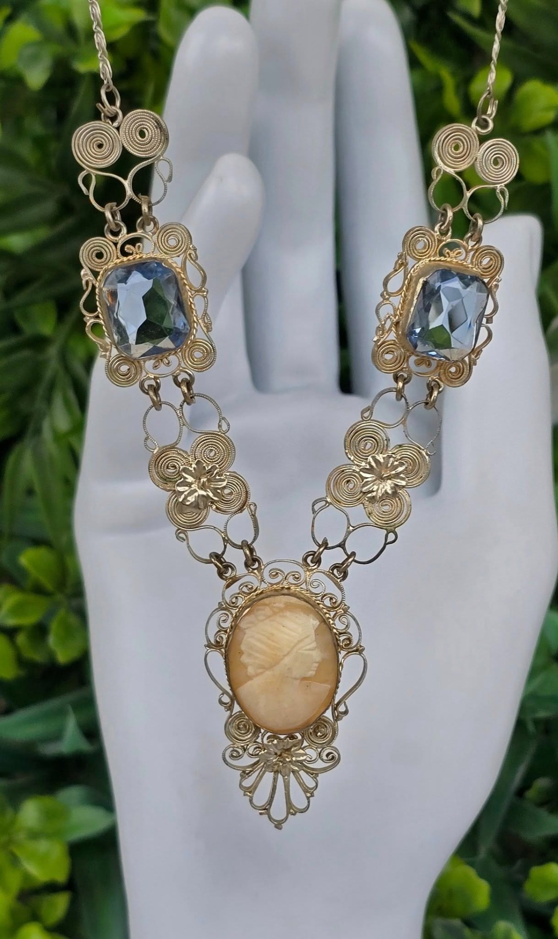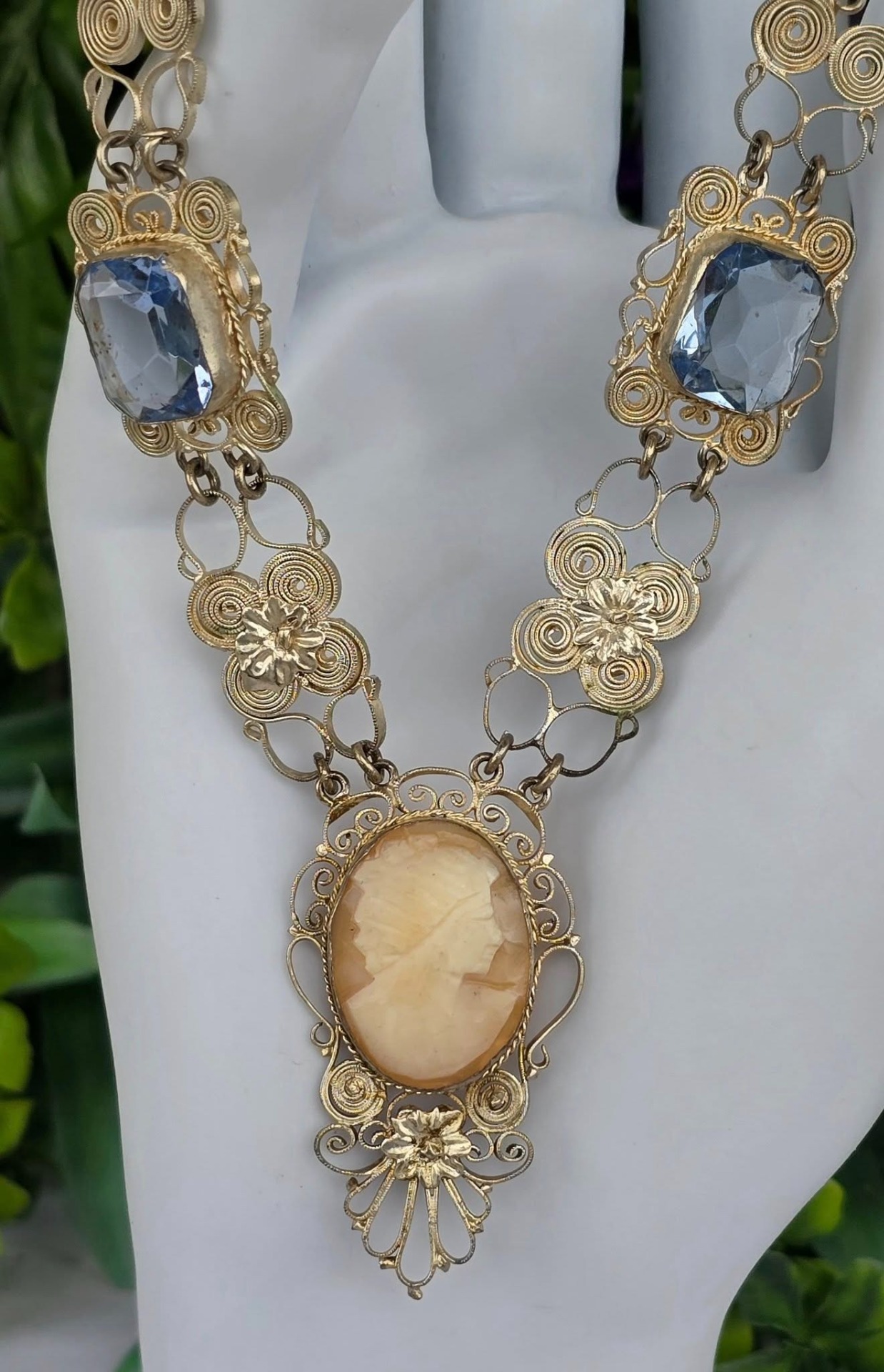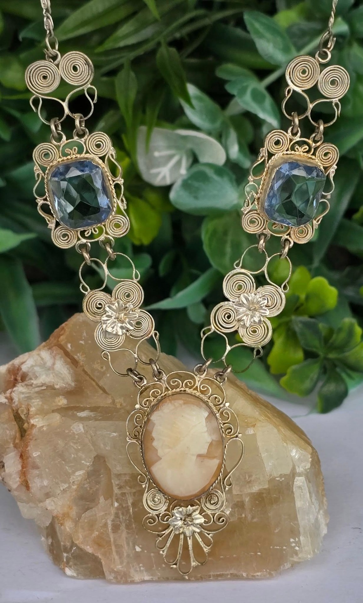 Colier vechi impresionant, din metal argintat, cu camee naturală și topaze "simulate", manufactură complexă în filigran.