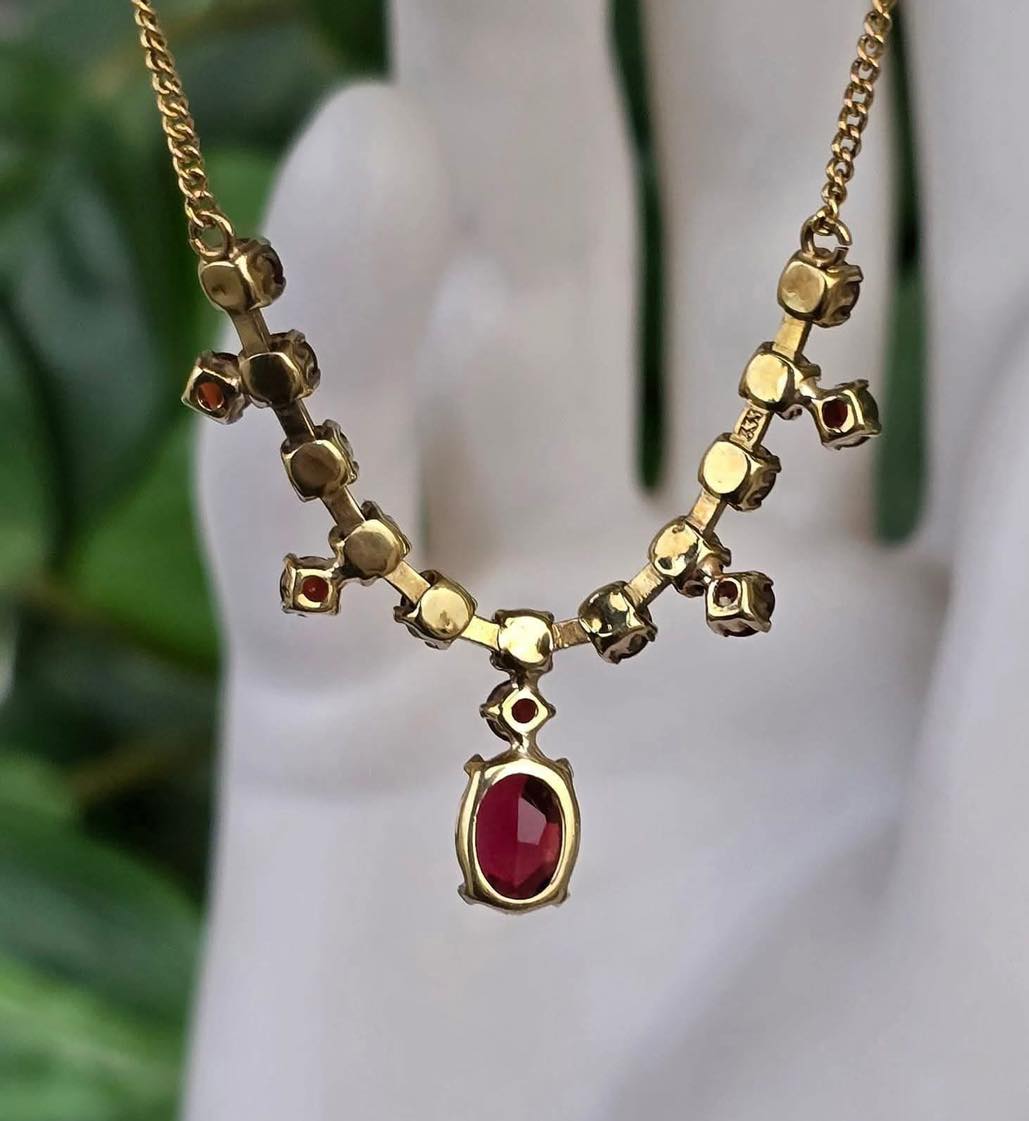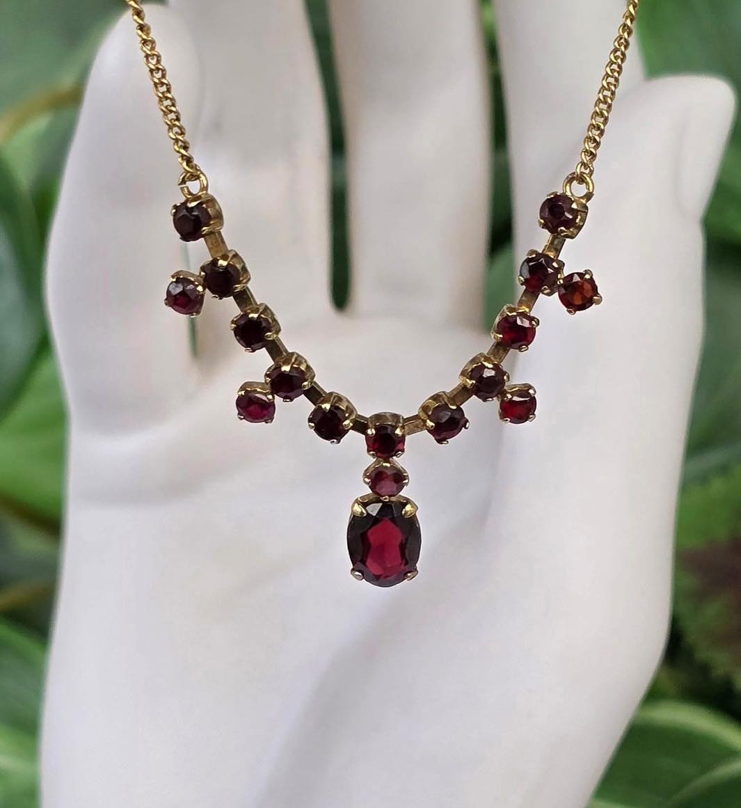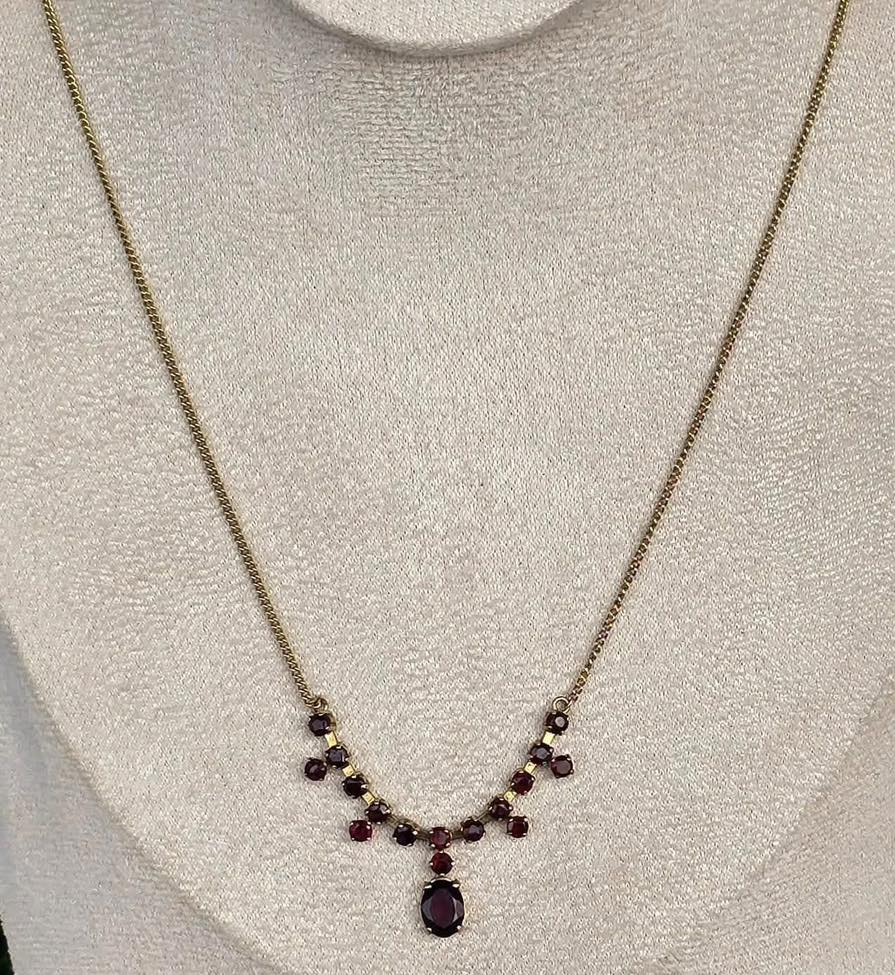 Colier vechi lung, din aur de 8K , cu 17 superbe granate Bohemia naturale.