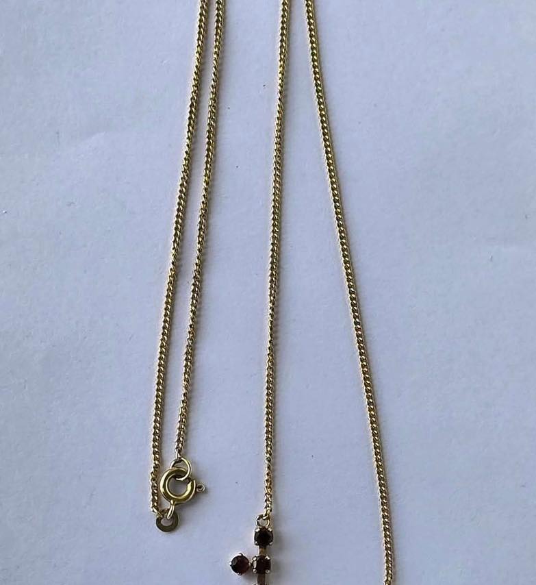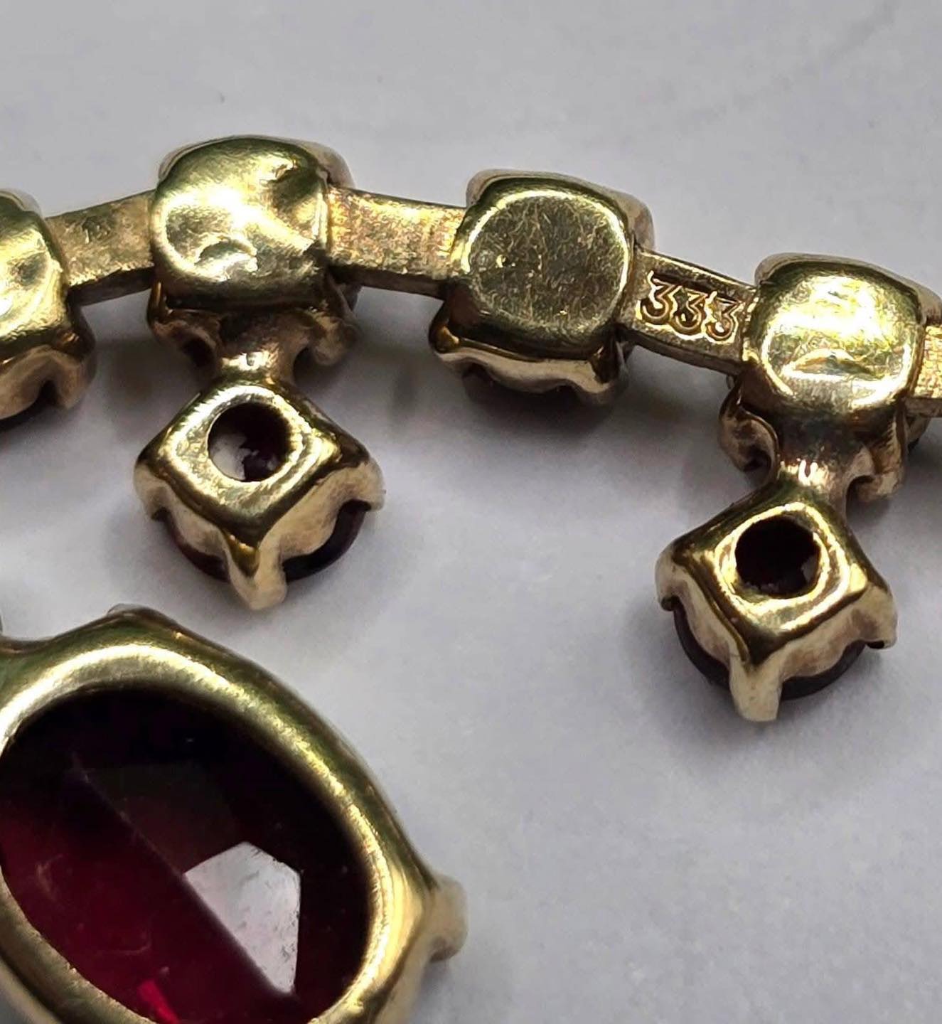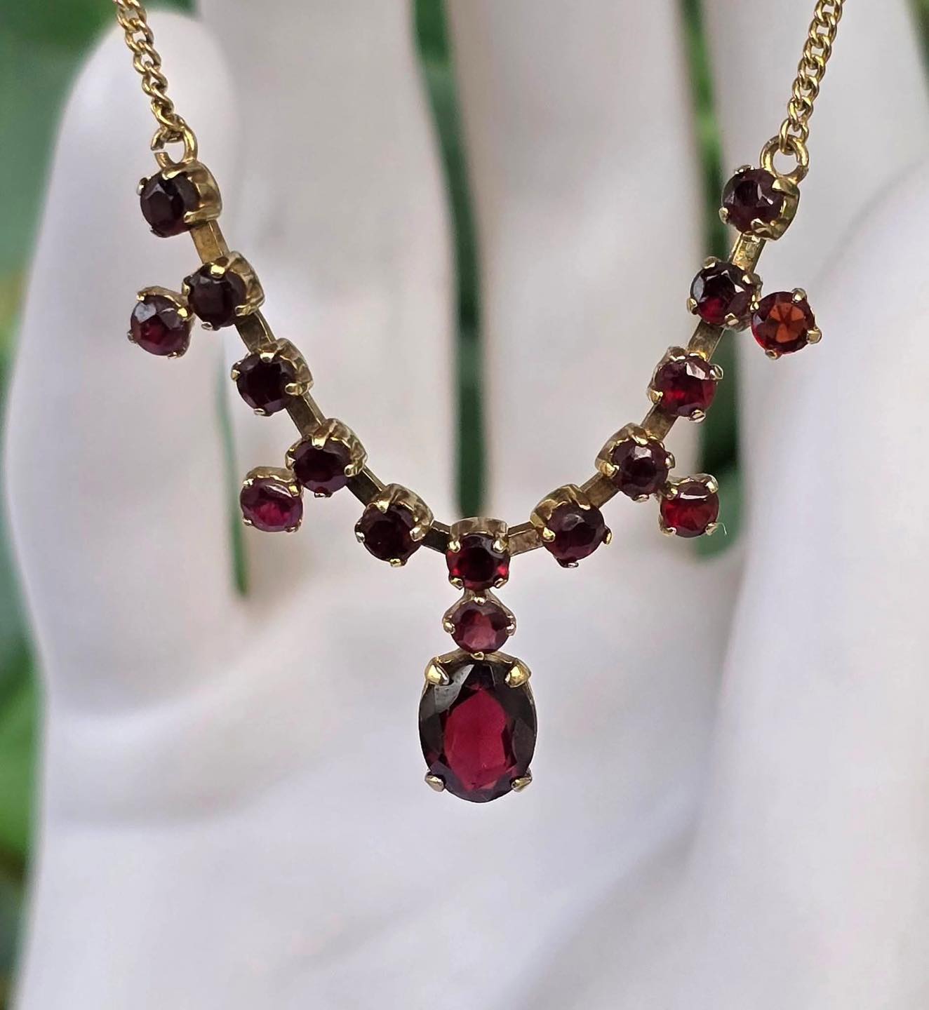 Colier vechi lung, din aur de 8K , cu 17 superbe granate Bohemia naturale.