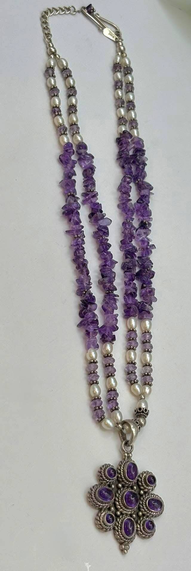 Colier vechi spectaculos, din argint, cu ametiste naturale și perle naturale de cultură (anii 1970-1980, India)