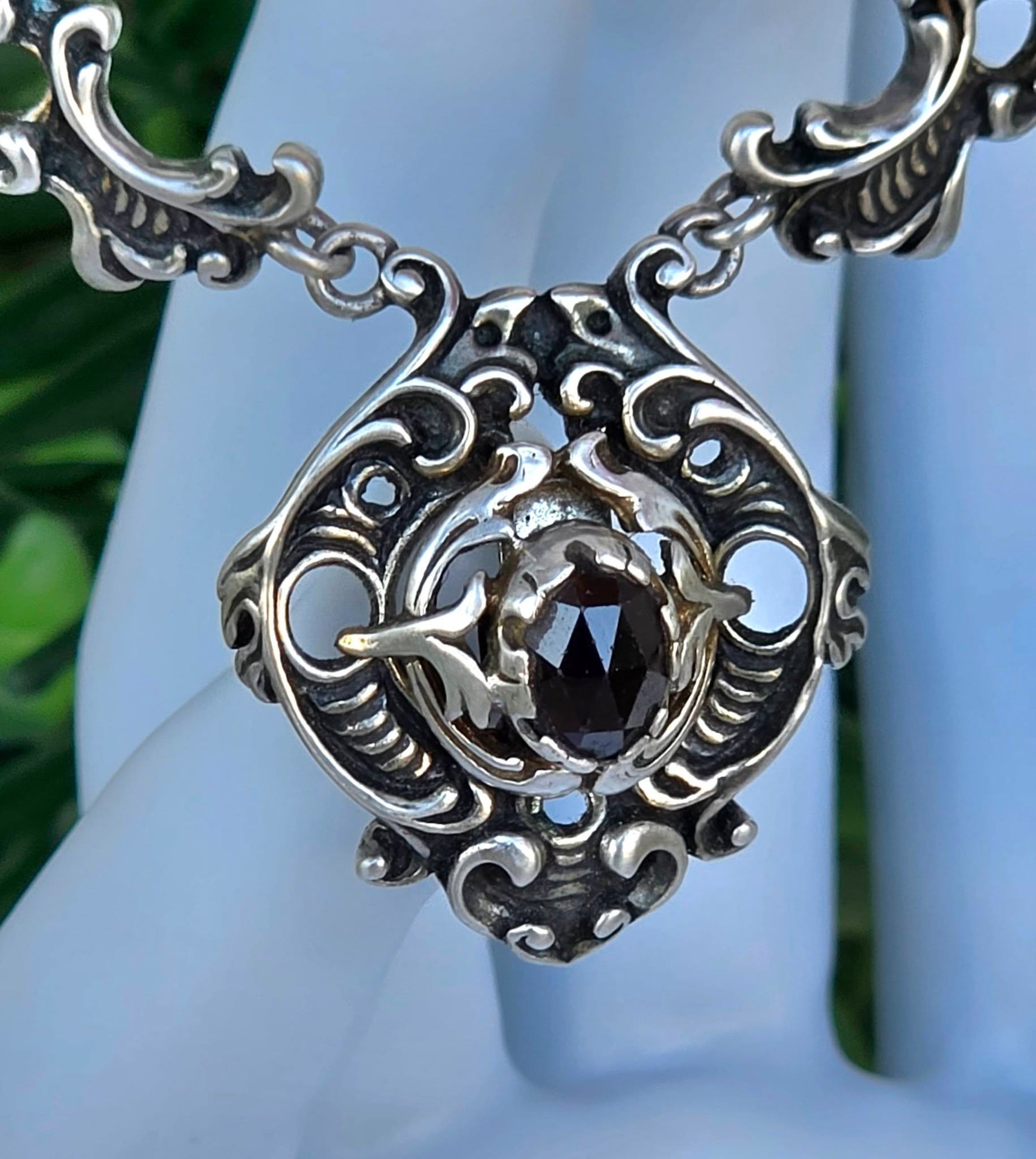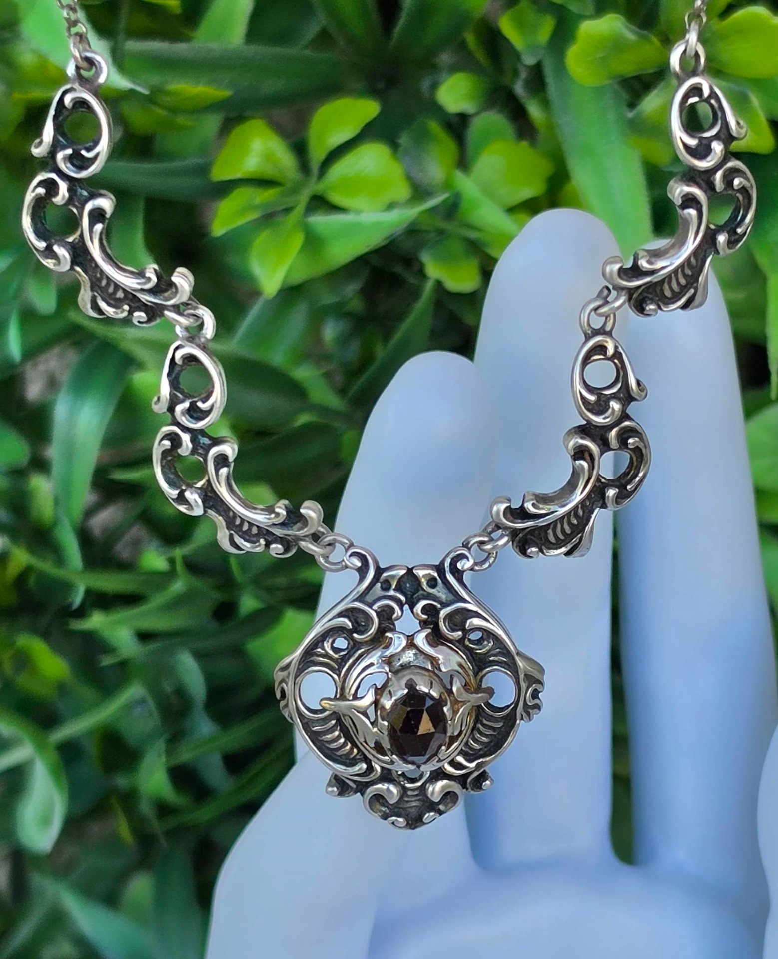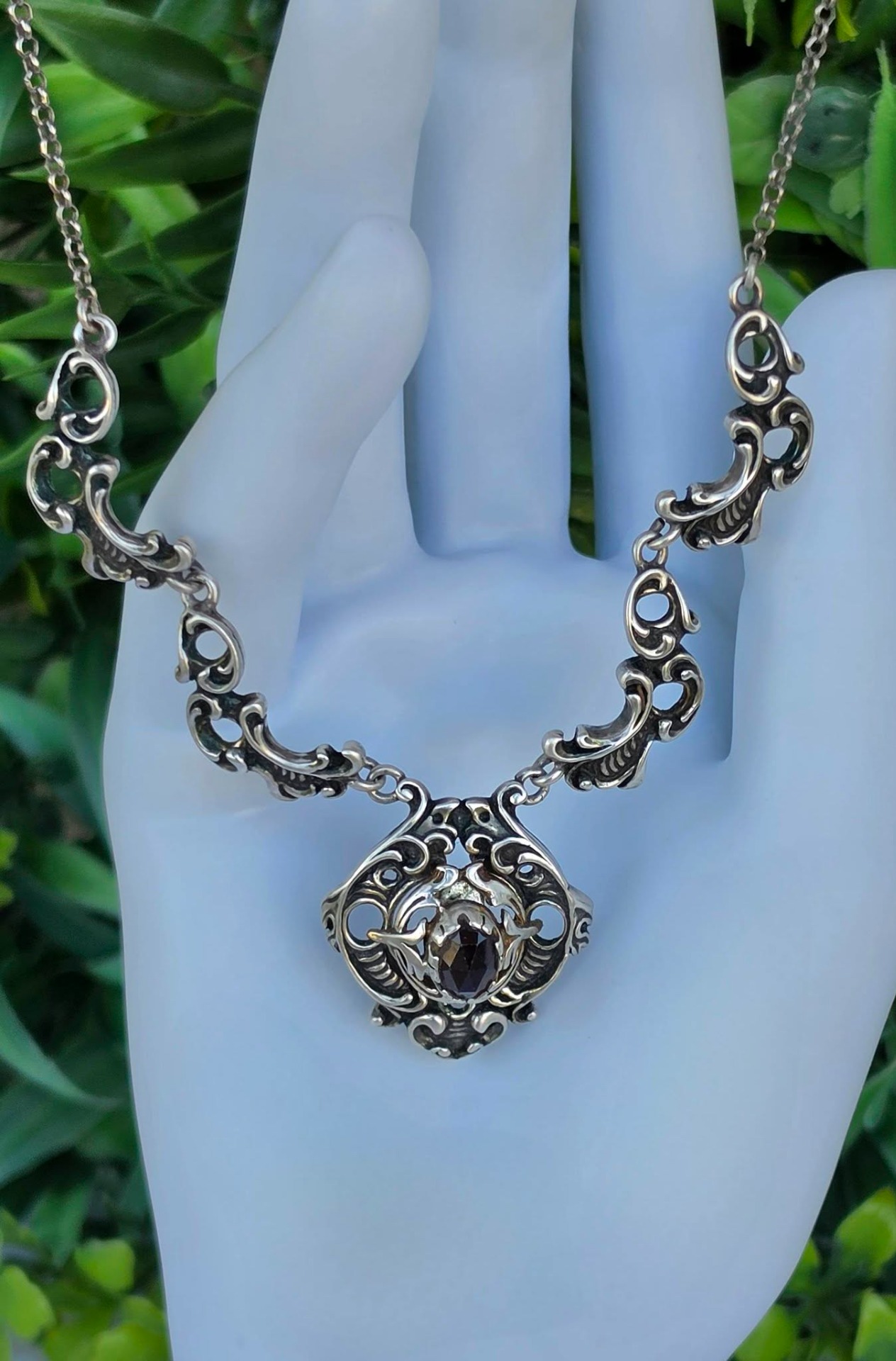 Colier vechi spectaculos, din argint, cu un superb granat Bohemia natural, manufactură excepțională de meșter austriac (anii 1920-1930, Austria).