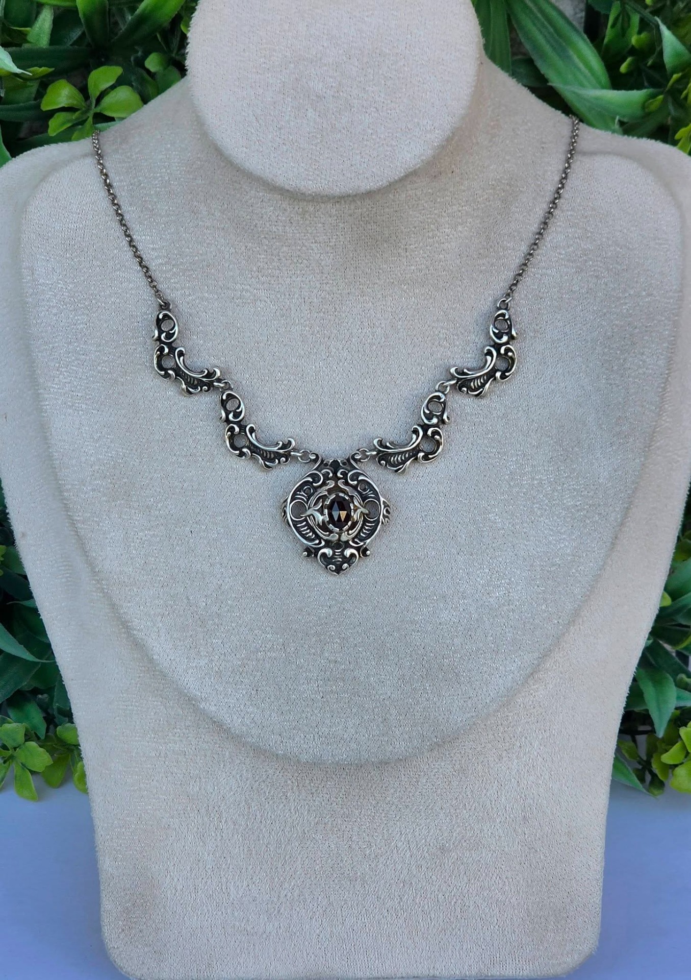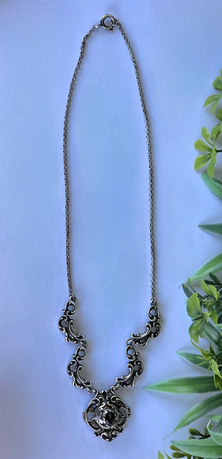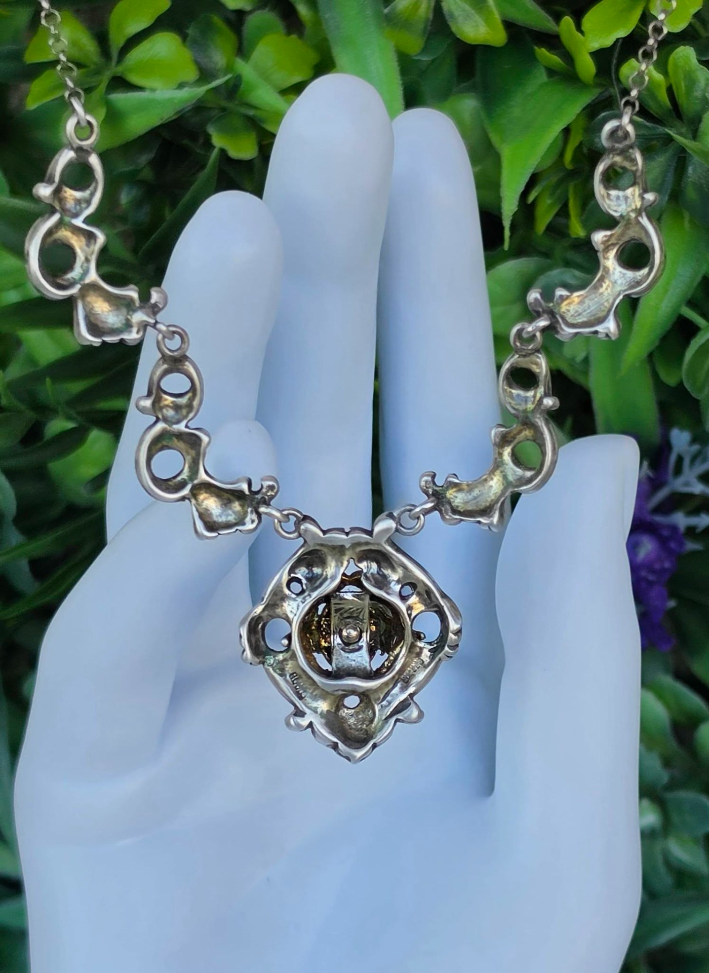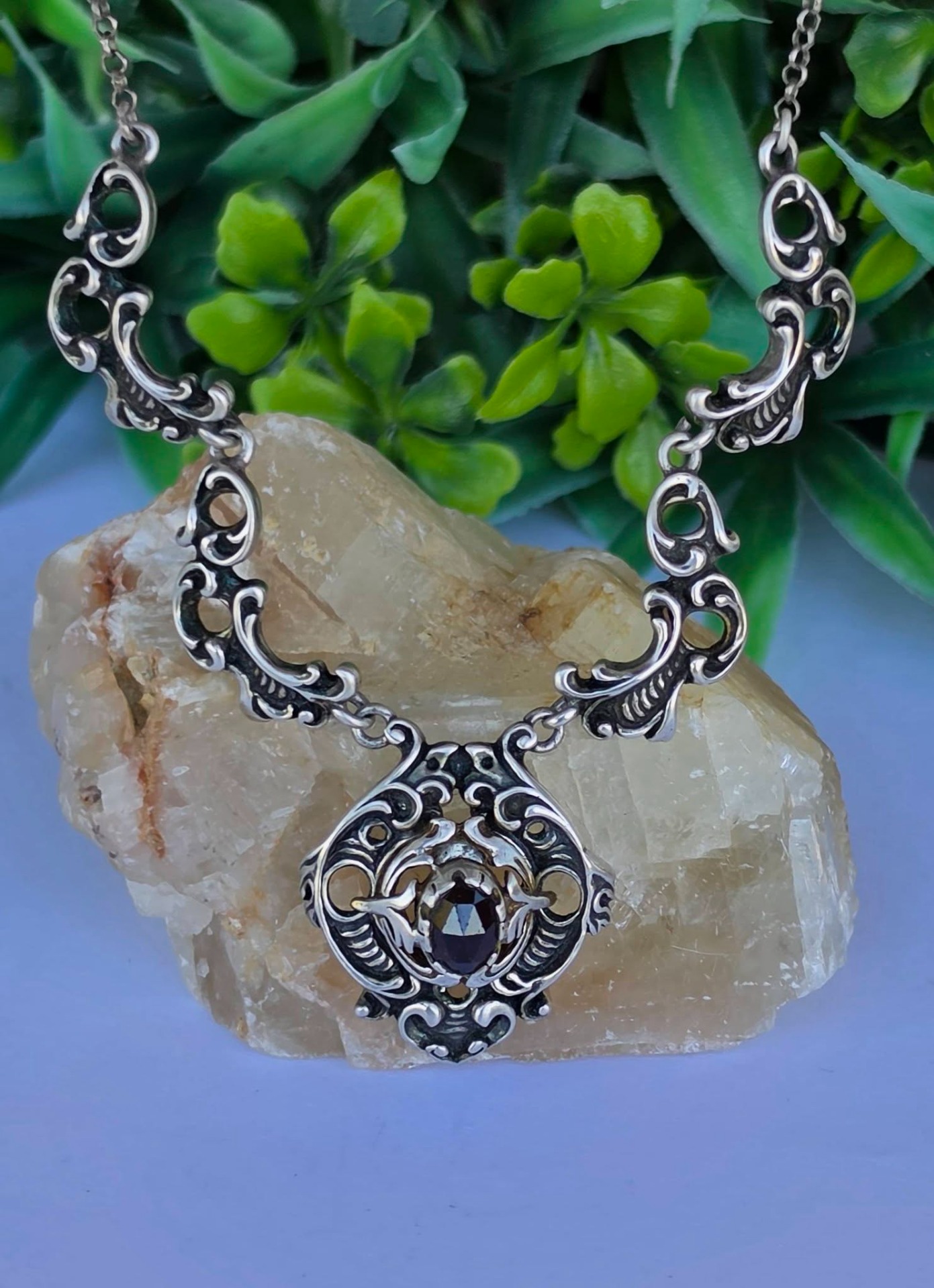 Colier vechi spectaculos, din argint, cu un superb granat Bohemia natural, manufactură excepțională de meșter austriac (anii 1920-1930, Austria).