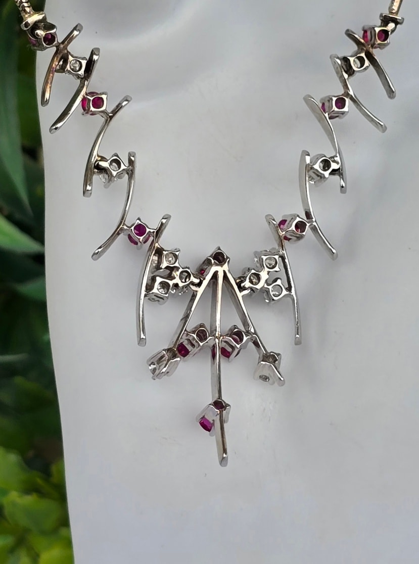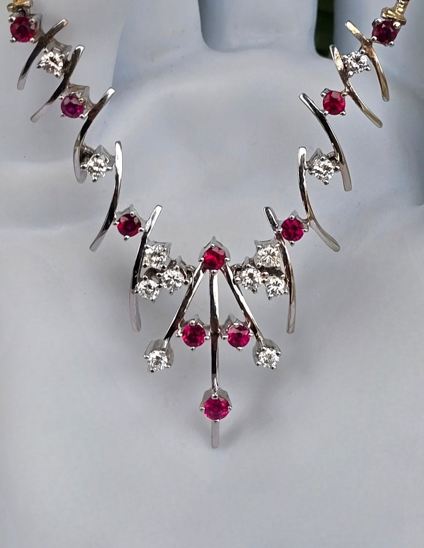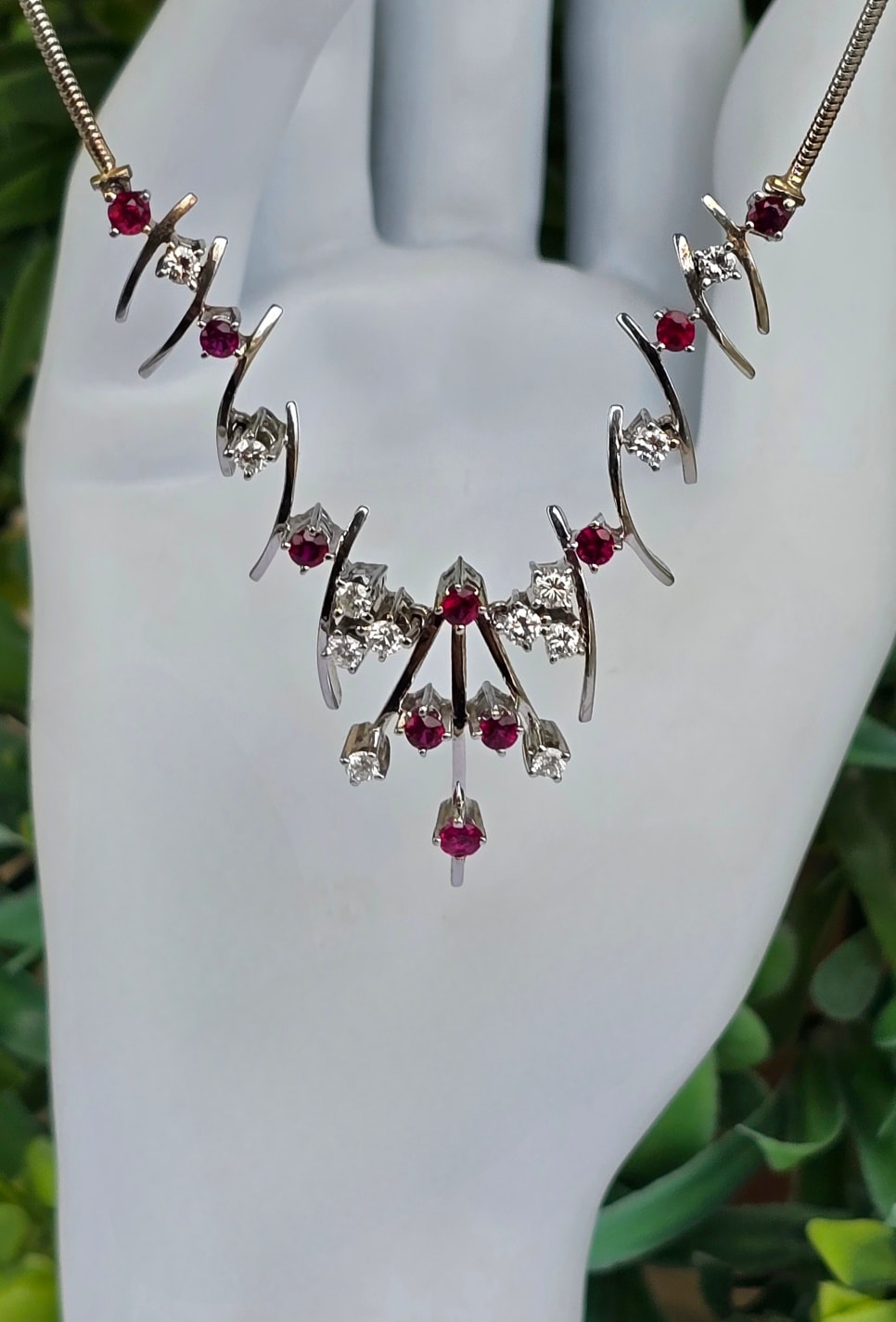 Colier vechi spectaculos, din aur de 14K, cu 10 rubine și 12 diamante (0.75ct) naturale de calitate superioară.